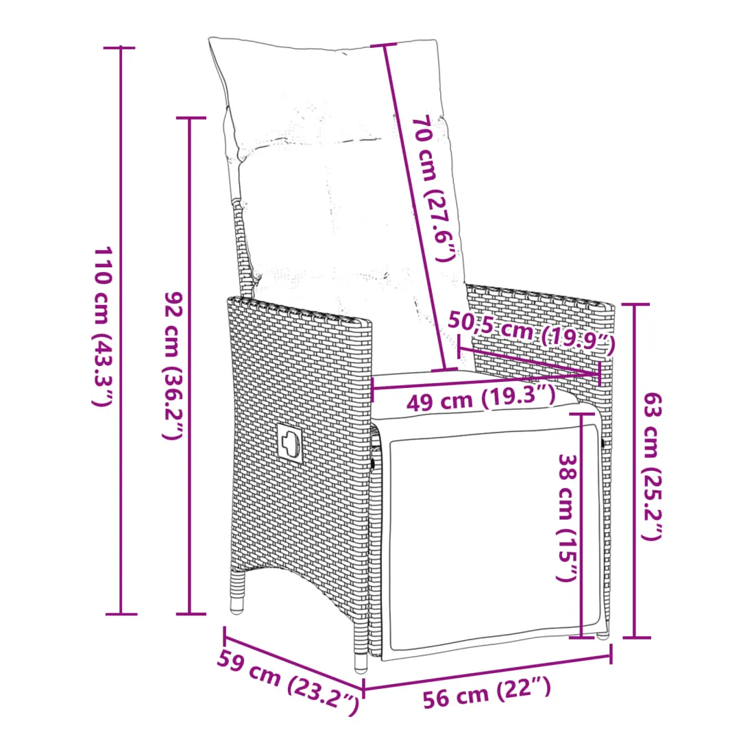 - Dimensions assise : 56 x Dimensions en position couchée : 59 x 92 cm (l x P x H)