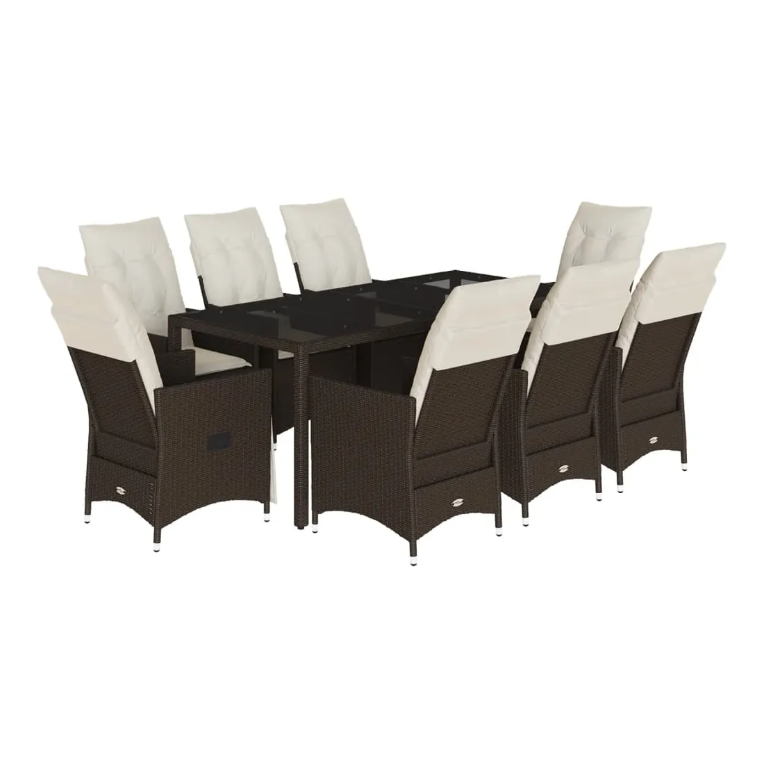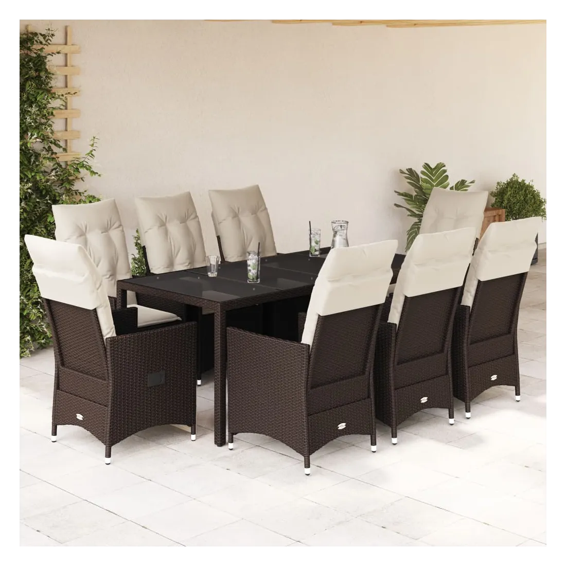 Cet ensemble de salle à manger de jardin est un excellent choix pour les repas en plein air ou simplement pour se détendre dans le jardin, la cour arrière ou sur la terrasse. Matériau durable : le rotin PE, également appelé polyrotin, est un matériau synthétique solide et facile d'entretien qui ressemble au rotin naturel. Il est léger, facile à nettoyer et couramment utilisé pour les meubles d'extérieur en raison de sa durabilité et de sa résistance aux intempéries. Dossier réglable : ce siège de jardin est équipé d'une poignée. Vous pouvez régler le dossier dans n'importe quelle position en tirant sur la poignée, puis le remettre rapidement dans sa position d'origine. Plateau en verre : le plateau de la table d'extérieur est en verre trempé solide et durable, ce qui le rend facile à nettoyer avec un chiffon humide et ajoute une touche d'élégance à votre espace extérieur. Assise confortable : cet ensemble de mobilier d'extérieur, doté de coussins épais et rembourrés, offre une assise confortable. Housse amovible et lavable : ces coussins d'assise sont dotés de housses amovibles pour faciliter le lavage et l'entretien. Les coussins de dossier sont munis d'un rabat à l'arrière pour faciliter leur fixation aux dossiers. Bon à savoir :Pour que votre mobilier d'extérieur reste beau, nous vous recommandons de le protéger avec une housse imperméable.