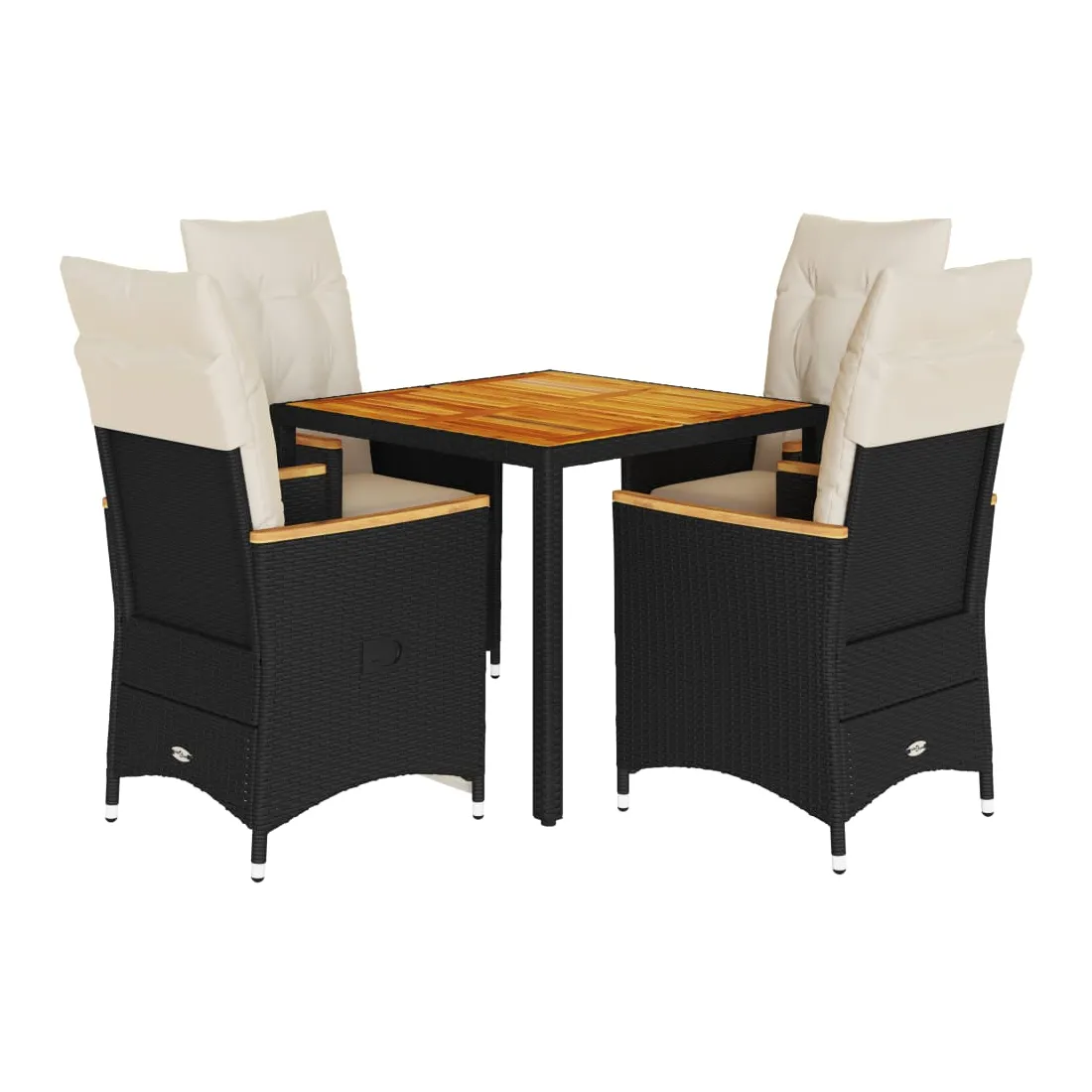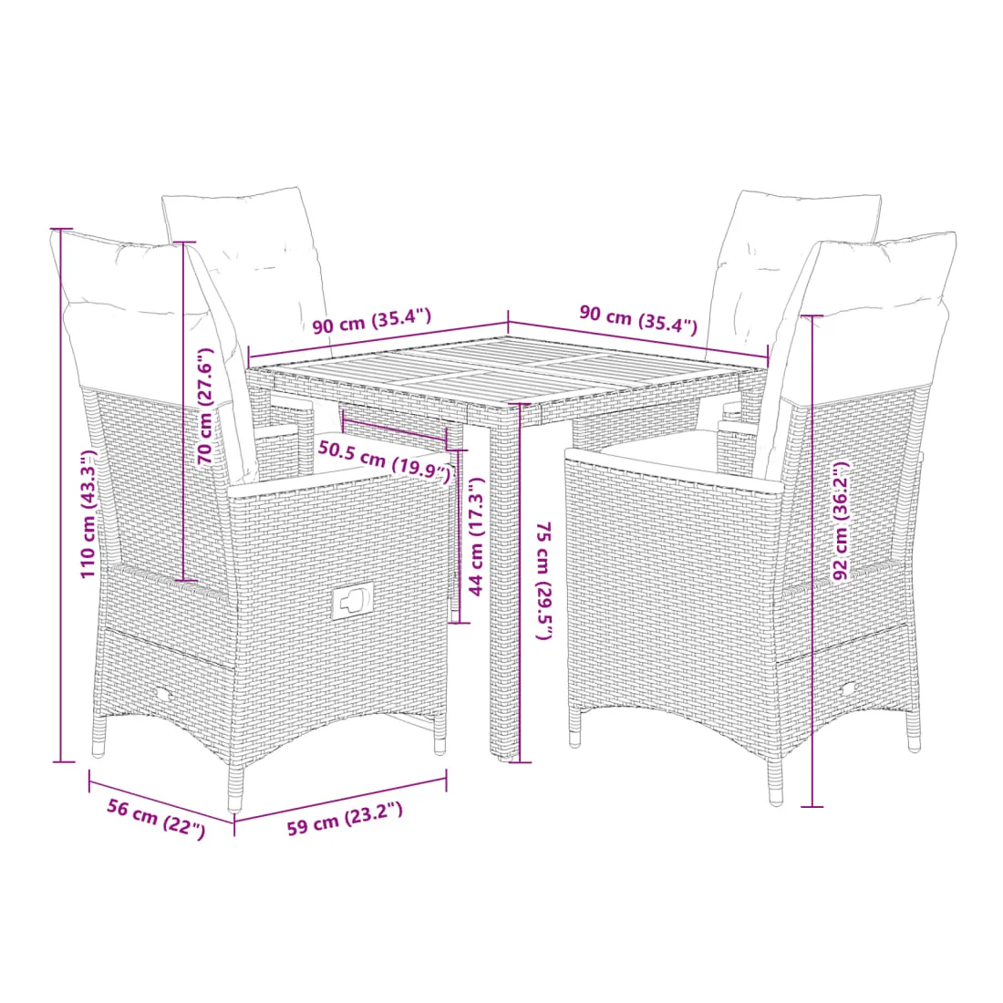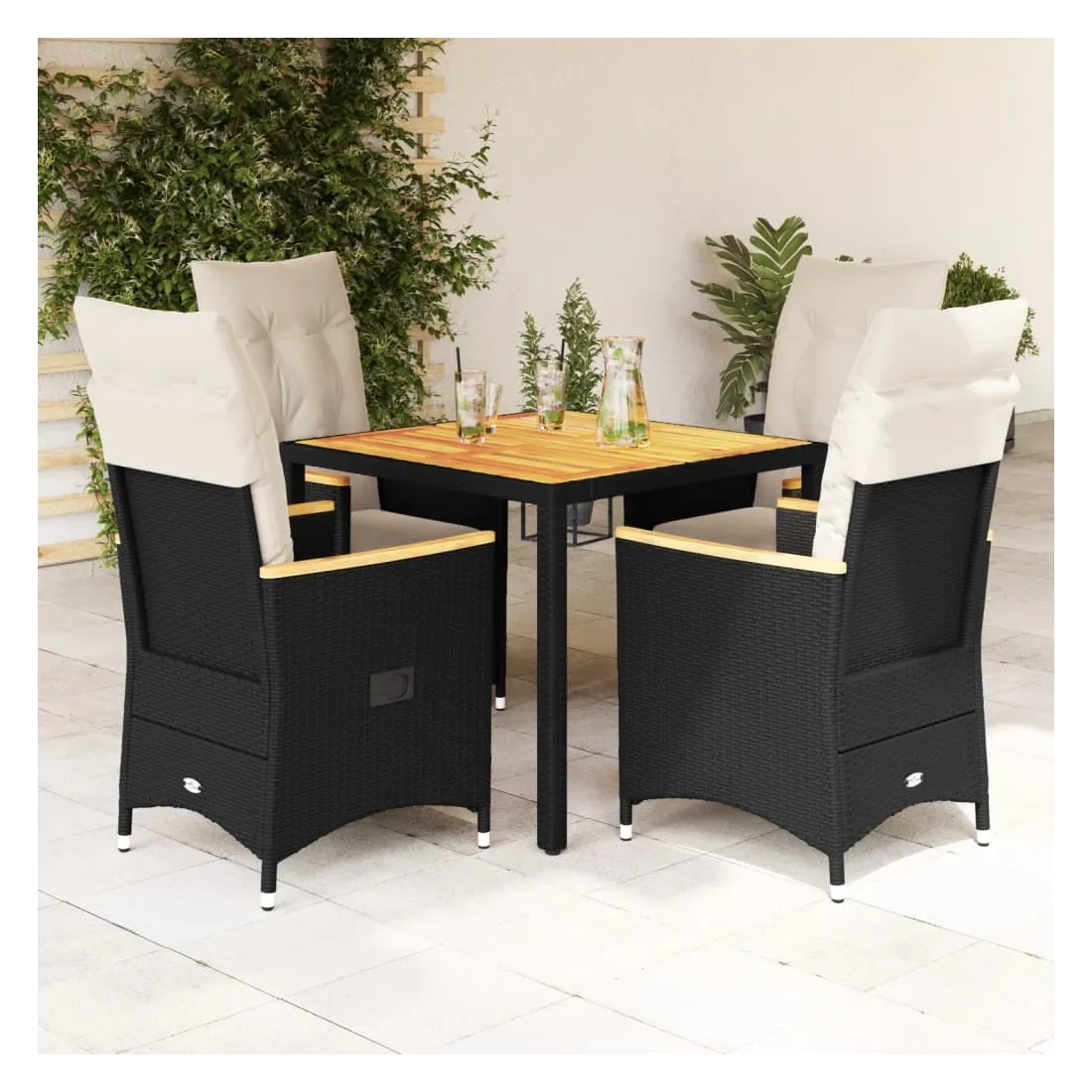 Cet ensemble de salle à manger de jardin est un excellent choix pour les repas en plein air ou simplement pour se détendre dans le jardin, la cour arrière ou sur la terrasse. Matériau durable : le rotin PE, également appelé polyrotin, est un matériau synthétique solide et facile d'entretien qui ressemble au rotin naturel. Il est léger, facile à nettoyer et couramment utilisé pour les meubles d'extérieur en raison de sa durabilité et de sa résistance aux intempéries. Dossier réglable : ce siège de jardin est équipé d'une poignée. Vous pouvez régler le dossier dans n'importe quelle position en tirant sur la poignée, puis le remettre rapidement dans sa position d'origine. Plateau stable et facile à nettoyer : cette table de jardin est dotée d'un plateau en bois d'acacia robuste, durable et facile à nettoyer avec un chiffon humide. Assise confortable : cet ensemble de mobilier d'extérieur, doté de coussins épais et rembourrés, offre une assise confortable. Housse amovible et lavable : ces coussins d'assise sont dotés de housses amovibles pour faciliter le lavage et l'entretien. Les coussins de dossier sont dotés d'un rabat à l'arrière pour faciliter leur fixation aux dossiers. Bon à savoir :Pour que votre mobilier d'extérieur reste beau, nous vous recommandons de le protéger avec une housse imperméable.
