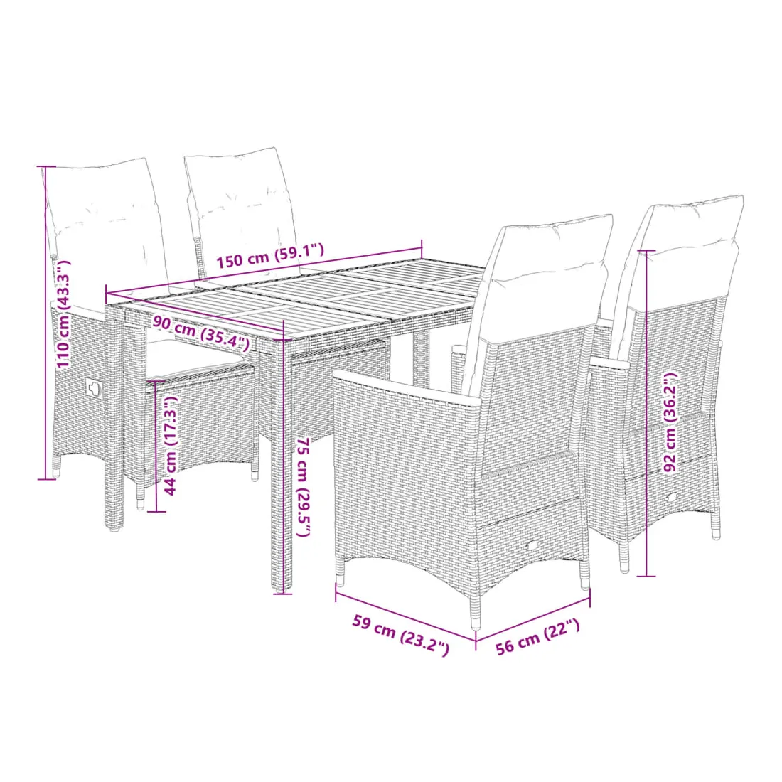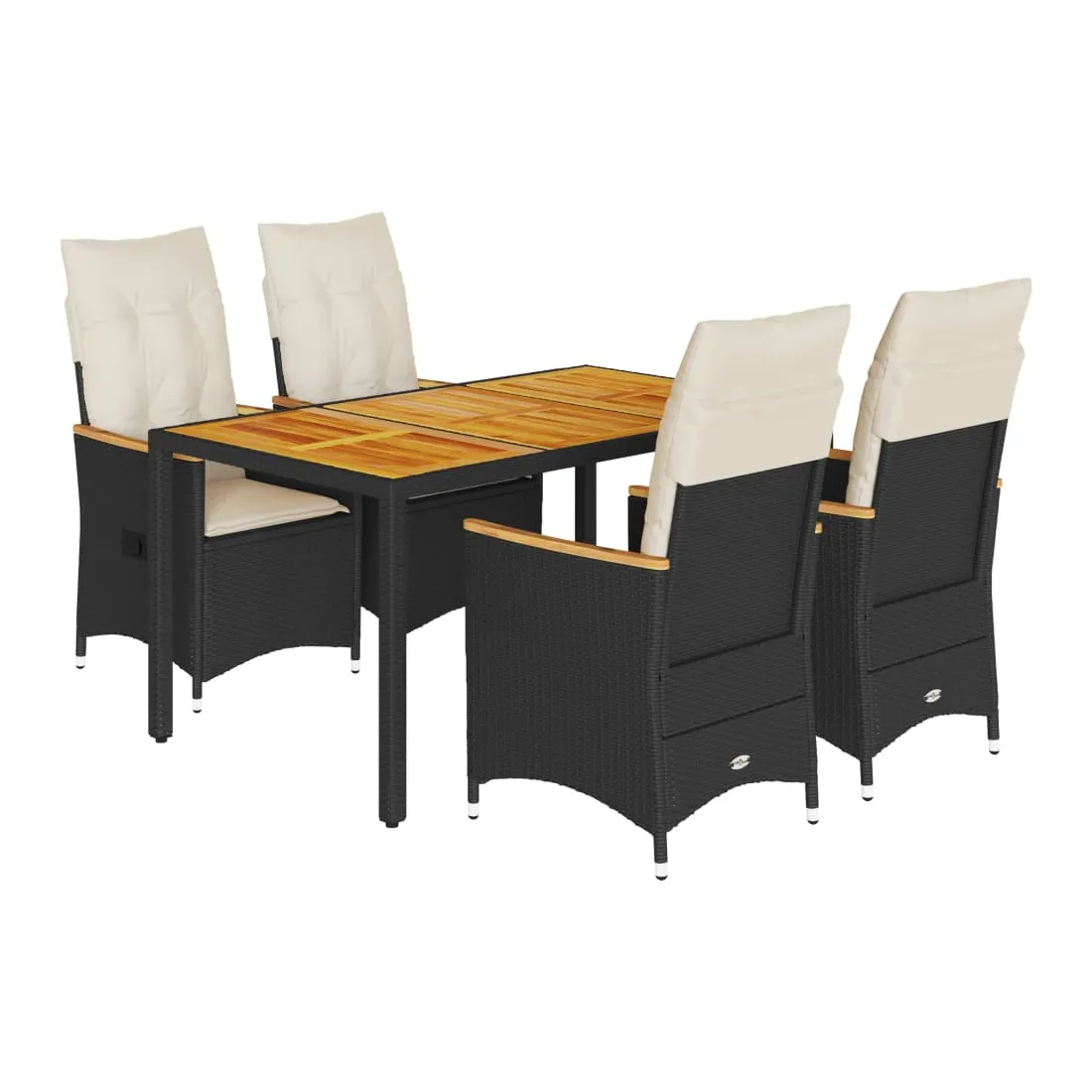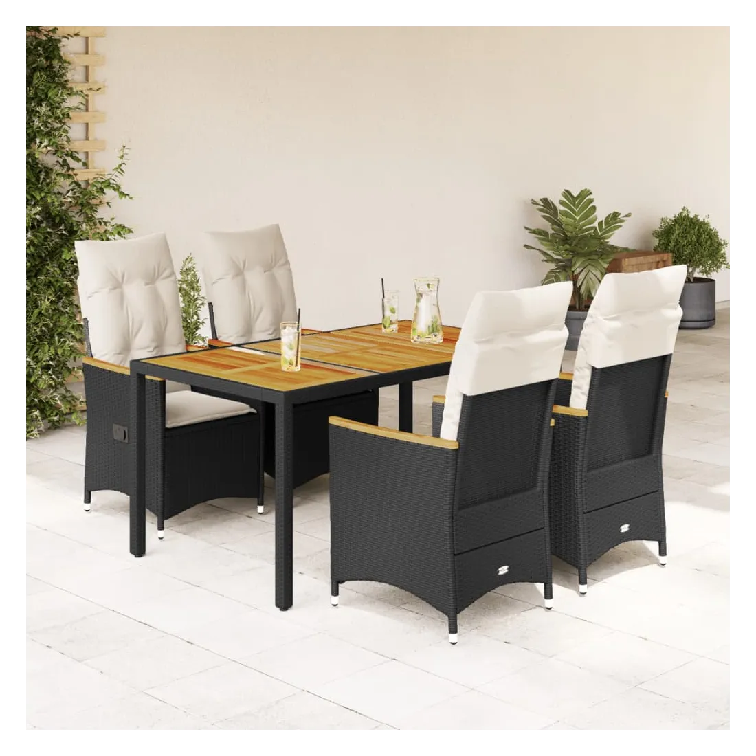 Cet ensemble de salle à manger de jardin est un excellent choix pour les repas en plein air ou pour vous détendre dans le jardin, dans l'arrière-cour ou sur la terrasse. Matériau durable : la résine tressée, également connue sous le nom de poly rotin, est un matériau synthétique solide et nécessitant peu d'entretien qui ressemble au rotin naturel. Il est léger, facile à nettoyer et couramment utilisé pour les meubles d'extérieur en raison de sa durabilité et de ses propriétés de résistance aux intempéries.Dossier réglable : ce siège de jardin est doté d'une poignée. Vous pouvez régler le dossier dans n'importe quelle position en tirant sur la poignée et le remettre rapidement dans sa position initiale.Dessus stable et facile à nettoyer : cette table de jardin a un dessus en bois d'acacia robuste, durable et facile à nettoyer avec un chiffon humide.Expérience d'assise confortable : cet ensemble de meubles d'extérieur, doté de coussins épais, offre une expérience d'assise confortable.Housse amovible et lavable : ces coussins de siège sont dotés de housses amovibles pour un lavage et un entretien faciles. Les coussins de dossier ont un rabat à l'arrière pour une fixation facile aux dossiers. Bon à savoir :Pour que vos meubles d'extérieur restent beaux, nous vous recommandons de les protéger avec une housse imperméable.