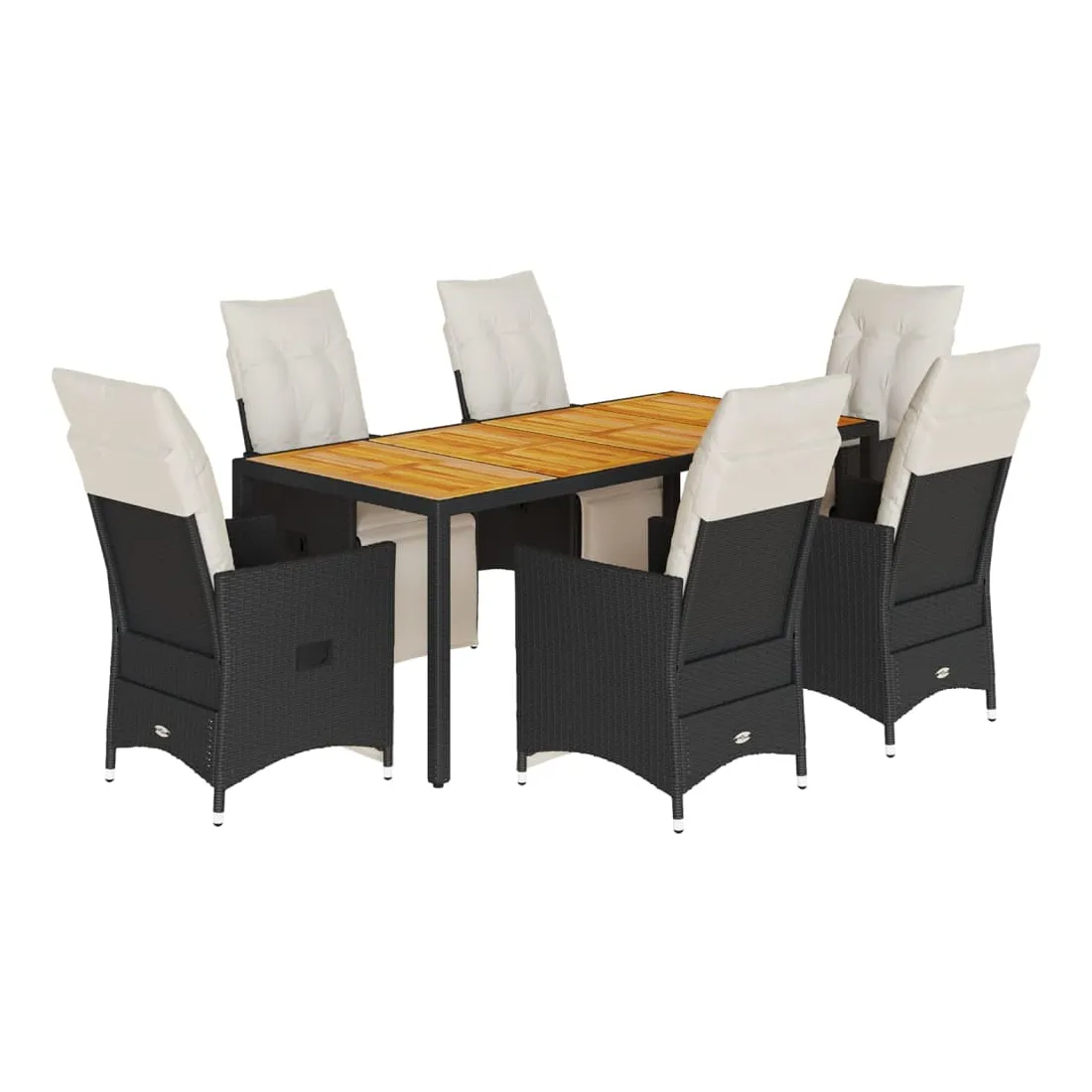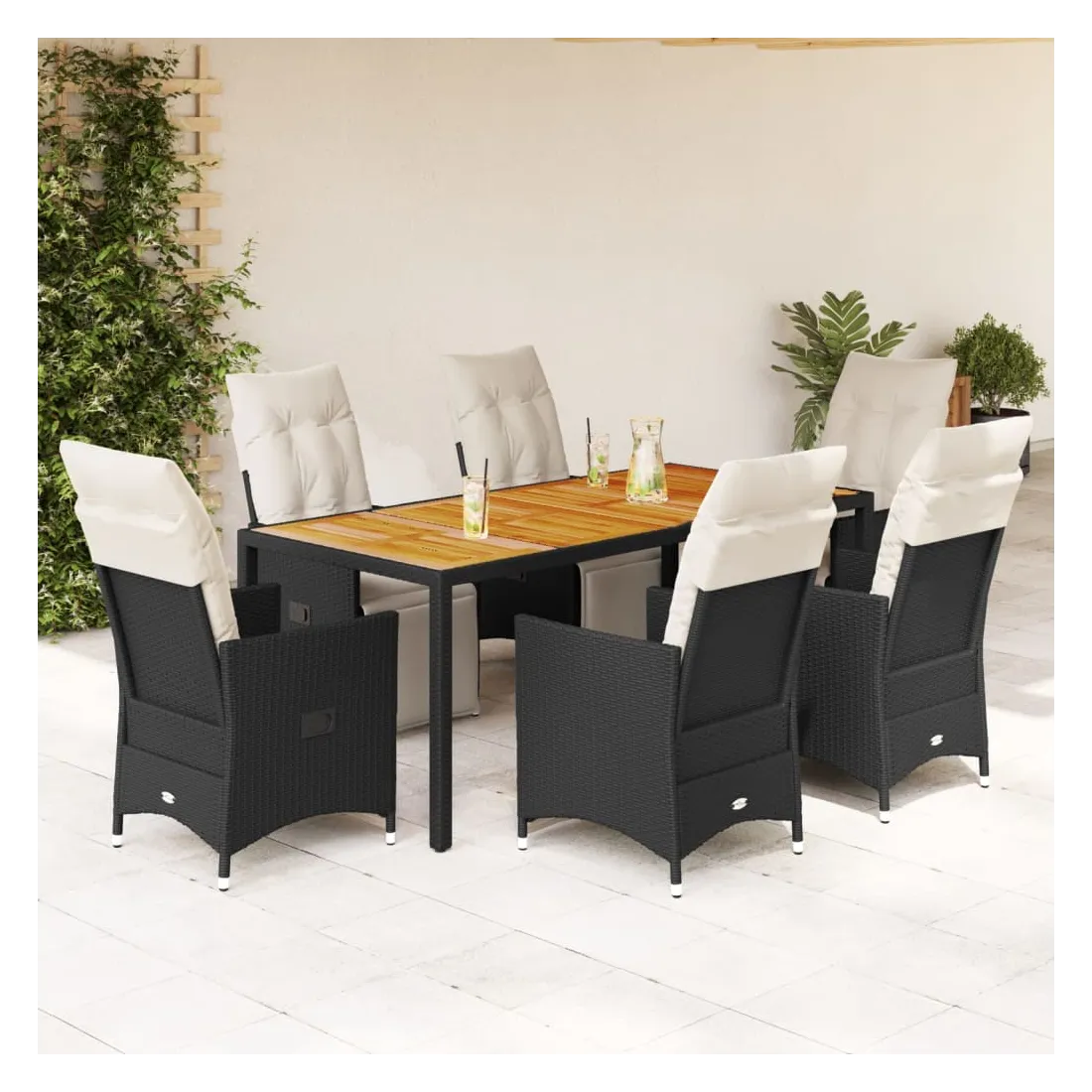 Cet ensemble de salle à manger de jardin est un excellent choix pour les repas en plein air ou pour vous détendre dans le jardin, dans l'arrière-cour ou sur la terrasse. Matériau durable : la résine tressée, également connue sous le nom de poly rotin, est un matériau synthétique solide et nécessitant peu d'entretien qui ressemble au rotin naturel. Il est léger, facile à nettoyer et couramment utilisé pour les meubles d'extérieur en raison de sa durabilité et de ses propriétés de résistance aux intempéries.Dossier et repose-pied réglables : ce siège de jardin est doté d'une poignée. Vous pouvez régler le dossier et le repose-pied dans n'importe quelle position en tirant sur la poignée, et les remettre rapidement dans leur position initiale.Dessus stable et facile à nettoyer : cette table de jardin a un dessus en bois d'acacia robuste, durable et facile à nettoyer avec un chiffon humide.Expérience d'assise confortable : cet ensemble de meubles d'extérieur, doté de coussins épais, offre une expérience d'assise confortable.Housse amovible et lavable : ces coussins de siège sont dotés de housses amovibles pour un lavage et un entretien faciles. Les coussins de dossier ont un rabat à l'arrière pour une fixation facile aux dossiers. Bon à savoir :Pour que vos meubles d'extérieur restent beaux, nous vous recommandons de les protéger avec une housse imperméable.