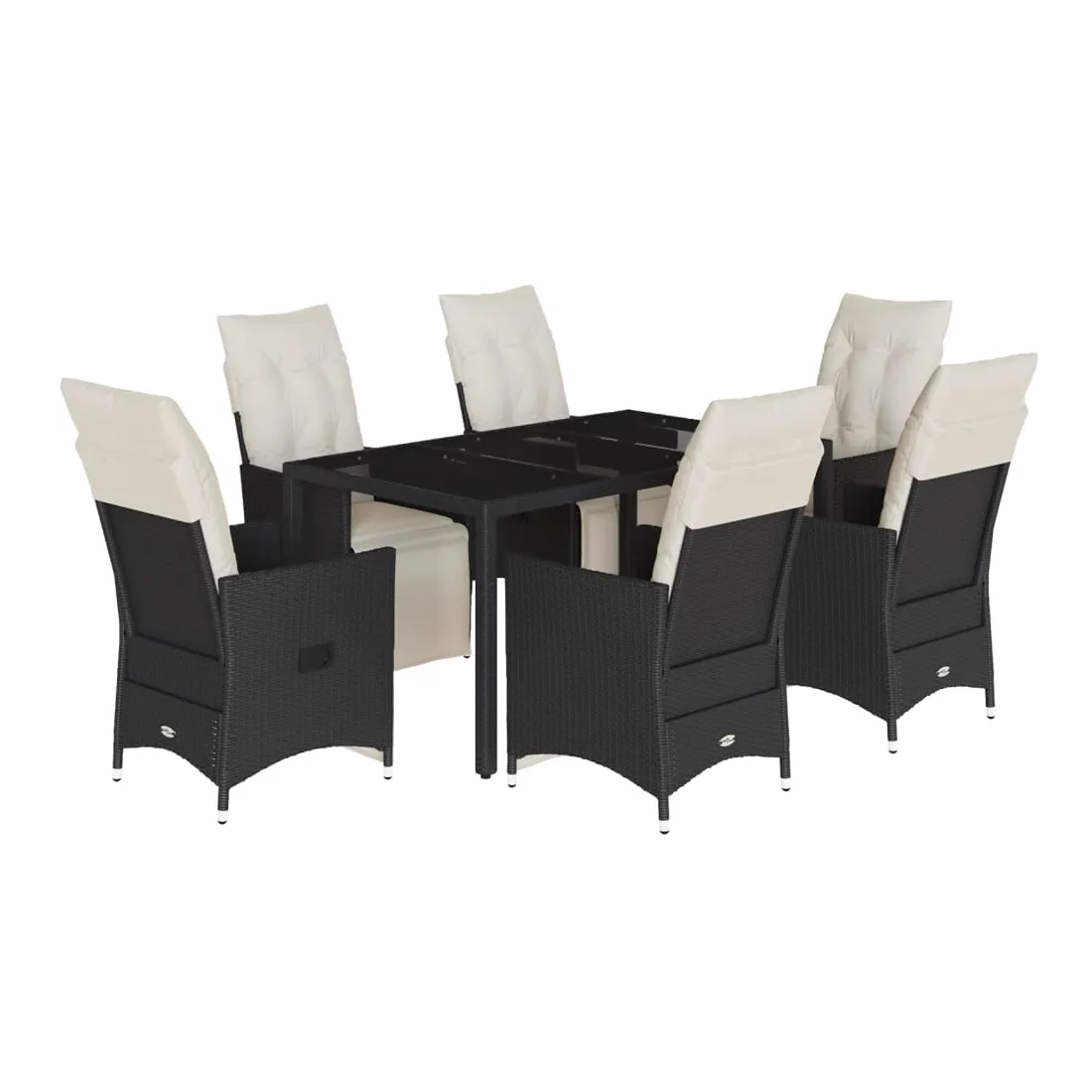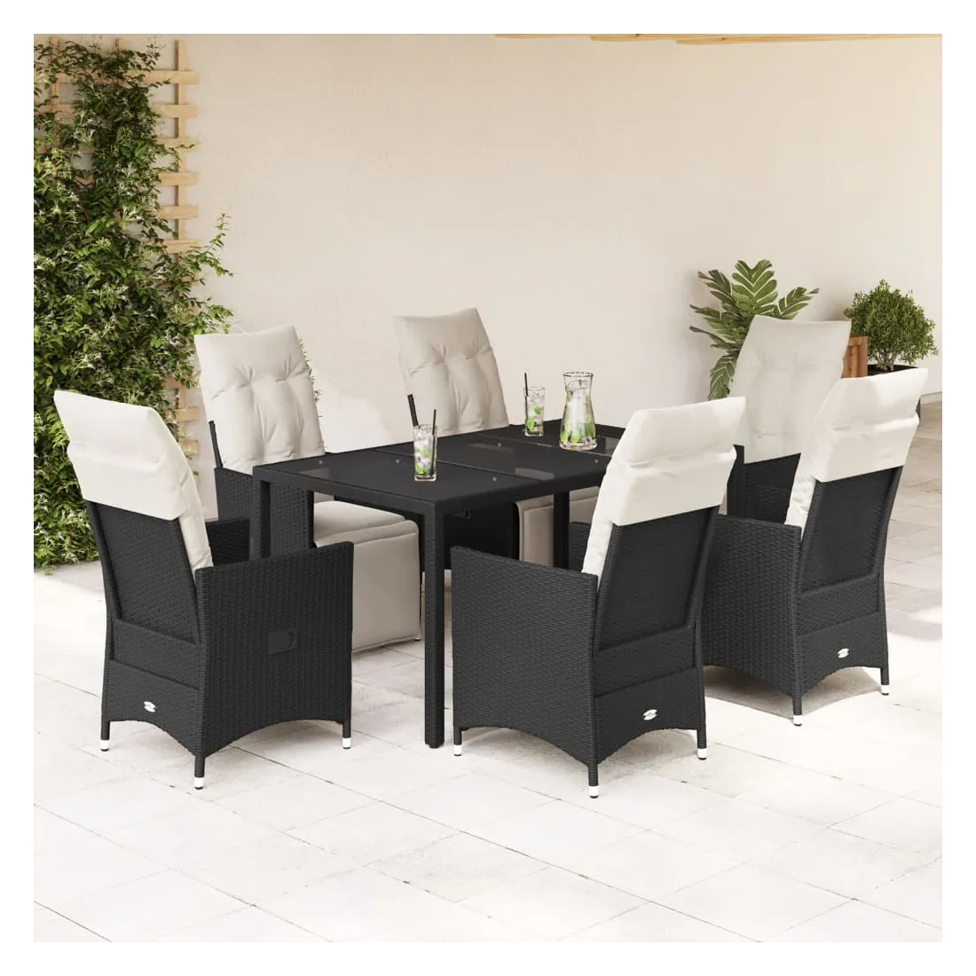 Cet ensemble de salle à manger de jardin est un excellent choix pour les repas en plein air ou pour vous détendre dans le jardin, dans l'arrière-cour ou sur la terrasse. Matériau durable : la résine tressée, également connue sous le nom de poly rotin, est un matériau synthétique solide et nécessitant peu d'entretien qui ressemble au rotin naturel. Il est léger, facile à nettoyer et couramment utilisé pour les meubles d'extérieur en raison de sa durabilité et de ses propriétés de résistance aux intempéries.Dossier et repose-pied réglables : ce siège de jardin est doté d'une poignée. Vous pouvez régler le dossier et le repose-pied dans n'importe quelle position en tirant sur la poignée, et les remettre rapidement dans leur position initiale.Dessus en verre : le dessus de la table d'extérieur est fabriqué en verre trempé solide et durable, ce qui le rend facile à nettoyer avec un chiffon humide et ajoute une touche d'élégance à votre espace extérieur.Expérience d'assise confortable : cet ensemble de meubles d'extérieur, doté de coussins épais, offre une expérience d'assise confortable.Housse amovible et lavable : ces coussins de siège sont dotés de housses amovibles pour un lavage et un entretien faciles. Les coussins de dossier ont un rabat à l'arrière pour une fixation facile aux dossiers. Bon à savoir :Pour que vos meubles d'extérieur restent beaux, nous vous recommandons de les protéger avec une housse imperméable.