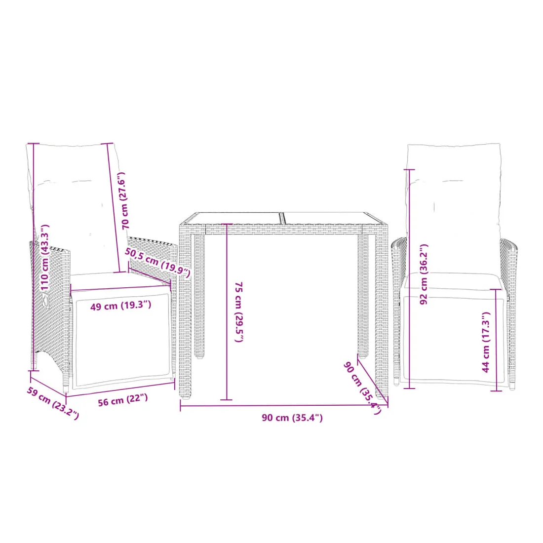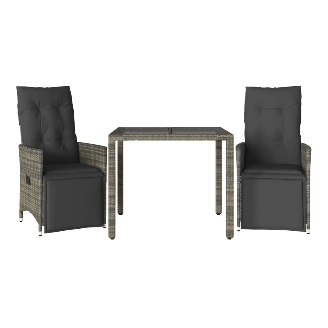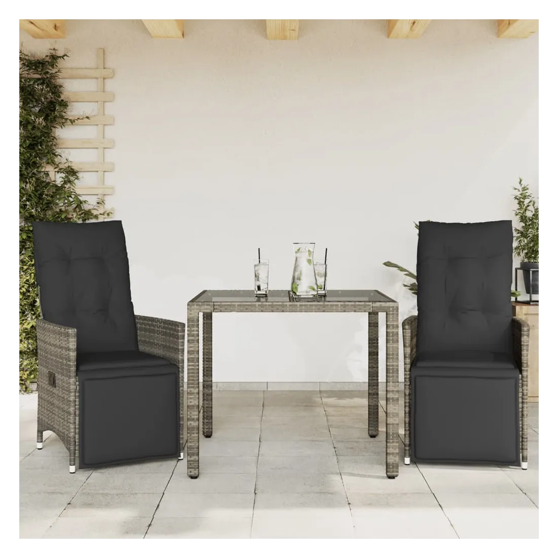 Savourez un café ou discutez avec votre famille et vos amis dans le jardin, l'arrière-cour ou sur le balcon avec cet ensemble de bistro confortable ! Matériau durable : la résine tressée, également connue sous le nom de poly rotin, est un matériau synthétique solide et nécessitant peu d'entretien qui ressemble au rotin naturel. Il est léger, facile à nettoyer et couramment utilisé pour les meubles d'extérieur en raison de sa durabilité et de ses propriétés de résistance aux intempéries.Dossier et repose-pied réglables : ce siège de jardin est doté d'une poignée. Vous pouvez régler le dossier et le repose-pied dans n'importe quelle position en tirant sur la poignée, et le remettre rapidement dans sa position initiale.Expérience d'assise confortable : ce mobilier d'extérieur, doté de coussins épais, offre une expérience d'assise confortable.Housse amovible et lavable : ces coussins de siège sont dotés de housses amovibles pour un lavage et un entretien faciles. Les coussins de dossier ont un rabat à l'arrière pour une fixation facile aux dossiers.Dessus en verre : le dessus de la table d'extérieur est fabriqué en verre trempé solide et durable, ce qui le rend facile à nettoyer avec un chiffon humide et ajoute une touche d'élégance à votre espace extérieur. Bon à savoir :Pour que vos meubles d'extérieur restent beaux, nous vous recommandons de les protéger avec une housse imperméable.
