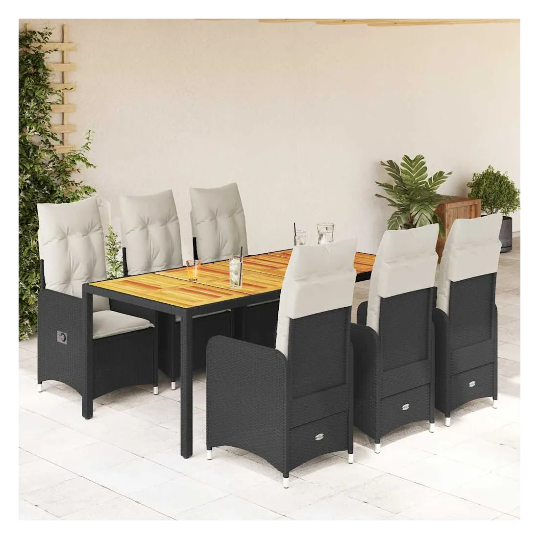 Savourez un café ou discutez avec votre famille et vos amis dans le jardin, l'arrière-cour ou sur le balcon avec cet ensemble de bistro confortable ! Matériau durable : la résine tressée, également connue sous le nom de poly rotin, est un matériau synthétique solide et nécessitant peu d'entretien qui ressemble au rotin naturel. Elle est légère, facile à nettoyer et couramment utilisée pour les meubles d'extérieur en raison de sa durabilité et de ses propriétés de résistance aux intempéries.Dossier réglable : ce siège de jardin est doté d'une poignée. Vous pouvez régler le dossier dans n'importe quelle position en tirant sur la poignée et le remettre rapidement dans sa position initiale.Expérience d'assise confortable : ce mobilier d'extérieur, doté de coussins épais, offre une expérience d'assise confortable.Housse amovible et lavable : ces coussins de siège sont dotés de housses amovibles pour un lavage et un entretien faciles. Les coussins de dossier ont un rabat à l'arrière pour une fixation facile aux dossiers.Dessus stable et facile à nettoyer : cette table de jardin a un dessus en bois d'acacia robuste, durable et facile à nettoyer avec un chiffon humide. Bon à savoir :Pour que vos meubles d'extérieur restent beaux, nous vous recommandons de les protéger avec une housse imperméable.