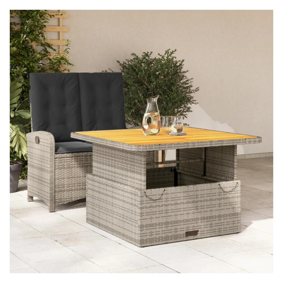 Cet ensemble de salle à manger de jardin est un excellent choix pour les repas en plein air ou pour vous détendre dans le jardin, dans l'arrière-cour ou sur la terrasse. Matériau durable : la résine tressée, également connue sous le nom de poly rotin, est un matériau synthétique solide et nécessitant peu d'entretien qui ressemble au rotin naturel. Il est léger, facile à nettoyer et couramment utilisé pour les meubles d'extérieur en raison de sa durabilité et de ses propriétés de résistance aux intempéries.Dossier réglable : ce siège de jardin est doté d'une poignée. Vous pouvez régler le dossier dans n'importe quelle position en tirant sur la poignée et le remettre rapidement dans sa position initiale.Dessus de table réglable : le dessus de table peut être soulevé pour rendre la table plus haute, ce qui transforme la table d'extérieur d'une table basse à une table de salle à manger. Elle est parfaite pour recevoir des invités ou prendre des repas à l'extérieur.Housse amovible et lavable : ces coussins de siège sont dotés de housses amovibles pour un lavage et un entretien faciles. Les coussins de dossier ont un rabat à l'arrière pour une fixation facile aux dossiers.Expérience d'assise confortable : ce mobilier d'extérieur, doté de coussins épais, offre une expérience d'assise confortable. Bon à savoir :Pour que vos meubles d'extérieur restent beaux, nous vous recommandons de les protéger avec une housse imperméable.
