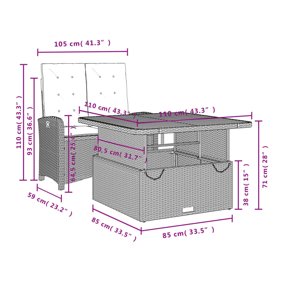 - Dimensions d'assise : 105 x 59 x 93 cm (l x P x H)