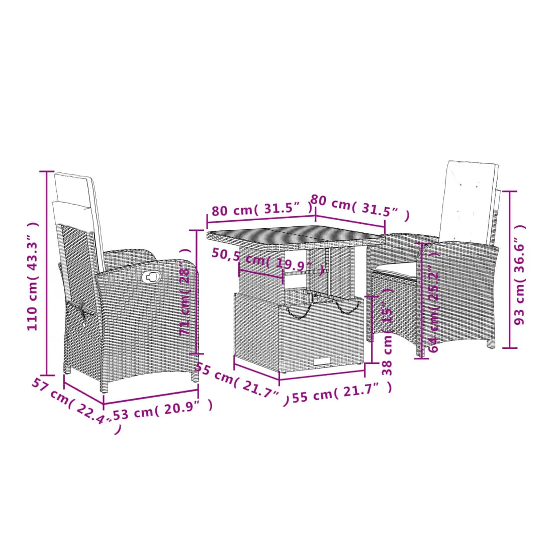 - Dimensions de la table : 80 x 80 x 40/71 cm (L x l x H)