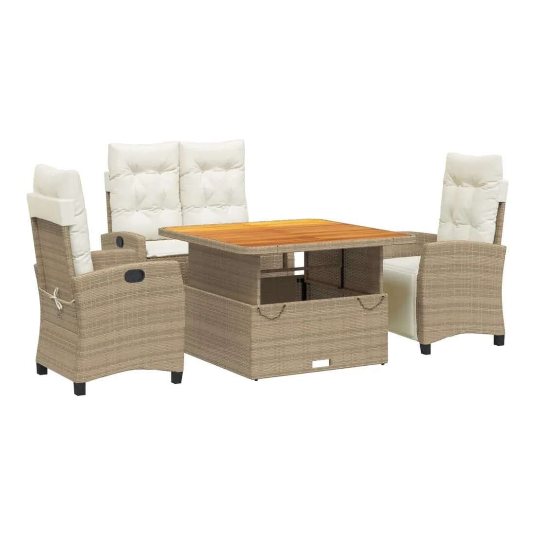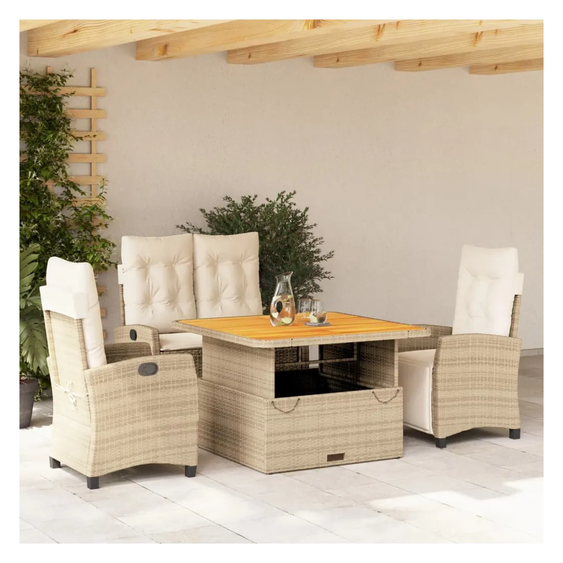 Cet ensemble de salle à manger de jardin est un excellent choix pour les repas en plein air ou simplement pour se détendre dans le jardin, la cour arrière ou sur la terrasse. Matériau durable : le rotin PE, également connu sous le nom de polyrotin, est un matériau synthétique solide et facile d'entretien qui ressemble au rotin naturel. Il est léger, facile à nettoyer et couramment utilisé pour les meubles d'extérieur en raison de sa durabilité et de ses propriétés de résistance aux intempéries. Dossier réglable : ce siège de jardin est équipé d'une poignée. Vous pouvez régler le dossier dans n'importe quelle position en tirant sur la poignée, puis le remettre rapidement dans sa position d'origine. Plateau réglable : le plateau peut être relevé pour rehausser la table, ce qui transforme la table d'extérieur en table basse ou en table à manger. Elle est parfaite pour recevoir des invités ou prendre des repas à l'extérieur. Housse amovible et lavable : ces coussins d'assise sont dotés de housses amovibles pour faciliter le lavage et l'entretien. Les coussins de dossier sont munis d'un rabat à l'arrière pour faciliter leur fixation aux dossiers. Assise confortable : Ce mobilier d'extérieur, doté de coussins épais et rembourrés, offre une assise confortable. Bon à savoir :Pour que votre mobilier d'extérieur reste beau, nous vous recommandons de le protéger avec une housse imperméable.