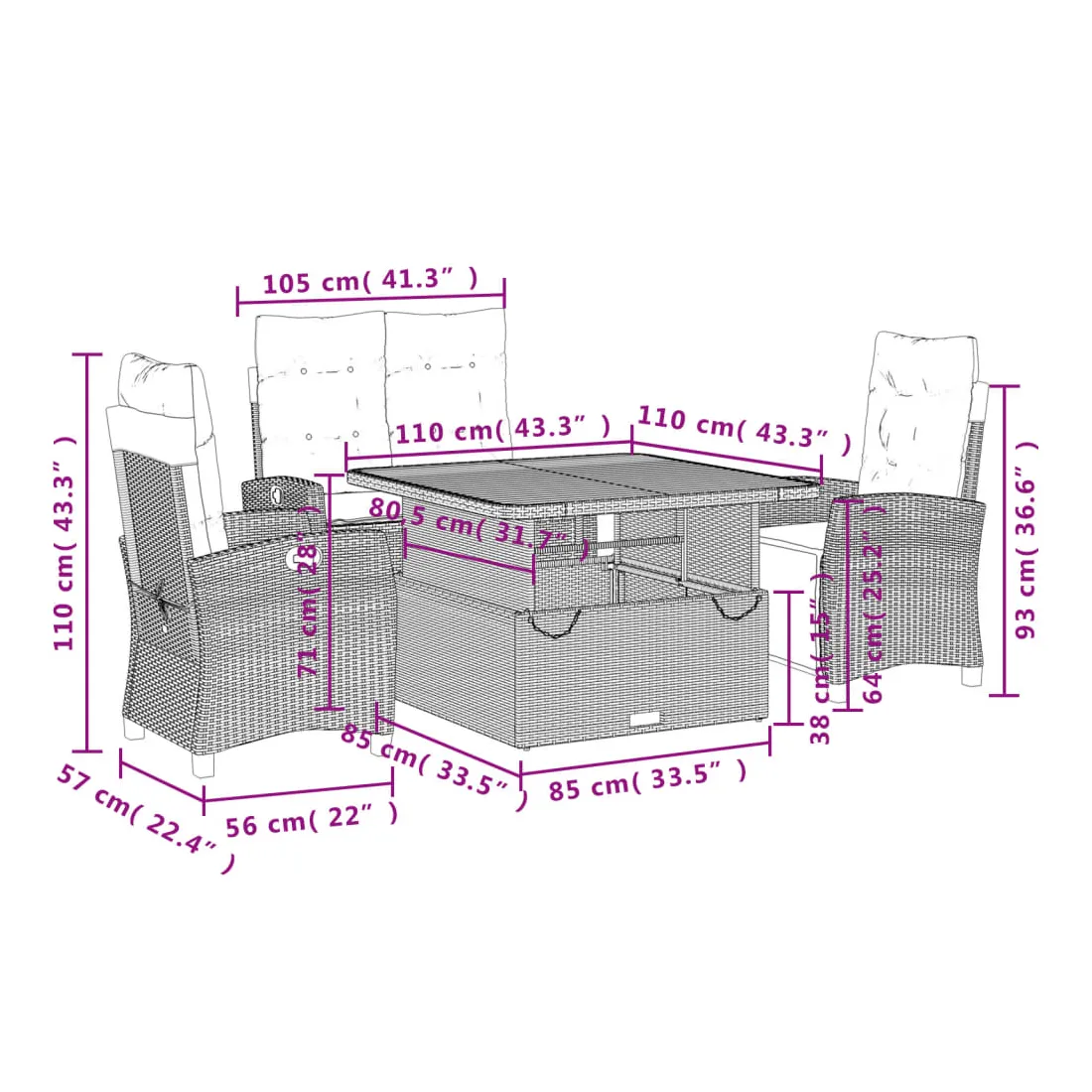 - Dimensions de la table : 110 x 110 x 40/71 cm (L x l x H)