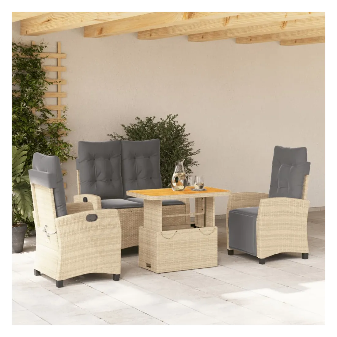 Cet ensemble de salle à manger de jardin est un excellent choix pour les repas en plein air ou simplement pour se détendre dans le jardin, la cour arrière ou sur la terrasse. Matériau durable : le rotin PE, également connu sous le nom de polyrotin, est un matériau synthétique solide et facile d'entretien qui ressemble au rotin naturel. Il est léger, facile à nettoyer et couramment utilisé pour les meubles d'extérieur en raison de sa durabilité et de ses propriétés de résistance aux intempéries. Dossier réglable : ce siège de jardin est équipé d'une poignée. Vous pouvez régler le dossier dans n'importe quelle position en tirant sur la poignée, puis le remettre rapidement dans sa position d'origine. Plateau réglable : le plateau peut être relevé pour rehausser la table, ce qui transforme la table d'extérieur en table basse ou en table à manger. Elle est parfaite pour recevoir des invités ou prendre des repas à l'extérieur. Housse amovible et lavable : ces coussins d'assise sont dotés de housses amovibles pour faciliter le lavage et l'entretien. Les coussins de dossier sont munis d'un rabat à l'arrière pour faciliter leur fixation aux dossiers. Assise confortable : Ce mobilier d'extérieur, doté de coussins épais et rembourrés, offre une assise confortable. Bon à savoir :Pour que votre mobilier d'extérieur reste beau, nous vous recommandons de le protéger avec une housse imperméable.