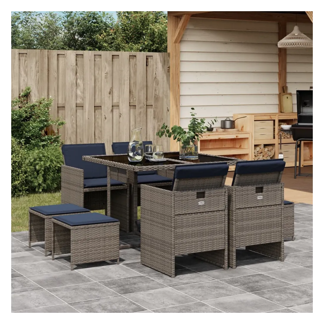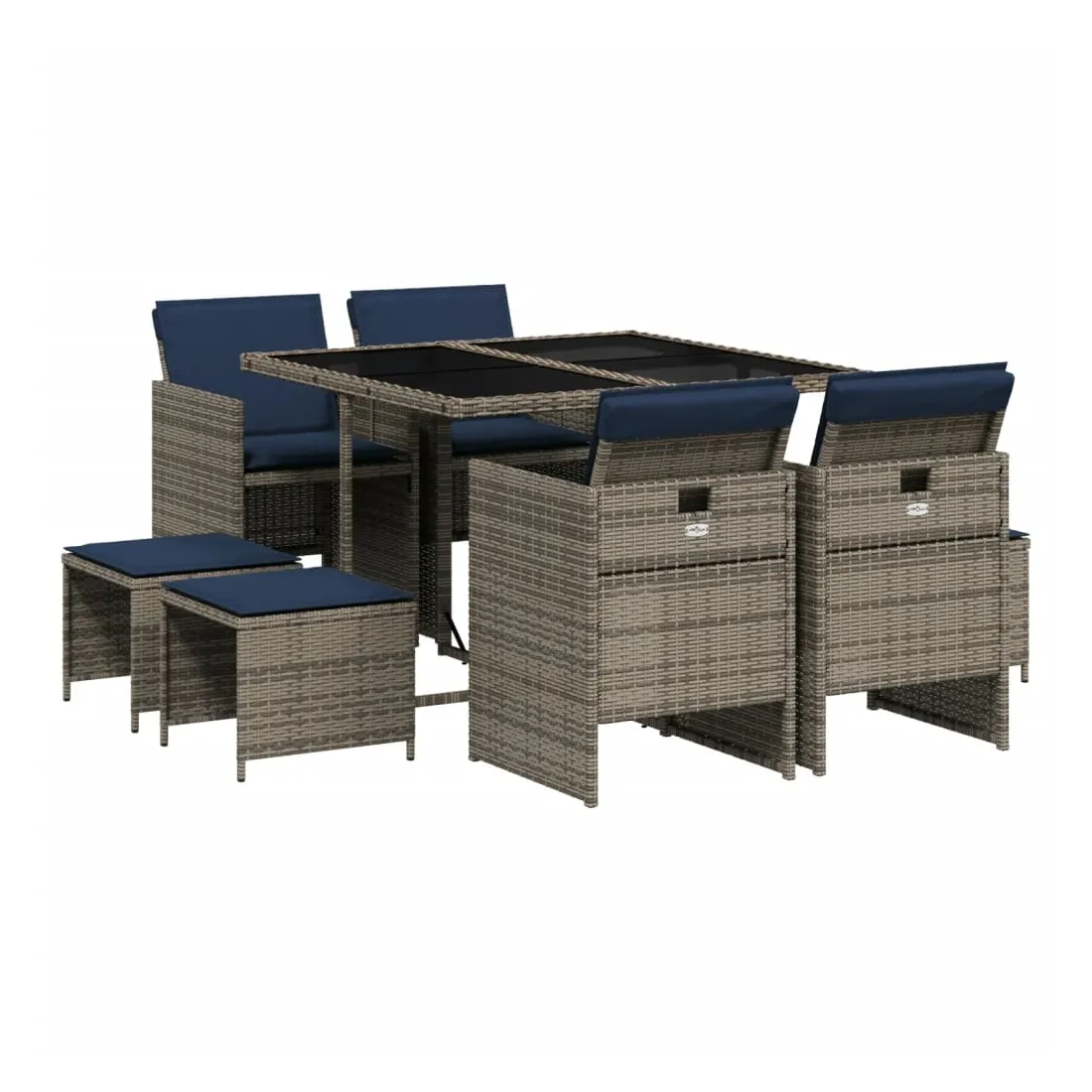 Cet ensemble de salle à manger de jardin est un excellent choix pour les repas en plein air ou pour vous détendre dans le jardin, dans l'arrière-cour ou sur la terrasse. Matériau durable : la résine tressée, également connue sous le nom de poly rotin, est un matériau synthétique solide et nécessitant peu d'entretien qui ressemble au rotin naturel. Elle est légère, facile à nettoyer et couramment utilisée pour les meubles d'extérieur en raison de sa durabilité et de ses propriétés de résistance aux intempéries.Rangement compact : ces chaises sont dotées d'un dossier rabattable, ce qui permet de les ranger facilement sous la table. Une fois pliées, elles se rangent parfaitement sous la table, formant un cube peu encombrant. De plus, les tabourets peuvent également être rangés sous les chaises, maximisant encore davantage l'efficacité de l'espace. Expérience d'assise confortable : ce mobilier d'extérieur, doté de coussins épais, offre une expérience d'assise confortable.Housse amovible et lavable : ces coussins de siège sont dotés de housses amovibles pour un lavage et un entretien faciles.Dessus en verre : le dessus de la table d'extérieur est fabriqué en verre trempé solide et durable, ce qui le rend facile à nettoyer avec un chiffon humide et ajoute une touche d'élégance à votre espace extérieur. Bon à savoir : Pour que vos meubles d'extérieur restent beaux, nous vous recommandons de les protéger avec une housse imperméable.