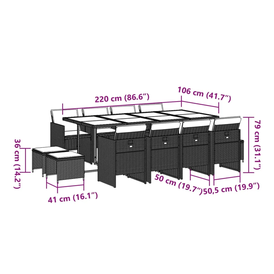 Cet ensemble de salle à manger de jardin est un excellent choix pour les repas en plein air ou pour vous détendre dans le jardin, dans l'arrière-cour ou sur la terrasse. Matériau durable : la résine tressée, également connue sous le nom de poly rotin, est un matériau synthétique solide et nécessitant peu d'entretien qui ressemble au rotin naturel. Il est léger, facile à nettoyer et couramment utilisé pour les meubles d'extérieur en raison de sa durabilité et de ses propriétés de résistance aux intempéries.Rangement compact : ces chaises sont dotées d'un dossier rabattable, ce qui permet de les ranger facilement sous la table. Une fois pliées, elles se rangent parfaitement sous la table, formant un cube peu encombrant. De plus, les tabourets peuvent également être rangés sous les chaises, maximisant encore davantage l'efficacité de l'espace. Expérience d'assise confortable : ce mobilier d'extérieur, doté de coussins épais, offre une expérience d'assise confortable.Housse amovible et lavable : ces coussins de siège sont dotés de housses amovibles pour un lavage et un entretien faciles.Dessus stable et facile à nettoyer : cette table de jardin a un dessus en bois d'acacia robuste, durable et facile à nettoyer avec un chiffon humide. Bon à savoir : Pour que vos meubles d'extérieur restent beaux, nous vous recommandons de les protéger avec une housse imperméable.