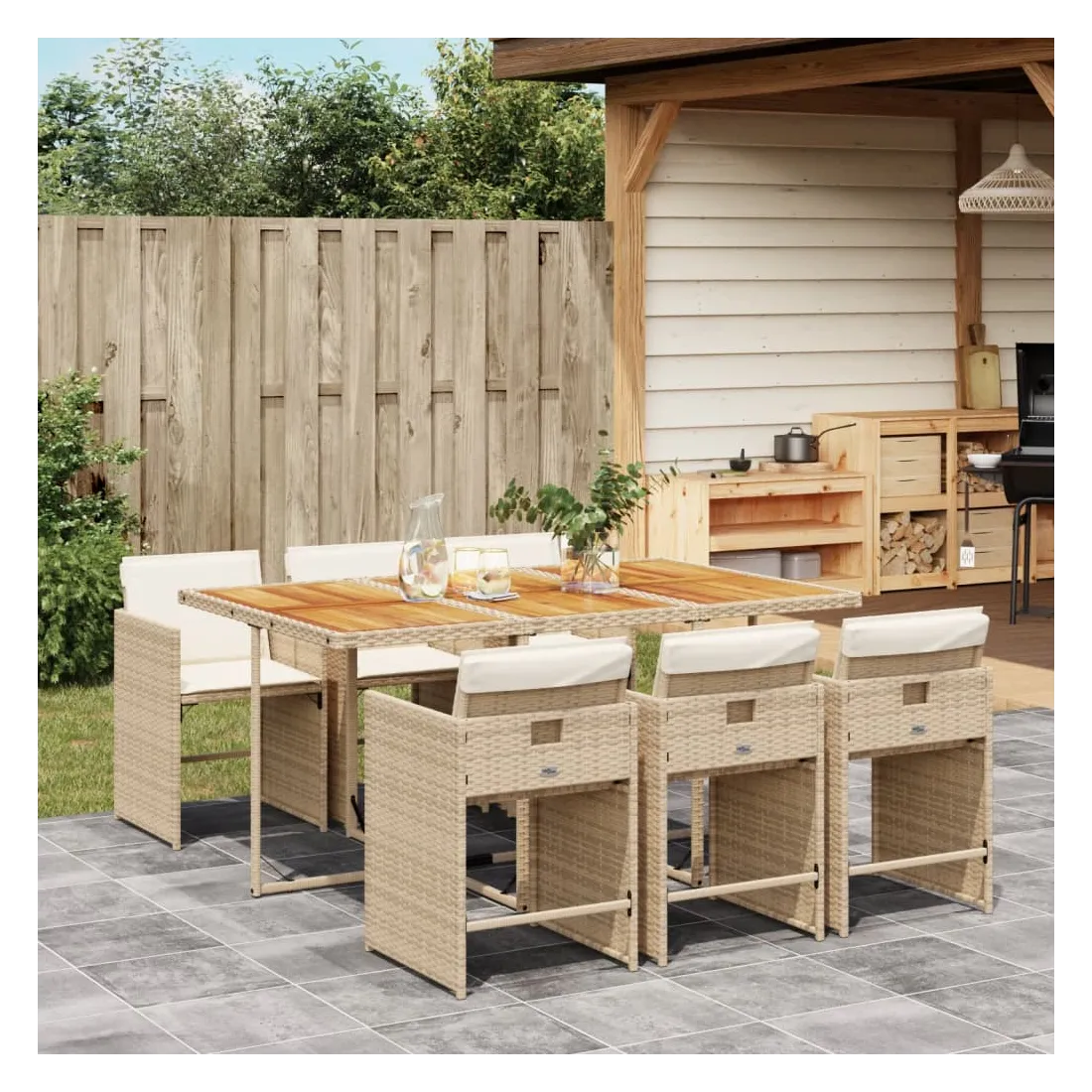 Cet ensemble de salle à manger de jardin est un excellent choix pour les repas en plein air ou pour vous détendre dans le jardin, dans l'arrière-cour ou sur la terrasse. Matériau durable : la résine tressée, également connue sous le nom de poly rotin, est un matériau synthétique solide et nécessitant peu d'entretien qui ressemble au rotin naturel. Il est léger, facile à nettoyer et couramment utilisé pour les meubles d'extérieur en raison de sa durabilité et de ses propriétés de résistance aux intempéries.Rangement compact : ces chaises sont dotées d'un dossier rabattable, ce qui permet de les ranger facilement sous la table. Une fois pliées, elles se rangent parfaitement sous la table, formant un cube peu encombrant.Expérience d'assise confortable : ce mobilier d'extérieur, doté de coussins épais, offre une expérience d'assise confortable.Housse amovible et lavable : ces coussins de siège sont dotés de housses amovibles pour un lavage et un entretien faciles. Les housses de coussin de chaise ont un rabat à l'arrière pour une fixation facile aux chaises.Dessus stable et facile à nettoyer : cette table de jardin a un dessus en bois d'acacia robuste, durable et facile à nettoyer avec un chiffon humide. Bon à savoir : Pour que vos meubles d'extérieur restent beaux, nous vous recommandons de les protéger avec une housse imperméable.