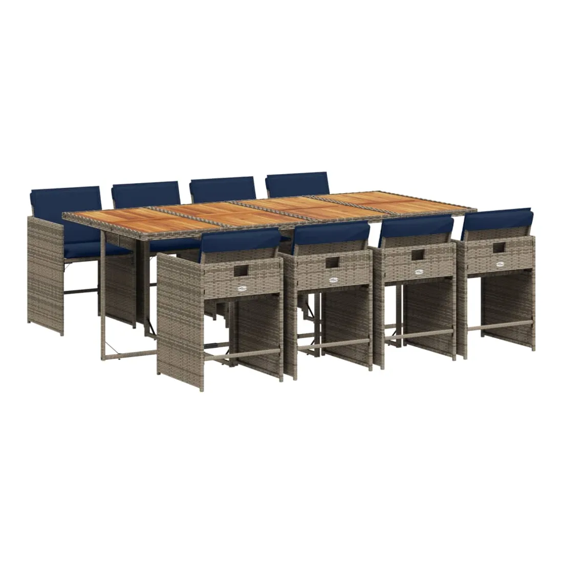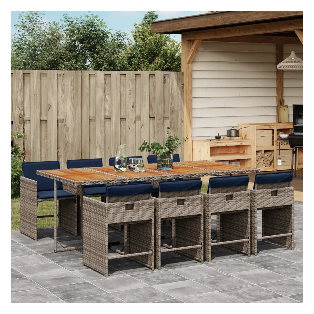 vidaXLCet ensemble de salle à manger de jardin est un excellent choix pour les repas en plein air ou pour vous détendre dans le jardin, dans l'arrière-cour ou sur la terrasse. Matériau durable : la résine tressée, également connue sous le nom de poly rotin, est un matériau synthétique solide et nécessitant peu d'entretien qui ressemble au rotin naturel. Elle est légère, facile à nettoyer et couramment utilisée pour les meubles d'extérieur en raison de sa durabilité et de ses propriétés de résistance aux intempéries.Rangement compact : ces chaises sont dotées d'un dossier rabattable, ce qui permet de les ranger facilement sous la table. Une fois pliées, elles se rangent parfaitement sous la table, formant un cube peu encombrant.Expérience d'assise confortable : ce mobilier d'extérieur, doté de coussins épais, offre une expérience d'assise confortable.Housse amovible et lavable : ces coussins de siège sont dotés de housses amovibles pour un lavage et un entretien faciles. Les housses de coussin de chaise ont un rabat à l'arrière pour une fixation facile aux chaises.Dessus stable et facile à nettoyer : cette table de jardin a un dessus en bois d'acacia robuste, durable et facile à nettoyer avec un chiffon humide. Bon à savoir : Pour que vos meubles d'extérieur restent beaux, nous vous recommandons de les protéger avec une housse imperméable.