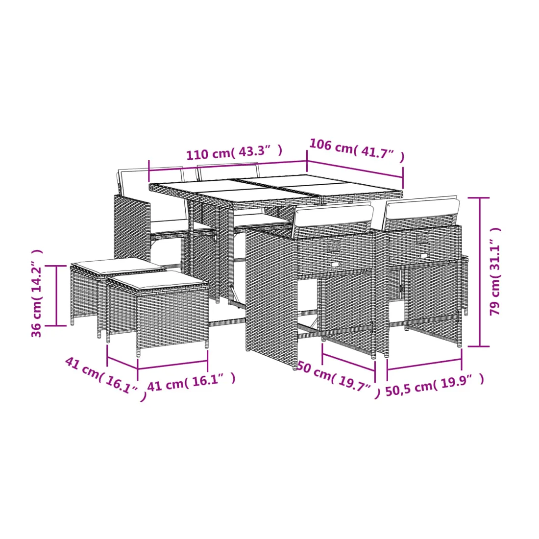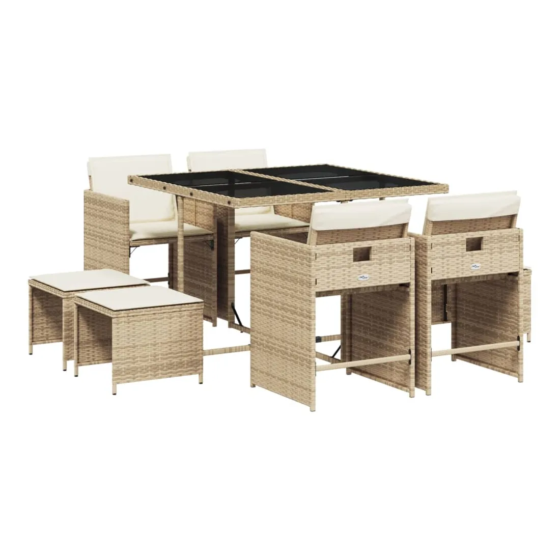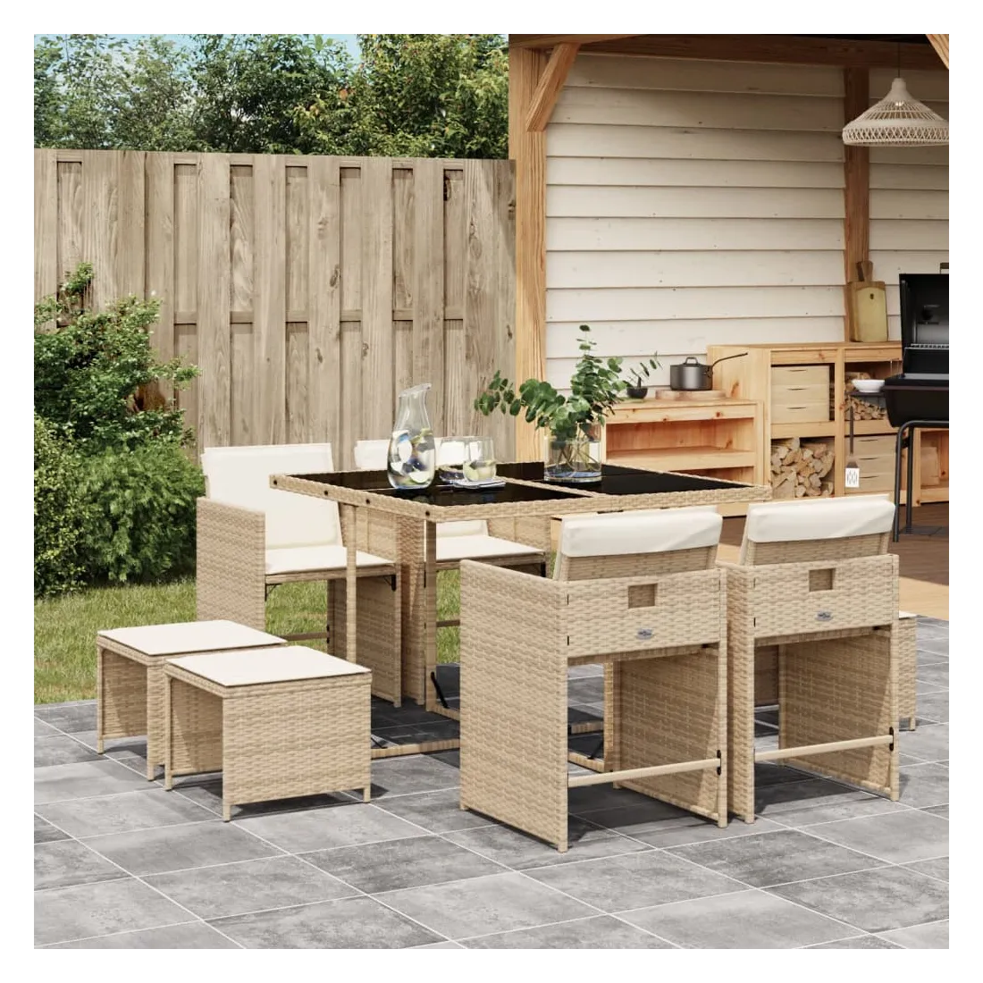 Cet ensemble de salle à manger de jardin est un excellent choix pour les repas en plein air ou pour vous détendre dans le jardin, dans l'arrière-cour ou sur la terrasse. Matériau durable : la résine tressée, également connue sous le nom de poly rotin, est un matériau synthétique solide et nécessitant peu d'entretien qui ressemble au rotin naturel. Il est léger, facile à nettoyer et couramment utilisé pour les meubles d'extérieur en raison de sa durabilité et de ses propriétés de résistance aux intempéries.Rangement compact : ces chaises sont dotées d'un dossier rabattable, ce qui permet de les ranger facilement sous la table. Une fois pliées, elles se rangent parfaitement sous la table, formant un cube peu encombrant. De plus, les tabourets peuvent également être rangés sous les chaises, maximisant encore davantage l'efficacité de l'espace.Expérience d'assise confortable : ce mobilier d'extérieur, doté de coussins épais, offre une expérience d'assise confortable.Housse amovible et lavable : ces coussins de siège sont dotés de housses amovibles pour un lavage et un entretien faciles. Les housses de coussin de chaise ont un rabat à l'arrière pour une fixation facile aux chaises.Dessus stable et facile à nettoyer : cette table de jardin est dotée d'un dessus en verre trempé robuste, durable et facile à nettoyer à l'aide d'un chiffon humide. Bon à savoir : Pour que vos meubles d'extérieur restent beaux, nous vous recommandons de les protéger avec une housse imperméable.
