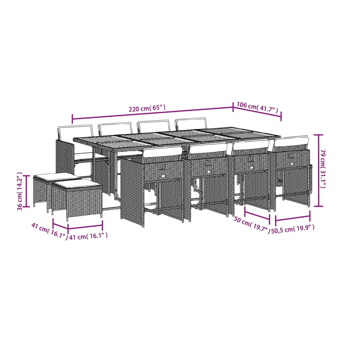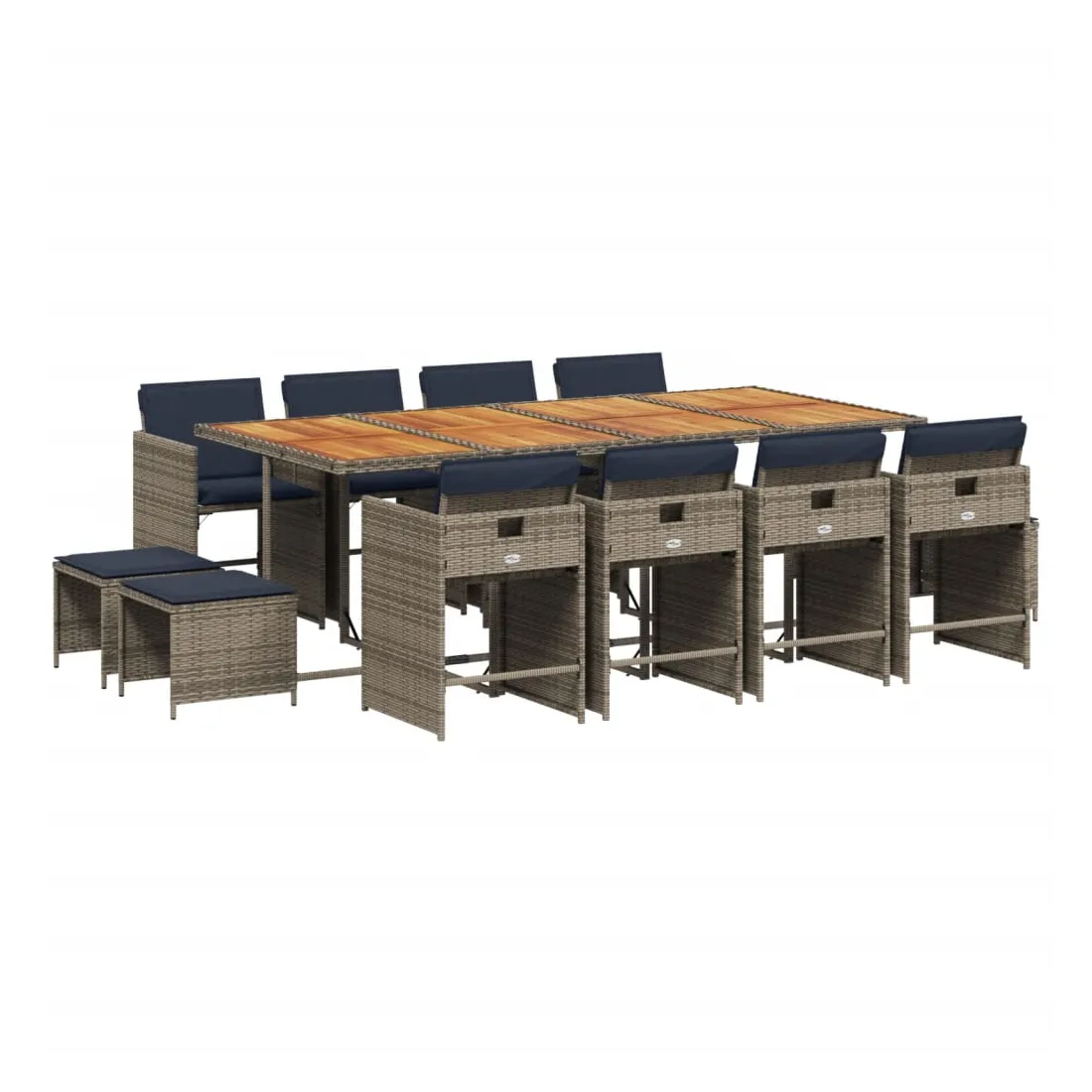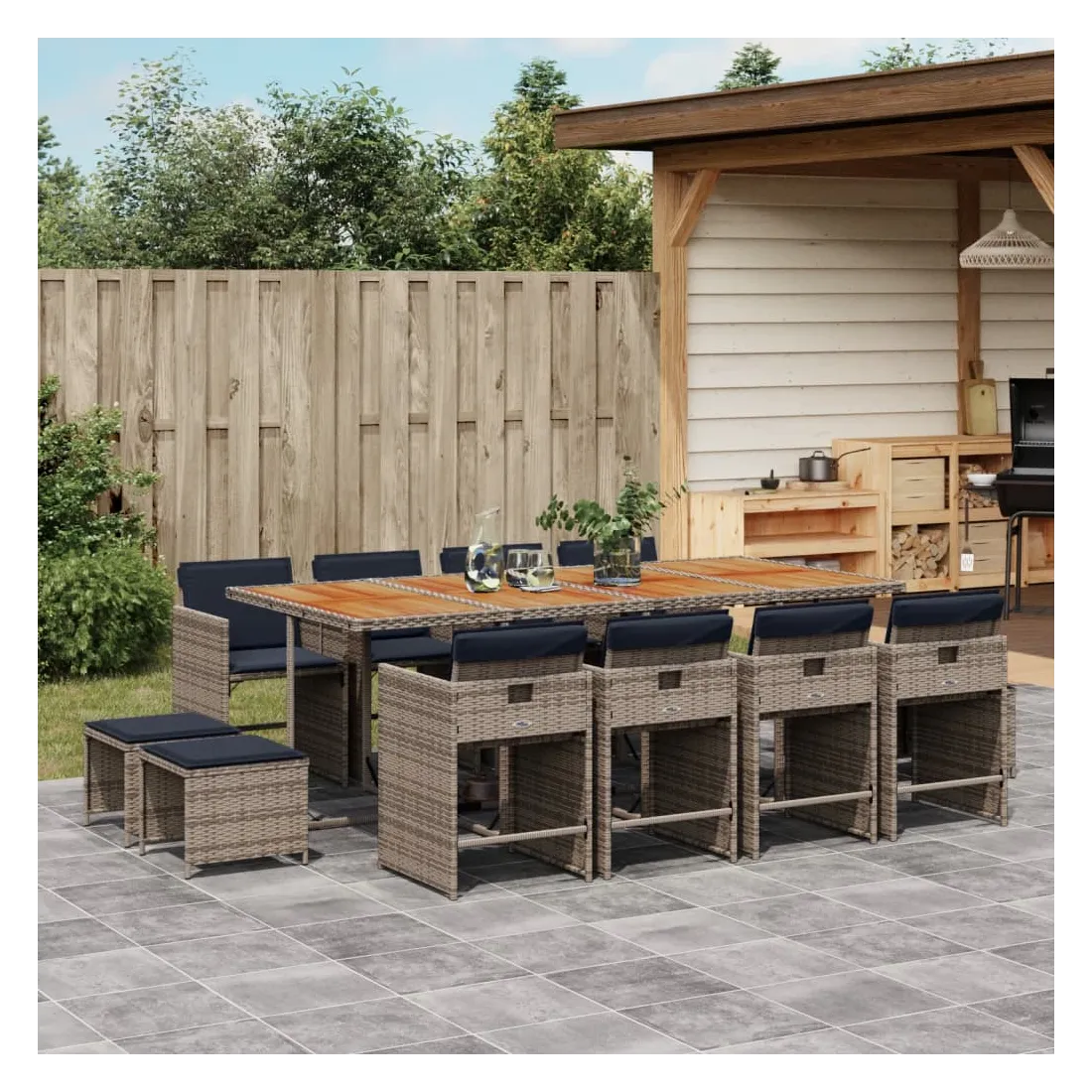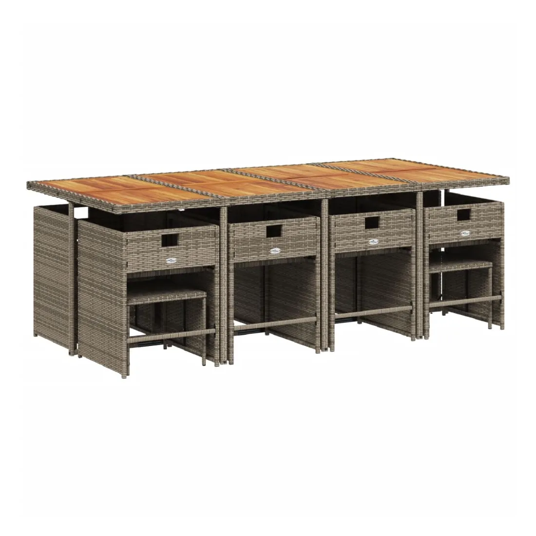 vidaXLCet ensemble de salle à manger de jardin est un excellent choix pour les repas en plein air ou pour vous détendre dans le jardin, dans l'arrière-cour ou sur la terrasse. Matériau durable : la résine tressée, également connue sous le nom de poly rotin, est un matériau synthétique solide et nécessitant peu d'entretien qui ressemble au rotin naturel. Elle est légère, facile à nettoyer et couramment utilisée pour les meubles d'extérieur en raison de sa durabilité et de ses propriétés de résistance aux intempéries.Rangement compact : ces chaises sont dotées d'un dossier rabattable, ce qui permet de les ranger facilement sous la table. Une fois pliées, elles se rangent parfaitement sous la table, formant un cube peu encombrant. De plus, les tabourets peuvent également être rangés sous les chaises, maximisant encore davantage l'efficacité de l'espace.Expérience d'assise confortable : ce mobilier d'extérieur, doté de coussins épais, offre une expérience d'assise confortable.Housse amovible et lavable : ces coussins de siège sont dotés de housses amovibles pour un lavage et un entretien faciles. Les housses de coussin de chaise ont un rabat à l'arrière pour une fixation facile aux chaises.Dessus stable et facile à nettoyer : cette table de jardin a un dessus en bois d'acacia robuste, durable et facile à nettoyer avec un chiffon humide. Bon à savoir : Pour que vos meubles d'extérieur restent beaux, nous vous recommandons de les protéger avec une housse imperméable.