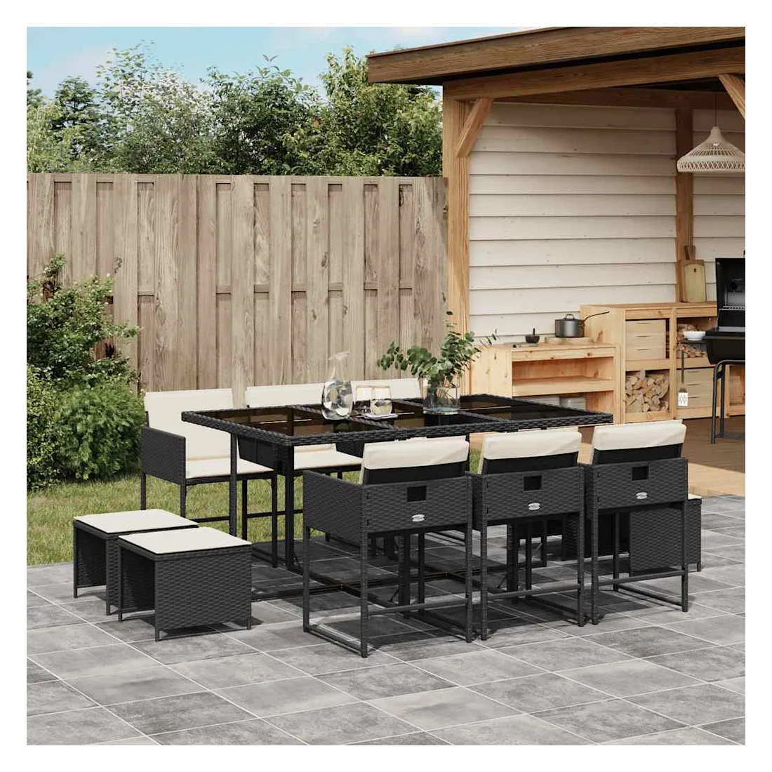 Cet ensemble de salle à manger de jardin est un excellent choix pour les repas en plein air ou pour vous détendre dans le jardin, dans l'arrière-cour ou sur la terrasse. Matériau durable : la résine tressée, également connue sous le nom de poly rotin, est un matériau synthétique solide et nécessitant peu d'entretien qui ressemble au rotin naturel. Il est léger, facile à nettoyer et couramment utilisé pour les meubles d'extérieur en raison de sa durabilité et de ses propriétés de résistance aux intempéries.Rangement compact : ces chaises sont dotées d'un dossier rabattable, ce qui permet de les ranger facilement sous la table. Une fois pliées, elles se rangent parfaitement sous la table, formant un cube peu encombrant. De plus, les tabourets peuvent également être rangés sous les chaises, maximisant encore davantage l'efficacité de l'espace.Expérience d'assise confortable : ce mobilier d'extérieur, doté de coussins épais, offre une expérience d'assise confortable.Housse amovible et lavable : ces coussins de siège sont dotés de housses amovibles pour un lavage et un entretien faciles. Les housses de coussin ont un rabat à l'arrière pour une fixation facile aux dossiers.Dessus en verre : le dessus de la table d'extérieur est fabriqué en verre trempé solide et durable, ce qui le rend facile à nettoyer avec un chiffon humide et ajoute une touche d'élégance à votre espace extérieur. Bon à savoir : Pour que vos meubles d'extérieur restent beaux, nous vous recommandons de les protéger avec une housse imperméable.