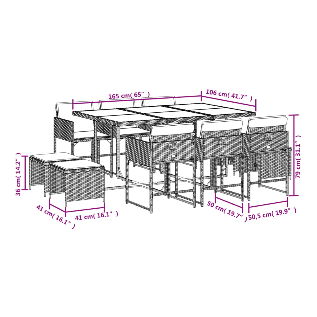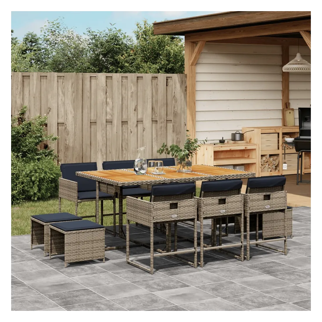 vidaXLCet ensemble de salle à manger de jardin est un excellent choix pour les repas en plein air ou pour vous détendre dans le jardin, dans l'arrière-cour ou sur la terrasse. Matériau durable : la résine tressée, également connue sous le nom de poly rotin, est un matériau synthétique solide et nécessitant peu d'entretien qui ressemble au rotin naturel. Elle est légère, facile à nettoyer et couramment utilisée pour les meubles d'extérieur en raison de sa durabilité et de ses propriétés de résistance aux intempéries.Rangement compact : ces chaises sont dotées d'un dossier rabattable, ce qui permet de les ranger facilement sous la table. Une fois pliées, elles se rangent parfaitement sous la table, formant un cube peu encombrant. De plus, les tabourets peuvent également être rangés sous les chaises, maximisant encore davantage l'efficacité de l'espace.Expérience d'assise confortable : ce mobilier d'extérieur, doté de coussins épais, offre une expérience d'assise confortable.Housse amovible et lavable : ces coussins de siège sont dotés de housses amovibles pour un lavage et un entretien faciles. Les housses de coussin ont un rabat à l'arrière pour une fixation facile aux dossiers.Dessus stable et facile à nettoyer : cette table de jardin a un dessus en bois d'acacia robuste, durable et facile à nettoyer avec un chiffon humide. Bon à savoir : Pour que vos meubles d'extérieur restent beaux, nous vous recommandons de les protéger avec une housse imperméable.
