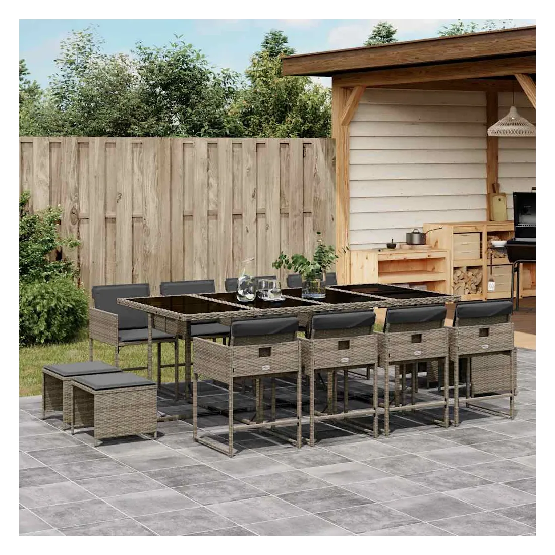 Cet ensemble de salle à manger de jardin est un excellent choix pour les repas en plein air ou pour vous détendre dans le jardin, dans l'arrière-cour ou sur la terrasse. Matériau durable : la résine tressée, également connue sous le nom de poly rotin, est un matériau synthétique solide et nécessitant peu d'entretien qui ressemble au rotin naturel. Il est léger, facile à nettoyer et couramment utilisé pour les meubles d'extérieur en raison de sa durabilité et de ses propriétés de résistance aux intempéries.Rangement compact : ces chaises sont dotées d'un dossier rabattable, ce qui permet de les ranger facilement sous la table. Une fois pliées, elles se rangent parfaitement sous la table, formant un cube peu encombrant. De plus, les tabourets peuvent également être rangés sous les chaises, maximisant encore davantage l'efficacité de l'espace.Expérience d'assise confortable : ce mobilier d'extérieur, doté de coussins épais, offre une expérience d'assise confortable.Housse amovible et lavable : ces coussins de siège sont dotés de housses amovibles pour un lavage et un entretien faciles. Les housses de coussin ont un rabat à l'arrière pour une fixation facile aux dossiers.Dessus en verre : le dessus de la table d'extérieur est fabriqué en verre trempé solide et durable, ce qui le rend facile à nettoyer avec un chiffon humide et ajoute une touche d'élégance à votre espace extérieur. Bon à savoir : Pour que vos meubles d'extérieur restent beaux, nous vous recommandons de les protéger avec une housse imperméable.