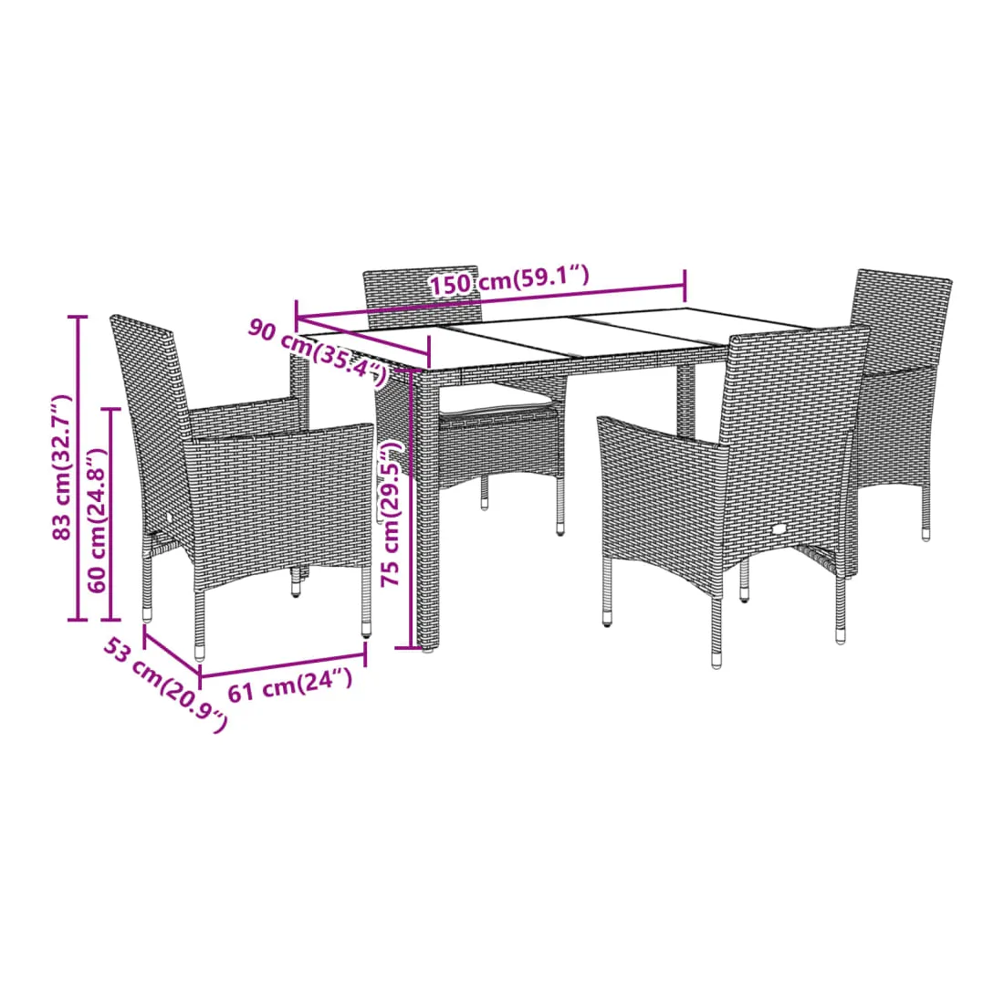 - Matériau : résine tressée, acier enduit de poudre, verre trempé