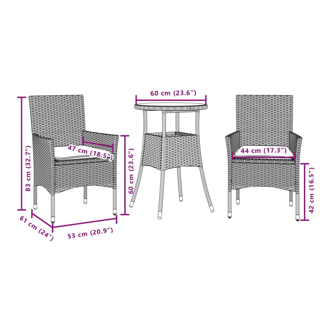 - Hauteur du siège à partir du sol (sans coussin) : 42 cm