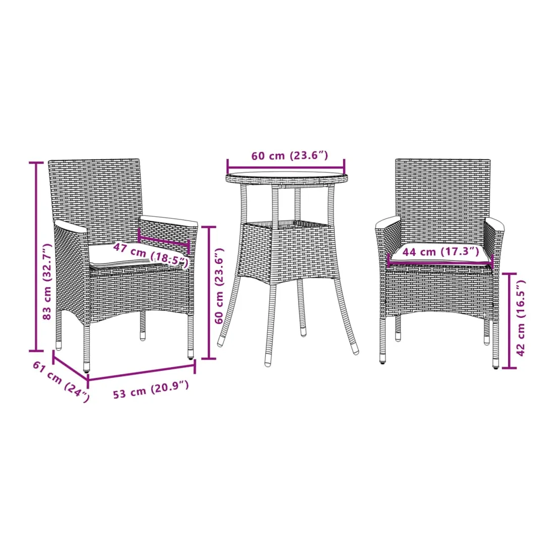 - Hauteur du siège à partir du sol (sans coussin) : 42 cm