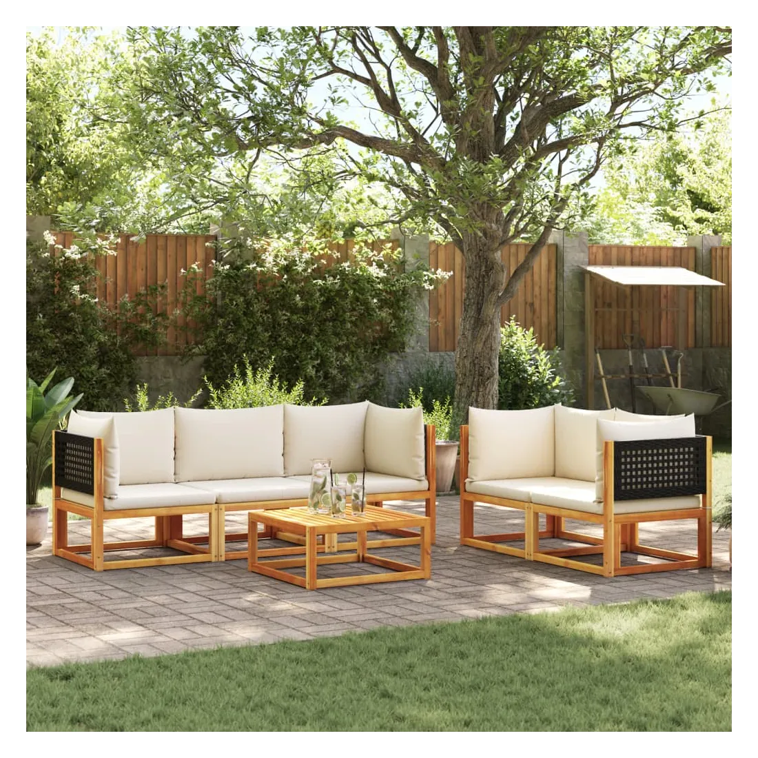 vidaXLCet ensemble de canapé de jardin avec dossiers en rotin tressé est le complément parfait à votre jardin, terrasse ou patio, offrant un espace confortable et accueillant pour discuter en famille et entre amis ou simplement se détendre et profiter du plein air. Dossier tressé élégant : Le canapé de jardin est doté de dossiers en rotin finement travaillés, ajoutant une touche sophistiquée à tout espace extérieur.Cadre robuste et stable : Le bois d'acacia massif est connu pour sa résistance et sa durabilité. Ses couleurs variées et ses motifs de grain uniques lui confèrent une apparence attrayante. Avec une bonne stabilité et une bonne résistance aux intempéries, il est idéal pour la fabrication de meubles d'intérieur et d'extérieur. Expérience d'assise confortable : Ce mobilier d'extérieur, doté de coussins épais et rembourrés, offre une expérience d'assise confortable.Bien ventilé et anti-accumulation : La conception à lattes favorise une circulation d'air optimale et empêche efficacement l'accumulation d'eau, garantissant un mobilier de jardin sec et confortable.Housse amovible et lavable : Ces coussins d'assise sont dotés de housses amovibles pour un lavage et un entretien faciles.Conception modulaire : Ce mobilier d'extérieur a une conception modulaire, ce qui le rend entièrement flexible et facile à déplacer, vous permettant ainsi de créer un aménagement de mobilier d'extérieur personnalisé. Bon à savoir :Pour que votre mobilier d'extérieur reste beau, nous vous recommandons de le protéger avec une housse imperméable.