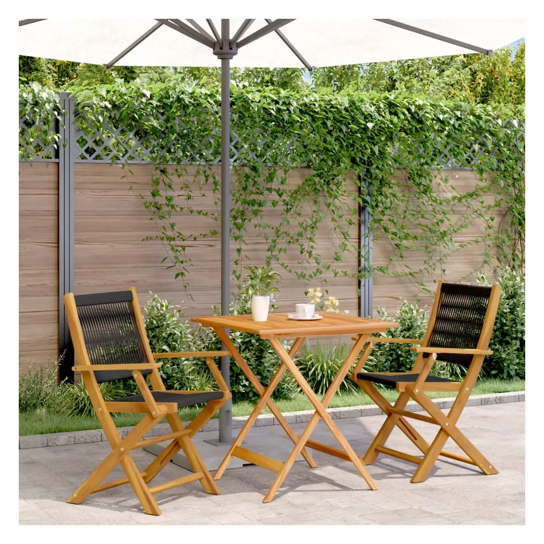 Savourez une tasse de café ou discutez avec votre famille et vos amis dans le jardin, l'arrière-cour ou sur le balcon avec cet ensemble de bistro ! Robuste et stable : le bois d'acacia massif est connu pour sa solidité et sa durabilité. Ses couleurs variées et ses grains uniques lui confèrent un aspect attrayant. Sa stabilité et sa résistance aux intempéries en font un matériau idéal pour la fabrication de meubles d'intérieur et d'extérieur.Conception pratique : la main courante en bois, pratique et plate, vous permet de poser vos mains dessus tout en profitant d'un moment en plein air.Dessus de table robuste : la table d'extérieur offre un excellent support pour accueillir vos boissons, collations, corbeilles de fruits et vos décorations préférées.Design pliable : la table et les chaises de salle à manger d'extérieur peuvent être facilement repliées lorsqu'elles ne sont pas utilisées pour faciliter le rangement et le transport. Bon à savoir :Pour que vos meubles d'extérieur restent beaux, nous vous recommandons de les protéger avec une housse imperméable.