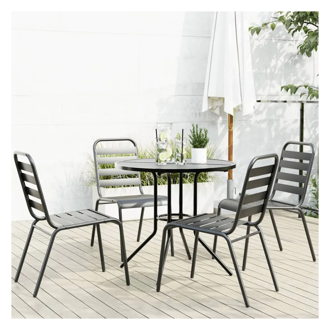 Cet ensemble de chaises de jardin avec un look élégant est un supplément frappant à votre espace de vie actuel, à l'extérieur ainsi qu'à l'intérieur. Acier enduit de poudre : cet ensemble de bar de jardin est fabriqué en acier enduit de poudre, un matériau exceptionnellement dur et solide. Elle offre robustesse et stabilité. Le revêtement en poudre de la surface de l'acier crée une couche protectrice contre la rouille, la corrosion et l'usure.Siège confortable : la chaise d’extérieur, avec son siège à lattes et son dossier incurvé, s’adapte à votre corps et offre un confort optimal.Fonction empilable : la conception empilable des chaises permet d'économiser de l'espace.Dessus de table en maille : le dessus de table en maille présente de jolis motifs et convient pour placer des boissons, de la nourriture et d'autres articles essentiels.Multifonctionnel : cet ensemble de chaises d'extérieur multifonctionnel présente une forme parfaite pour s'adapter à tous les environnements de votre maison. Il peut être utilisé dans la cuisine, la salle à manger, le salon, le patio, etc.
