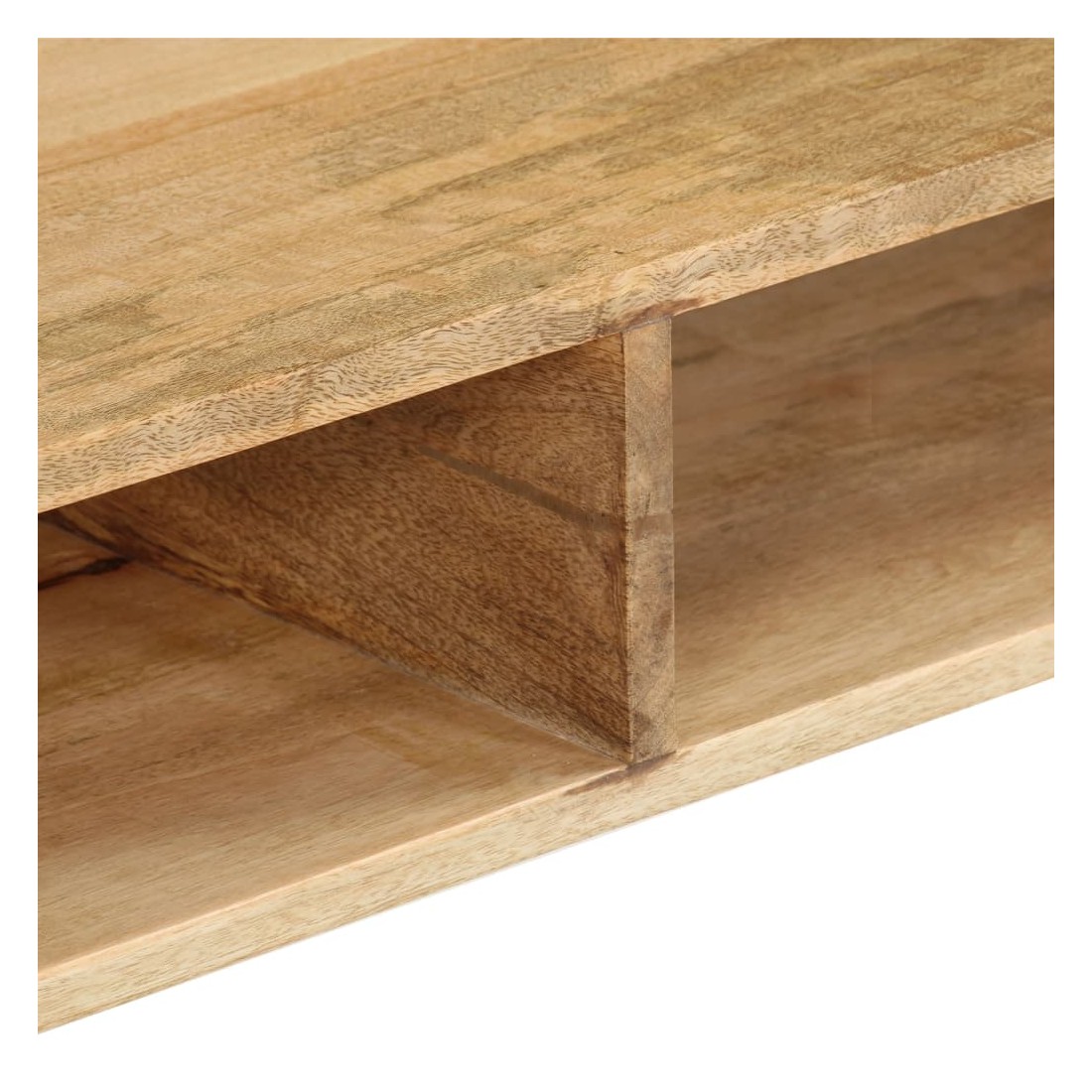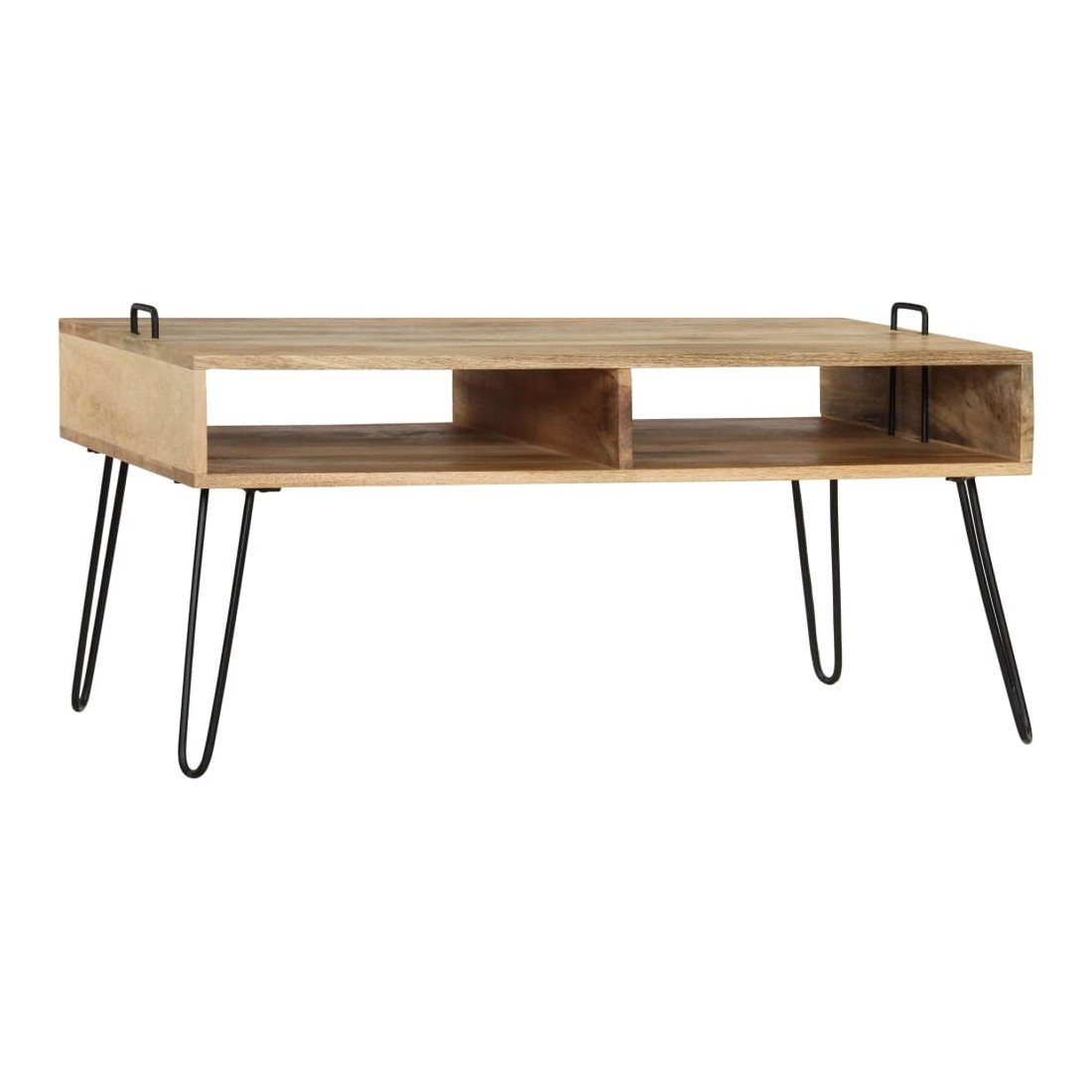 La table basse en bois sera un ajout indémodable à la décoration de votre salon. Construite en bois de manguier massif et avec des cadres en acier robuste, la table est très stable et durable. Le dessus de table est idéal pour placer des paniers de fruits, des vases, des plantes en pot ou d'autres objets décoratifs. L'étagère offre un espace de rangement supplémentaire pour ranger toutes sortes de petits objets de façon ordonnée. Les cadres en acier rehaussent la robustesse de la table ainsi que son style industriel. Chaque étape du processus de construction est réalisée avec le plus grand soin, que ce soit le polissage ou le laquage. La table est facile à assembler. Remarque importante : les couleurs et les grains de bois peuvent varier d'une pièce à l'autre, ce qui rend chaque pièce unique et légèrement différente l'une de l'autre. La livraison est aléatoire, ce qui garantit l'exclusivité et l'individualité de votre produit.