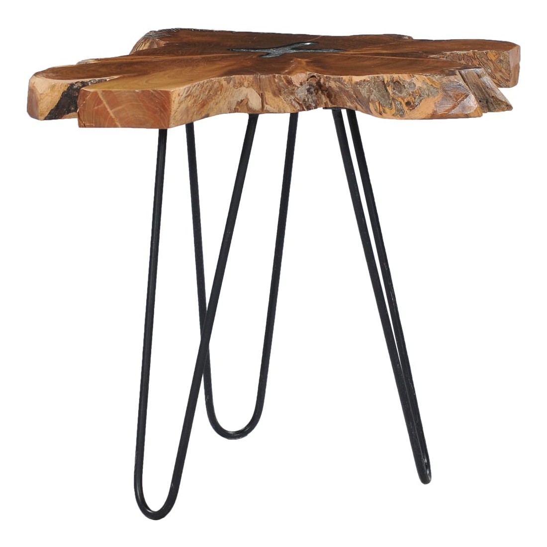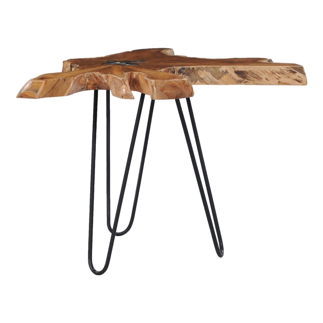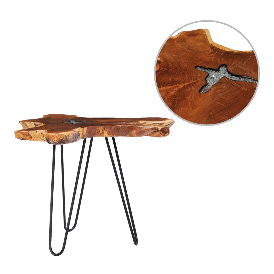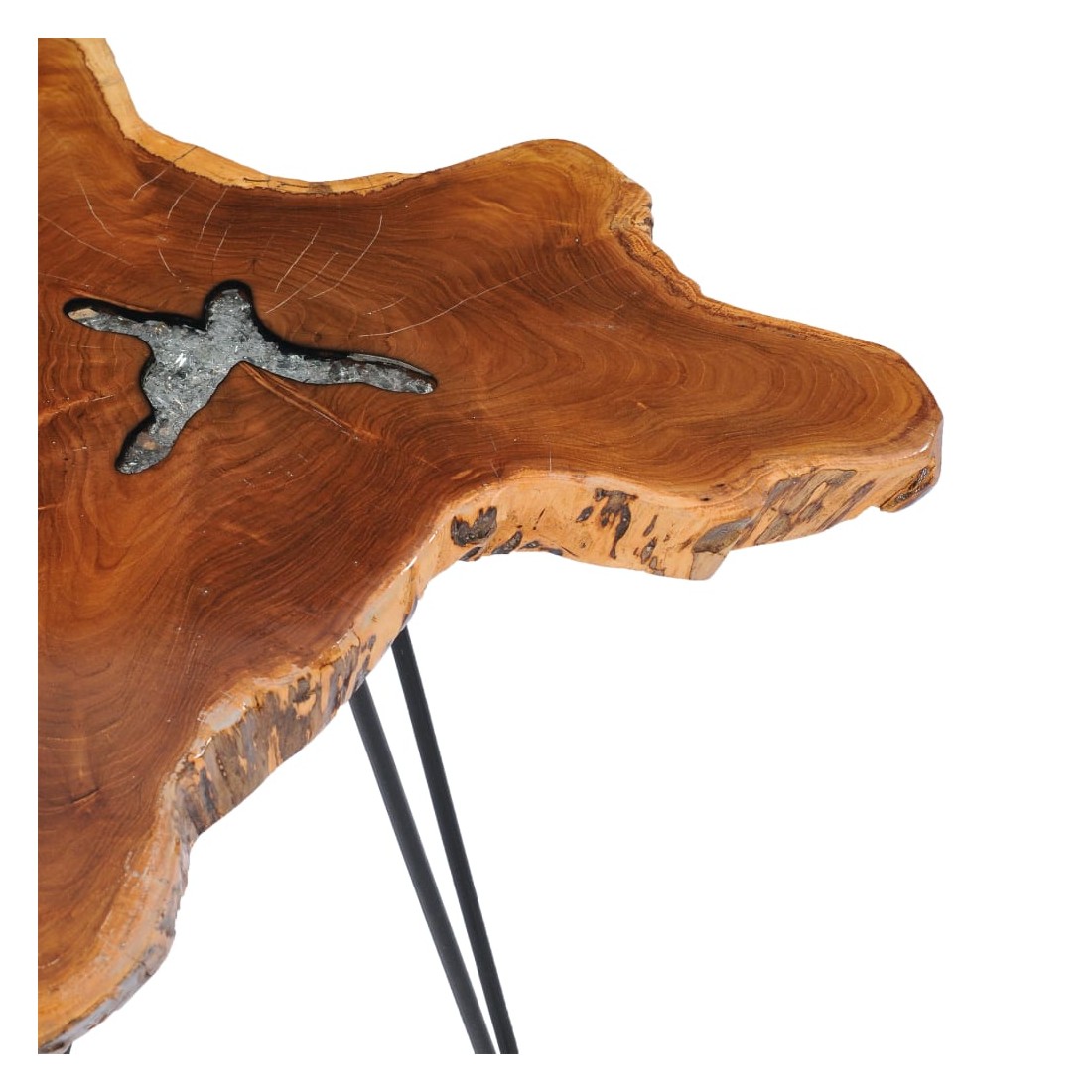 Cette table basse unique en bois de teck solide avec une décoration en polyrésine transparente dégage un charme rustique et attire tous les regards. Son dessus de table distinctif fournit une surface stable et sécurisée sur laquelle vous pouvez placer vos boissons, vases, bols de fruits ou ornements. Le dessus de table est fait d’une vraie racine de teck, ce qui donnera une impression visuelle audacieuse. Le dessus de table est entièrement fait à la main et le savoir-faire ajoute à son apparence luxueuse. Fabriqué en bois dur de teck extrêmement durable, cette table en teck a été chevronnée, séchée au four puis sablée pour lui donner un aspect très lisse. Le bois de teck est reconnu pour sa résistance exceptionnelle aux intempéries. Le bois de teck est le choix idéal si vous souhaitez acheter un meuble durable. La base est en acier robuste avec une finition de peinture noire. L'assemblage est vraiment facile. Note importante : car le bois est un produit naturel, les couleurs, les formes et les motifs des grains varient d'une pièce à l'autre, rendant chacune de nos tables basses unique et différente l'une de l'autre. La livraison est aléatoire, ce qui garantit l'exclusivité et l'individualité de votre produit.