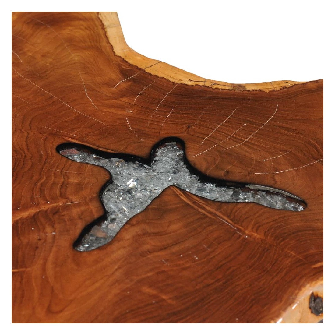 • Matériau du dessus de table : bois de teck massif avec finition laquée transparente + polyrésine transparente avec verre concassé