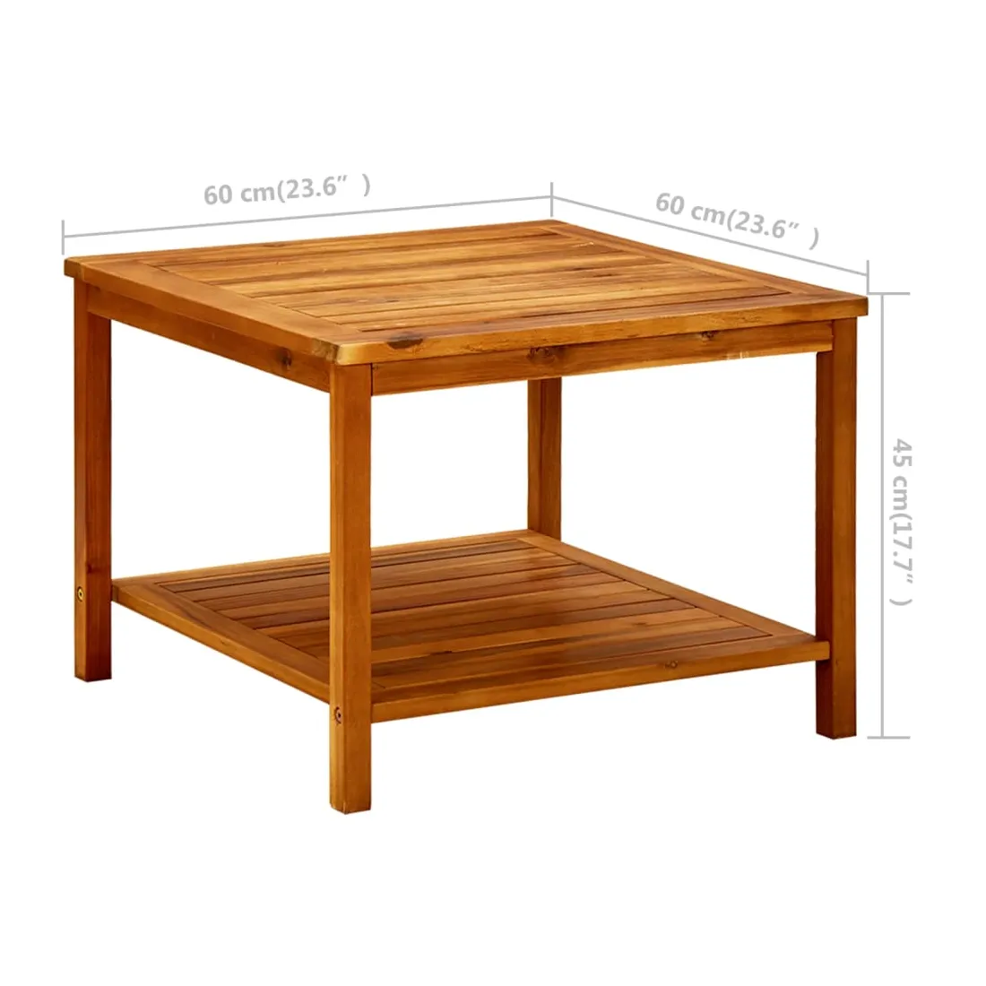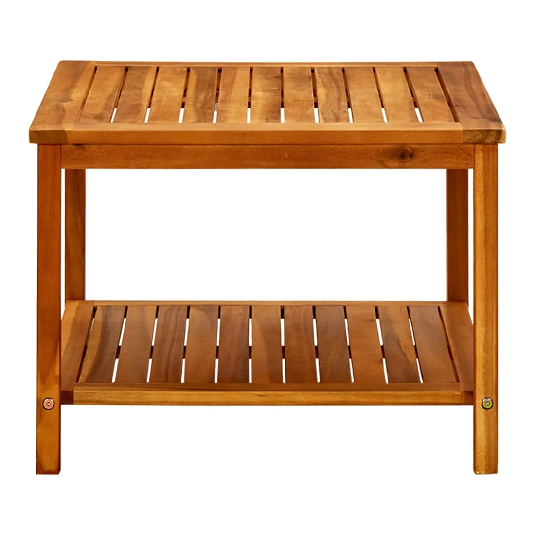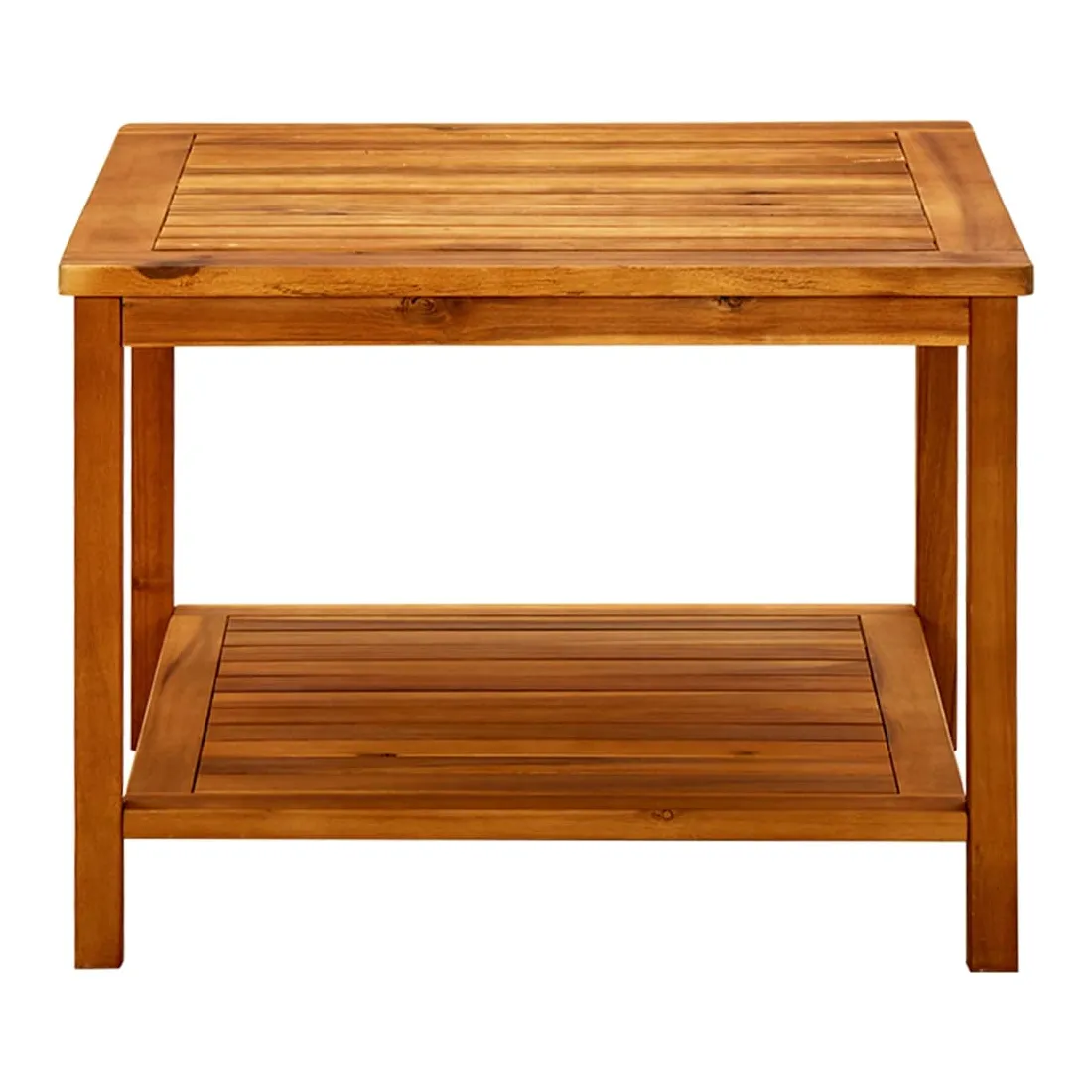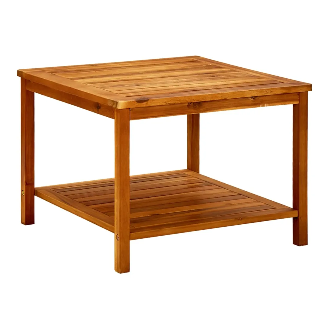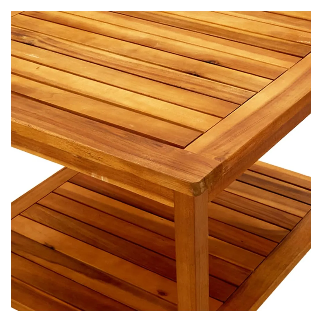 Profitez d'un café convivial en famille ou entre amis autour de cette élégante table basse en bois ! Cette table est faite de bois d'acacia massif avec une finition à l'huile, qui est résistant aux intempéries et durable. Chaque étape du processus est réalisée avec le plus grand soin, qu'il s'agisse de polissage ou de laquage. Le dessus de table robuste avec un design à lattes vous offre de l'espace pour mettre des collations, des paniers de fruits, des objets de décoration, ainsi que d'autres éléments essentiels. La table d'appoint comprend également une étagère inférieure offrant un espace supplémentaire pour ranger vos articles essentiels et les garder à portée de main. Remarque importante : les couleurs et les grains varient d'une pièce à l'autre, rendant chaque meuble unique. La livraison est aléatoire, ce qui garantit l'exclusivité et l'individualité de votre produit. Remarque : Afin de prolonger la durée de vie de vos meubles d'extérieur, nous vous recommandons de les nettoyer régulièrement et de ne pas les laisser à l'extérieur sans protection inutilement.Nettoyage : Utiliser une solution savonneuse douce.Stockage : Si possible, stockez dans un endroit frais et sec à l'intérieur. Si le produit est stocké à l'extérieur, protégez-le avec une housse imperméable. Essuyez et séchez l'excès d'eau ou de neige des surfaces planes après la pluie ou une chute de neige. Permettez une circulation d'air suffisante afin d'éviter les dommages liés à l'humidité.