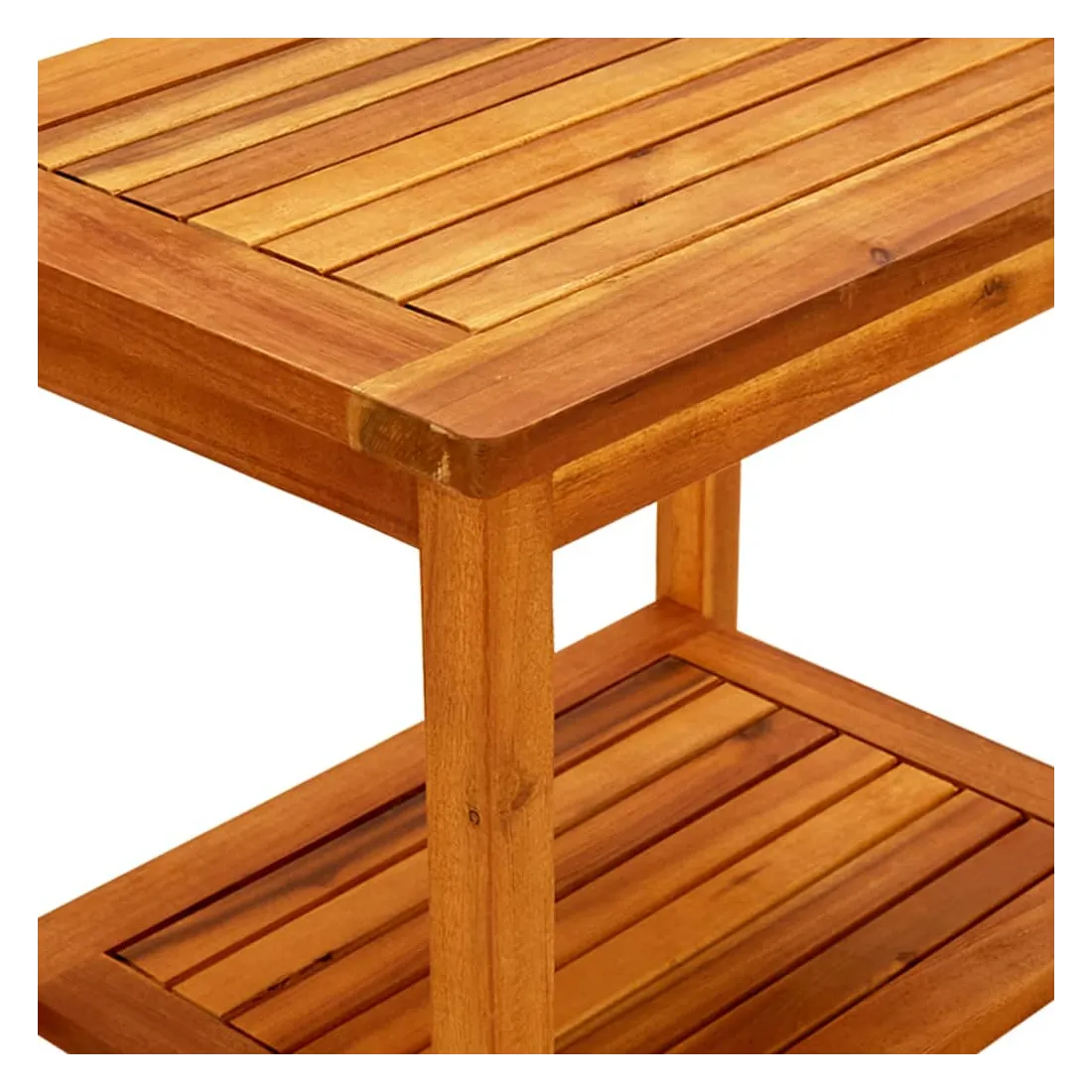 Profitez d'un café convivial en famille ou entre amis autour de cette élégante table basse en bois ! Cette table est faite de bois d'acacia massif avec une finition à l'huile, qui est résistant aux intempéries et durable. Chaque étape du processus est réalisée avec le plus grand soin, qu'il s'agisse de polissage ou de laquage. Le dessus de table robuste avec un design à lattes vous offre de l'espace pour mettre des collations, des paniers de fruits, des objets de décoration, ainsi que d'autres éléments essentiels. La table d'appoint comprend également une étagère inférieure offrant un espace supplémentaire pour ranger vos articles essentiels et les garder à portée de main. Remarque importante : les couleurs et les grains varient d'une pièce à l'autre, rendant chaque meuble unique. La livraison est aléatoire, ce qui garantit l'exclusivité et l'individualité de votre produit. Remarque : Afin de prolonger la durée de vie de vos meubles d'extérieur, nous vous recommandons de les nettoyer régulièrement et de ne pas les laisser à l'extérieur sans protection inutilement.Nettoyage : Utiliser une solution savonneuse douce.Stockage : Si possible, stockez dans un endroit frais et sec à l'intérieur. Si le produit est stocké à l'extérieur, protégez-le avec une housse imperméable. Essuyez et séchez l'excès d'eau ou de neige des surfaces planes après la pluie ou une chute de neige. Permettez une circulation d'air suffisante afin d'éviter les dommages liés à l'humidité.
