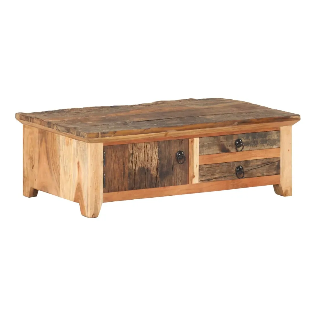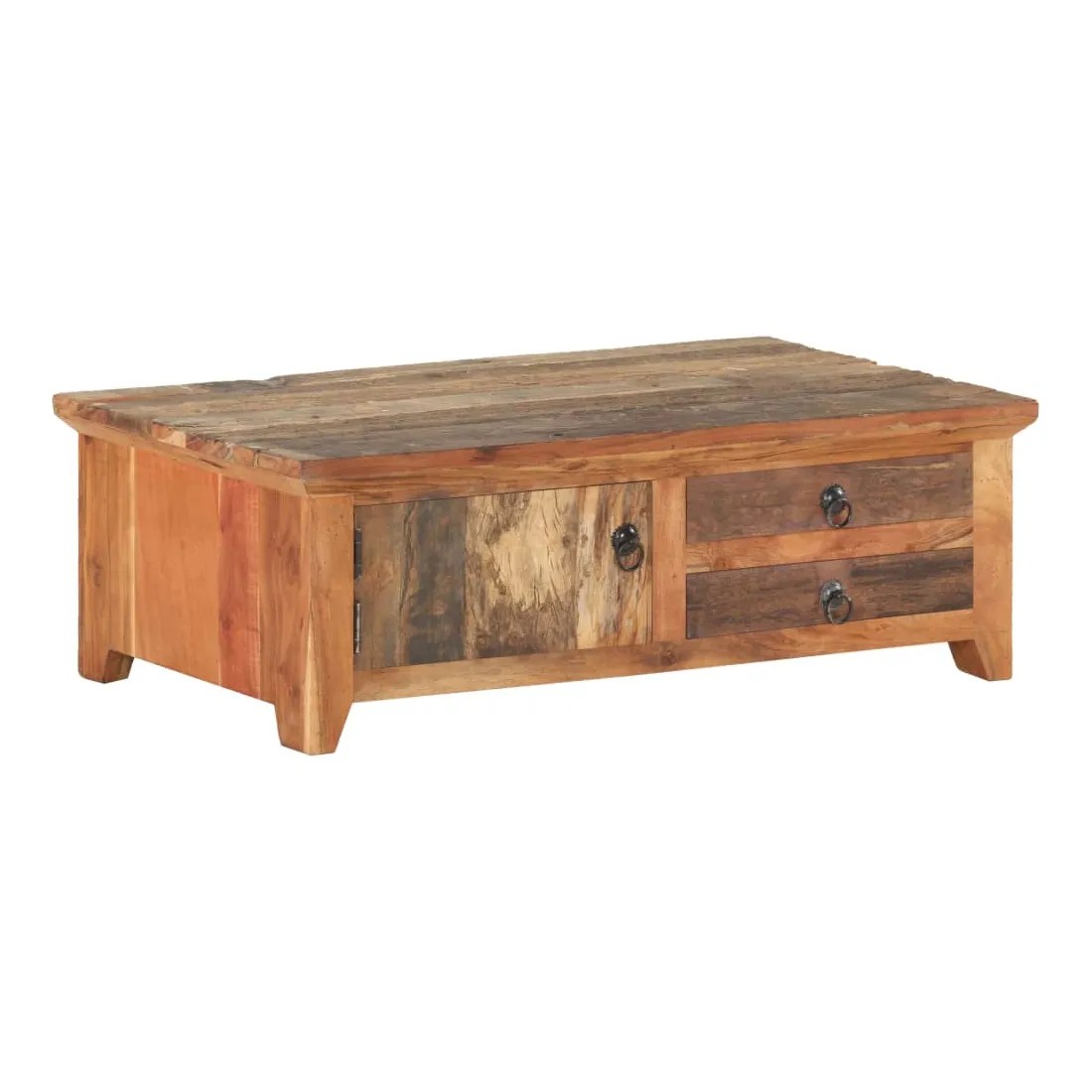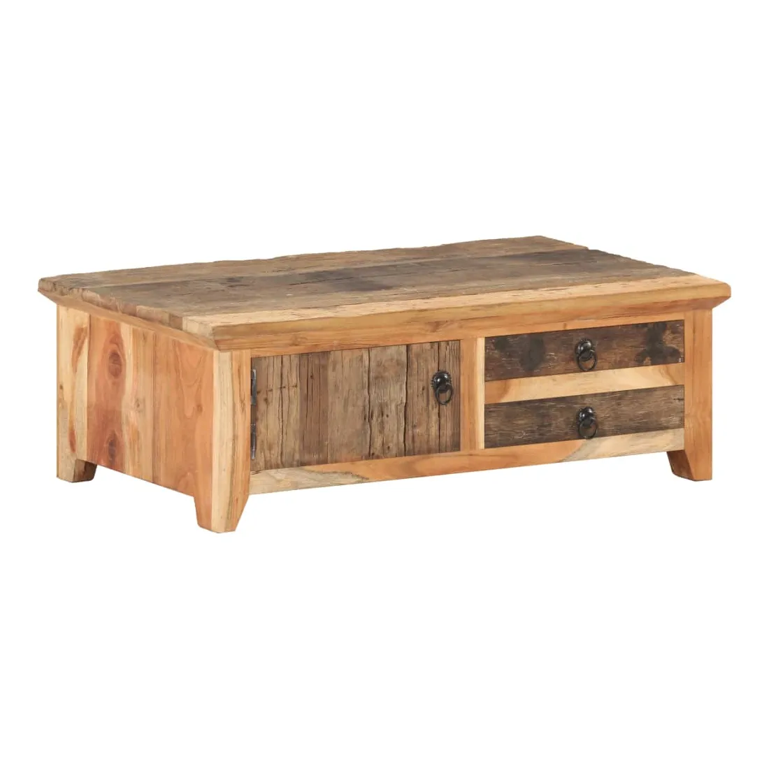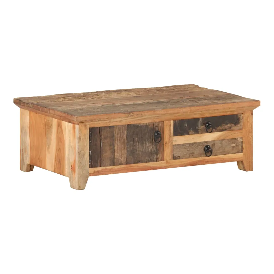 Cette table basse en bois ajoute un look vintage et est un choix parfait pour votre espace de vie existant. Cette table d’appoint est fabriquée à la main à partir de bois massif de récupération, ce qui signifie que chaque meuble est unique et légèrement différent l'un de l'autre. Le bois de récupération est solide, stable, durable et beau. Les signes d’usure et la structure de grain visible donnent à chaque pièce sa propre histoire et un look unique. Le cadre en bois d’acacia massif offre une stabilité supplémentaire à la table. Elle dispose également d’une porte et de deux tiroirs offrant amplement d’espace de rangement pour garder vos articles organisés et à portée de main. Remarque importante : les couleurs et les grains peuvent varier d'une pièce à l'autre, rendant chaque meuble unique. La livraison est également aléatoire.