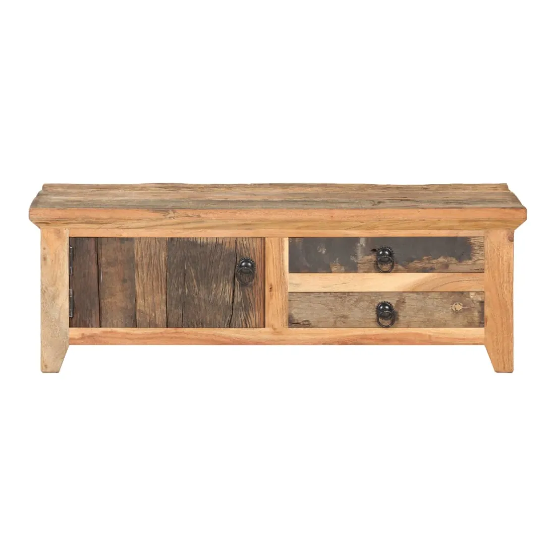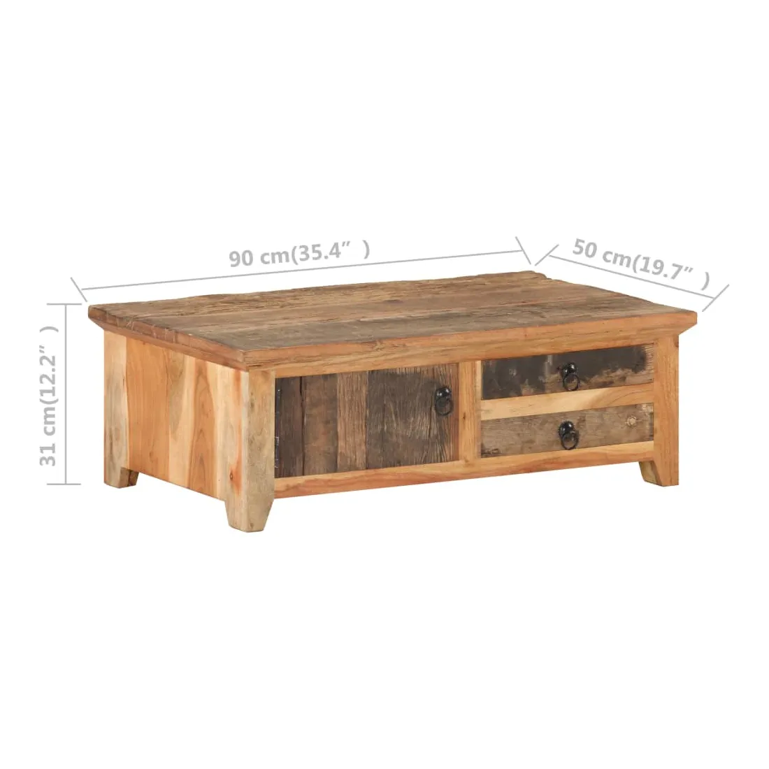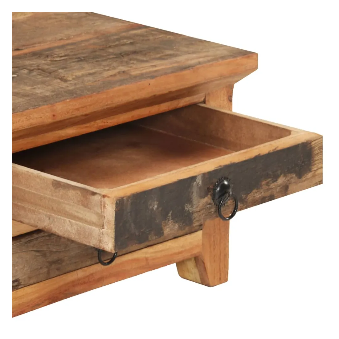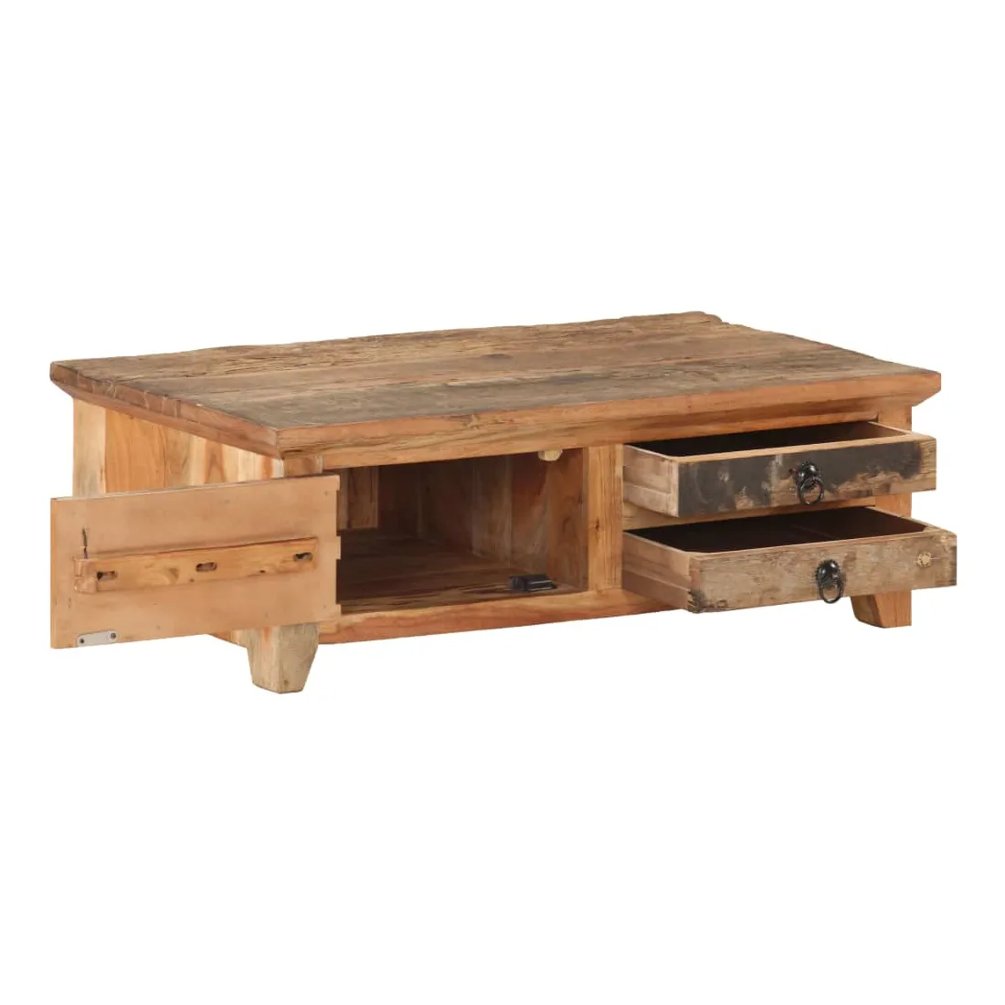 Cette table basse en bois ajoute un look vintage et est un choix parfait pour votre espace de vie existant. Cette table d’appoint est fabriquée à la main à partir de bois massif de récupération, ce qui signifie que chaque meuble est unique et légèrement différent l'un de l'autre. Le bois de récupération est solide, stable, durable et beau. Les signes d’usure et la structure de grain visible donnent à chaque pièce sa propre histoire et un look unique. Le cadre en bois d’acacia massif offre une stabilité supplémentaire à la table. Elle dispose également d’une porte et de deux tiroirs offrant amplement d’espace de rangement pour garder vos articles organisés et à portée de main. Remarque importante : les couleurs et les grains peuvent varier d'une pièce à l'autre, rendant chaque meuble unique. La livraison est également aléatoire.