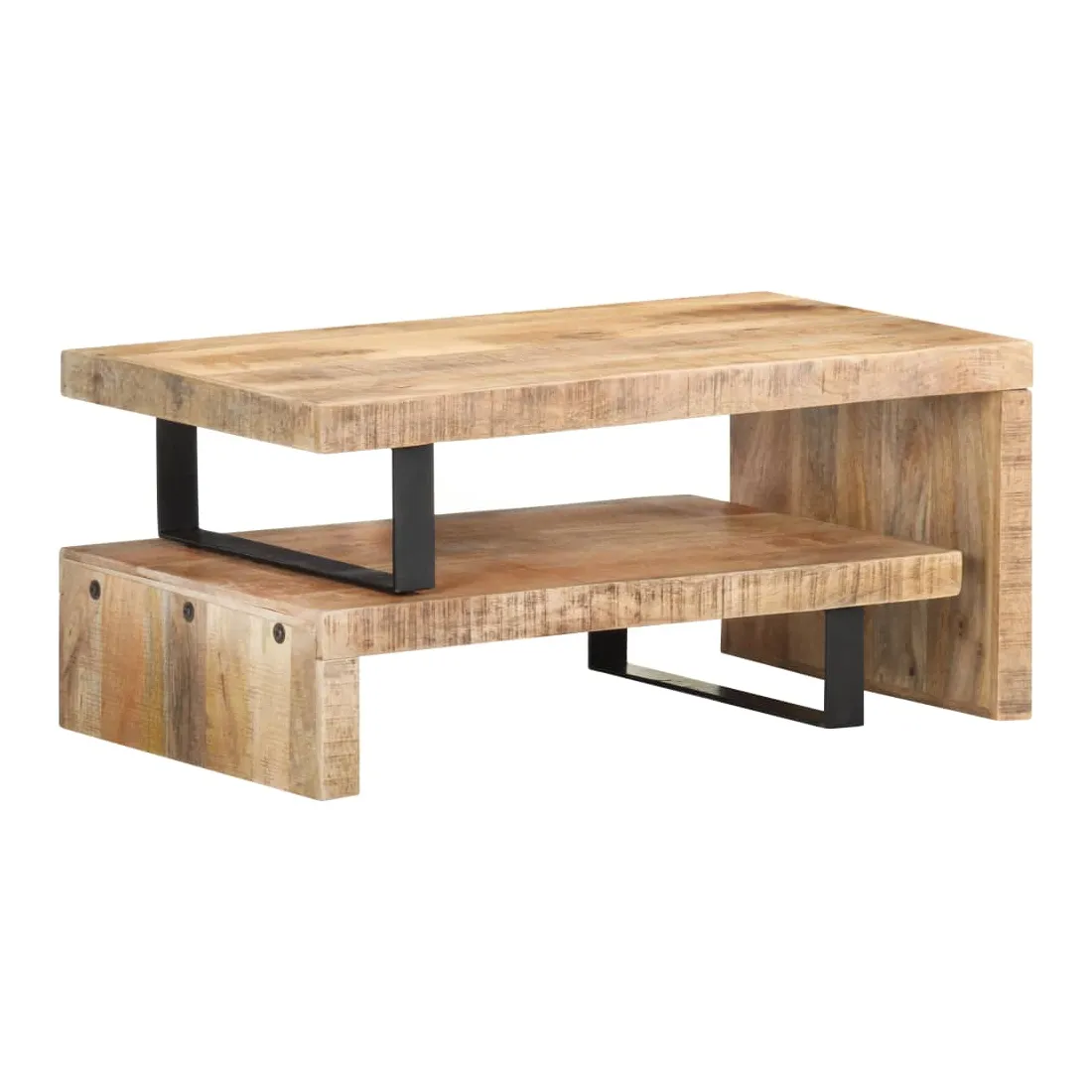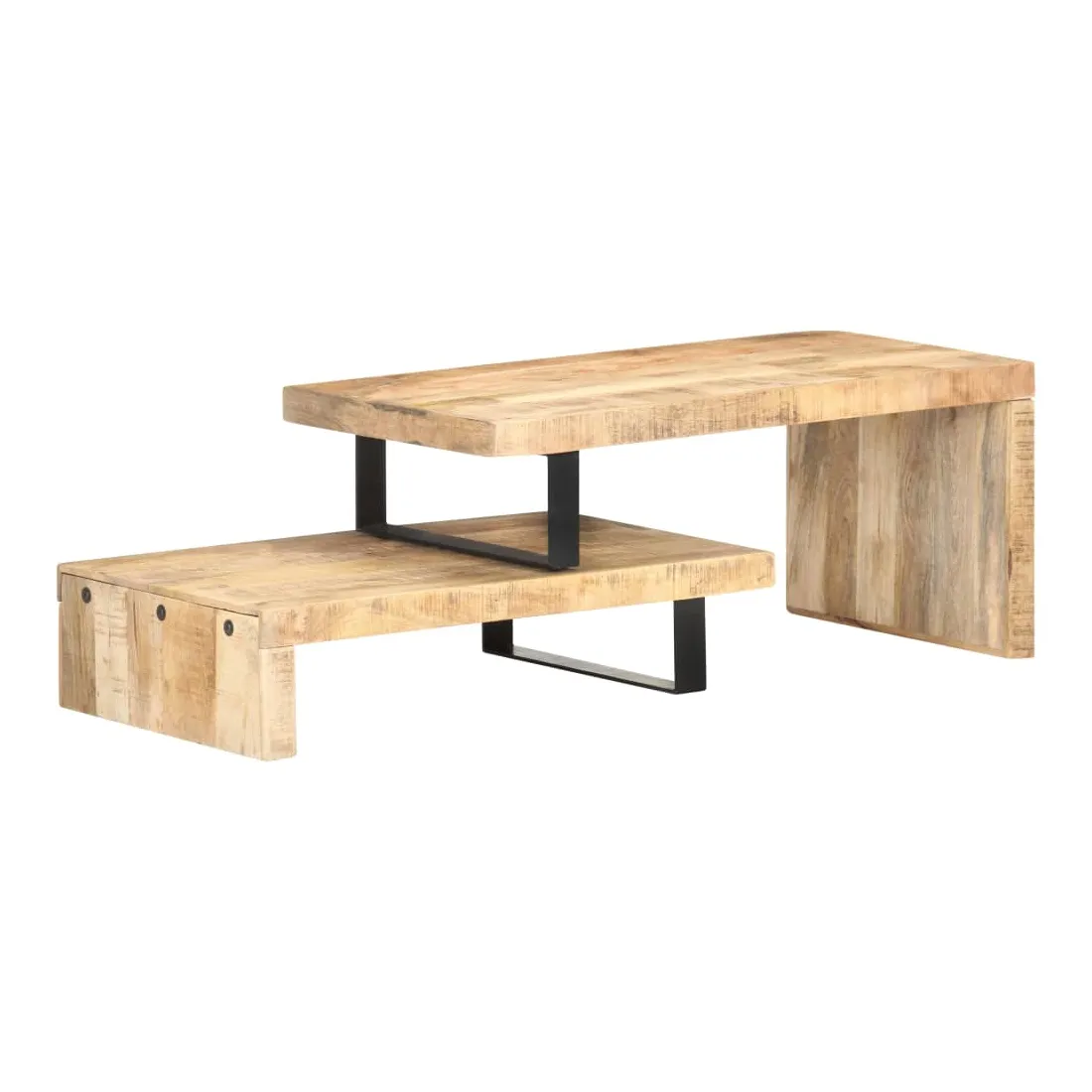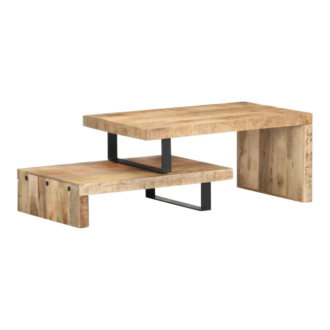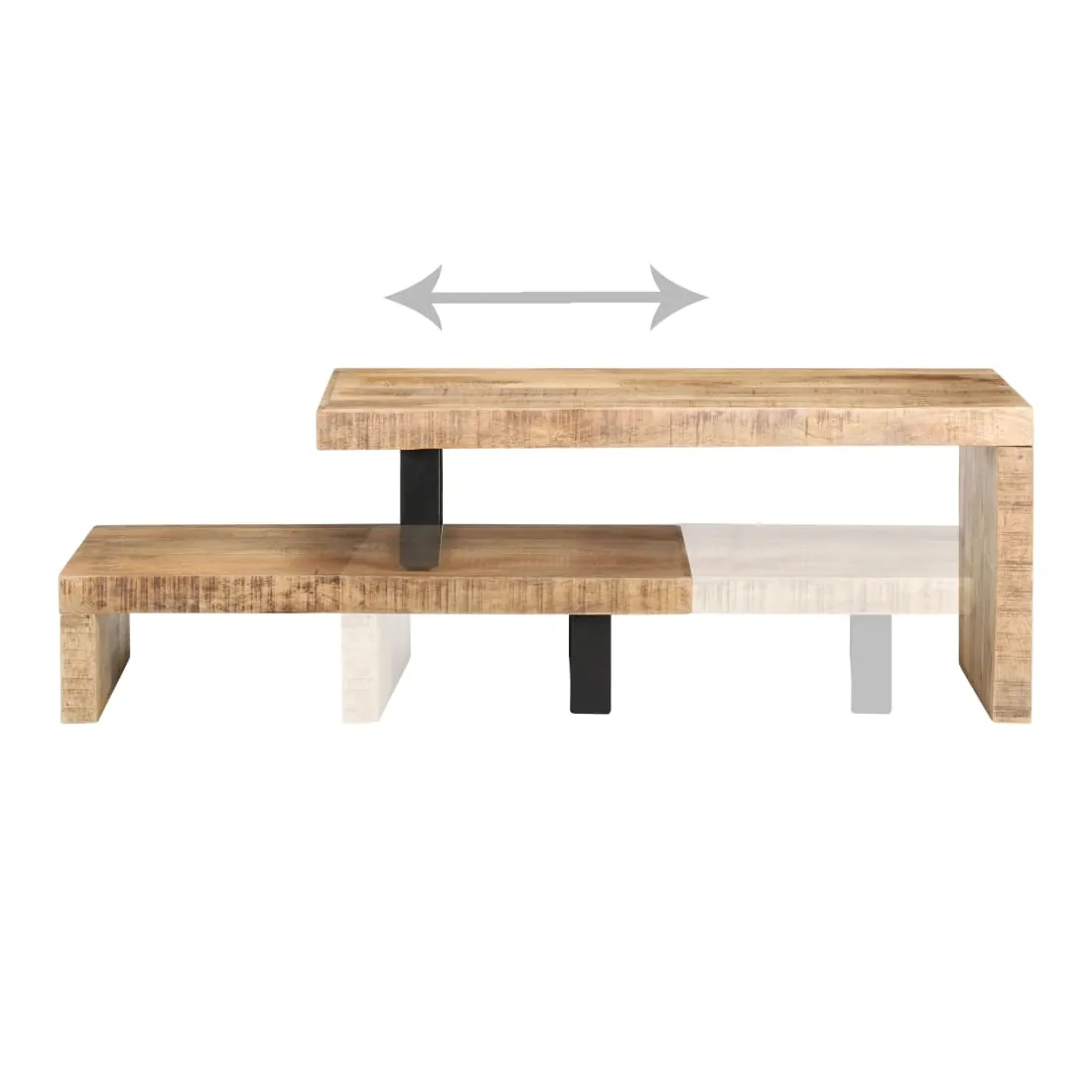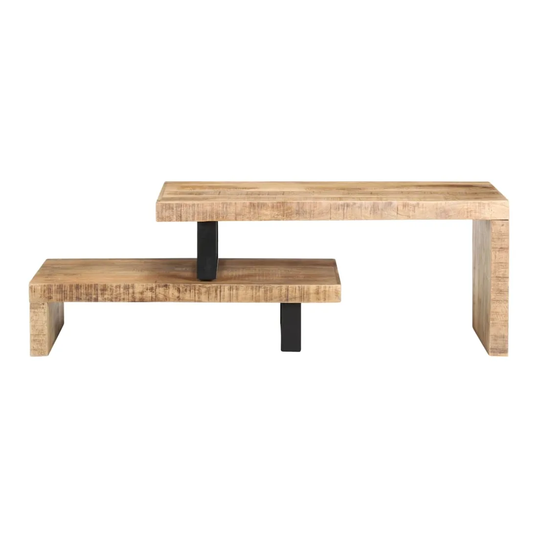 Cet ensemble de table basse, composé d'une table supérieure et d'une table inférieure, est parfait pour apporter une présence classique à votre salon ou bureau. La table centrale est en bois de manguier massif, qui est un bois dur tropical. Il a la force de soutenir le poids et de résister à l'usure du temps. De plus, le savoir-faire exquis et les beaux grains de bois rendent chaque pièce légèrement différente l'une de l'autre. L'ensemble de table contient deux parties, au design unique. Les pieds en fer enduit de poudre ajoutent à sa stabilité et robustesse. Son dessus de table robuste est parfait pour placer des boissons, des bols à fruits ou des ornements. De plus, l'étagère sous le dessus de table offre suffisamment d'espace pour garder vos magazines, livres et autres petits articles essentiels organisés et à portée de main. En outre, l'ensemble de table basse est réglable en longueur pour s'adapter à d'autres dispositions. Remarque importante : les couleurs varient d'une pièce à l'autre, rendant chaque pièce unique. La livraison est aléatoire, garantissant l'exclusivité et l'individualité de votre produit.