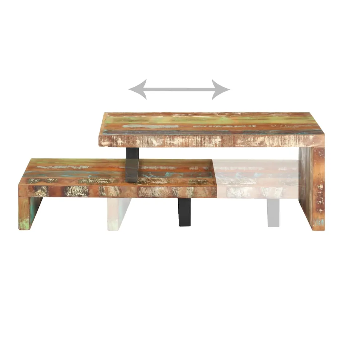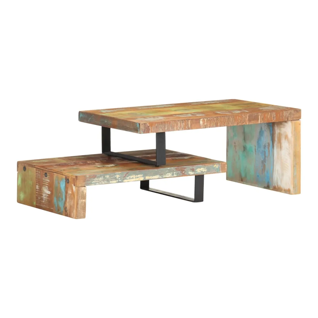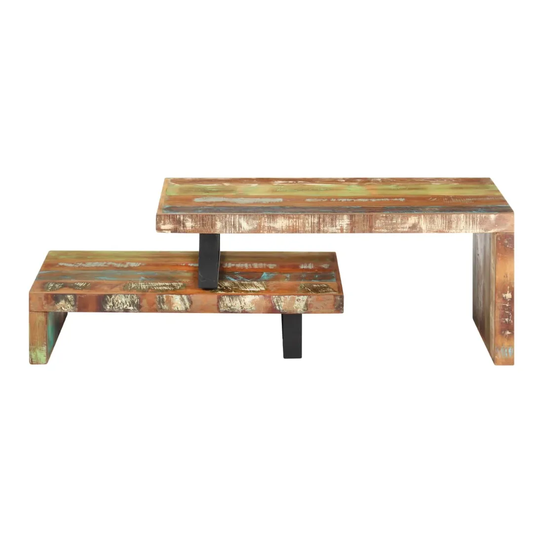 Cet ensemble de table basse, composé d'une table supérieure et d'une table inférieure, est parfait pour apporter une présence classique à votre salon ou bureau. La table centrale est faite de bois de récupération provenant de solives, de planchers et de poutres de support d'anciens bâtiments étant démolis et peut comprendre de différents types de bois comme le pin, le teck, le hêtre, le chêne, le cèdre, le manguier, l'acacia , etc. Cela signifie que le bois de récupération conserve les caractéristiques de ces différents types de bois. Le bois de récupération est déjà vieilli, patiné et séché, il ne rétrécit pas et ne se plie pas. Cette table centrale est entièrement faite à la main et les beaux grains de bois rendent chaque meuble unique et légèrement différent l'un de l'autre. L'ensemble de table contient deux parties, au design unique. Les pieds en fer enduit de poudre ajoutent à sa stabilité et robustesse. Son dessus de table robuste est parfait pour placer des boissons, des bols à fruits ou des ornements. De plus, l'étagère sous le dessus de table offre suffisamment d'espace pour garder vos magazines, livres et autres petits articles essentiels organisés et à portée de main. En outre, l'ensemble de table basse est réglable en longueur pour s'adapter à d'autres dispositions. Remarque importante : les couleurs varient d'une pièce à l'autre, rendant chaque pièce unique. La livraison est aléatoire, garantissant l'exclusivité et l'individualité de votre produit.