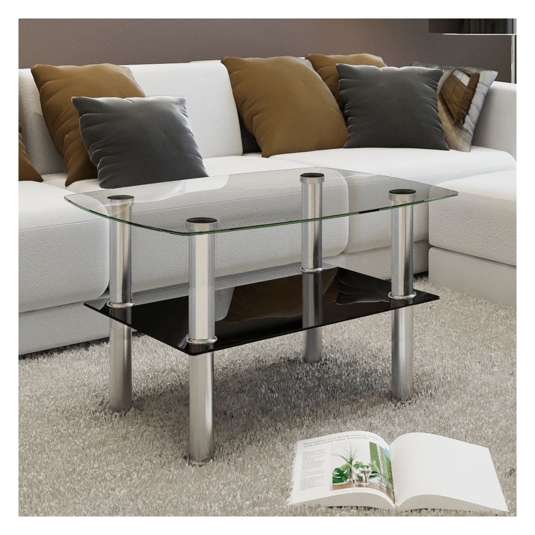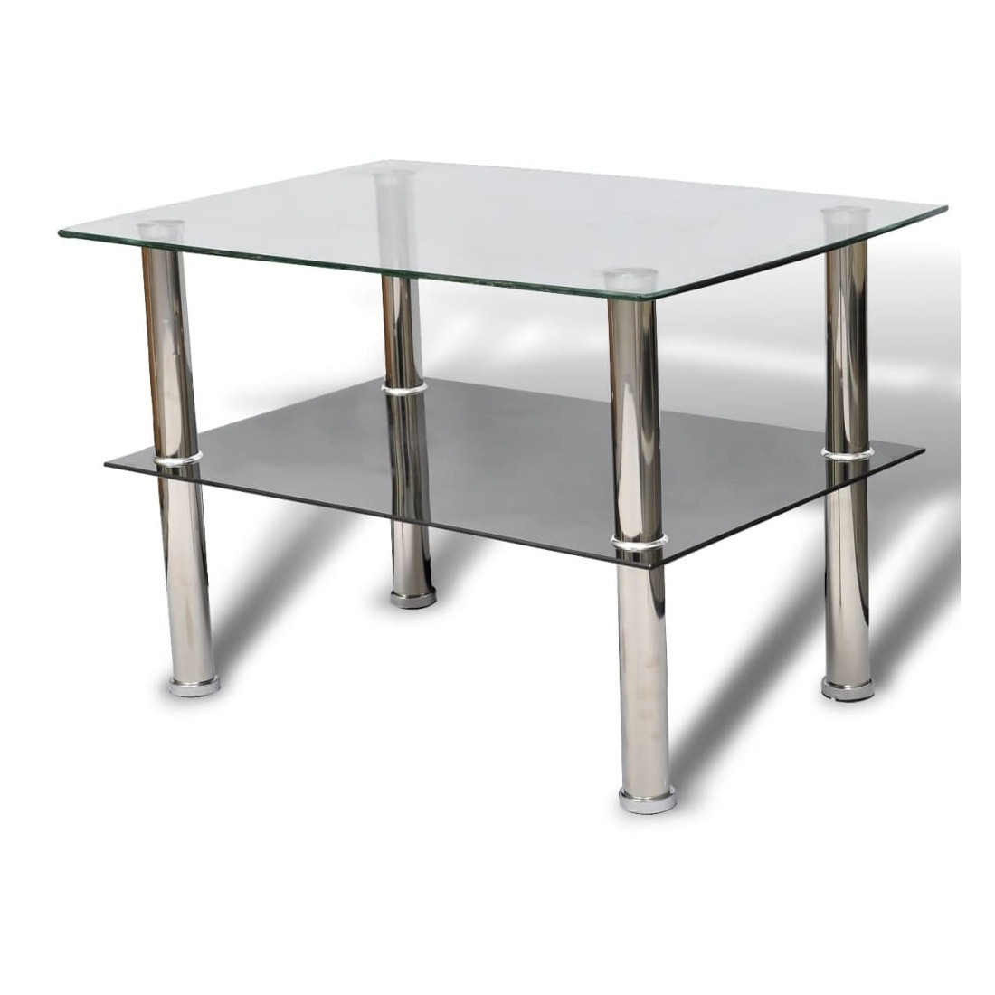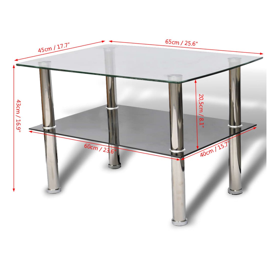 Cette table basse / table d'appoint en verre peut être placée à l'emplacement commercial tel que la cantine, le café, le bar, l'hôtel et dans votre salon à la maison. Son design tendance à 2 niveaux en fait un excellent ajout à n'importe quel décor. La table basse est conçue avec le verre trempé et les jambes vigoureuses d'acier inoxydable. Il y a suffisamment d'espace entre la table et l'étagère pour garder vos affaires.