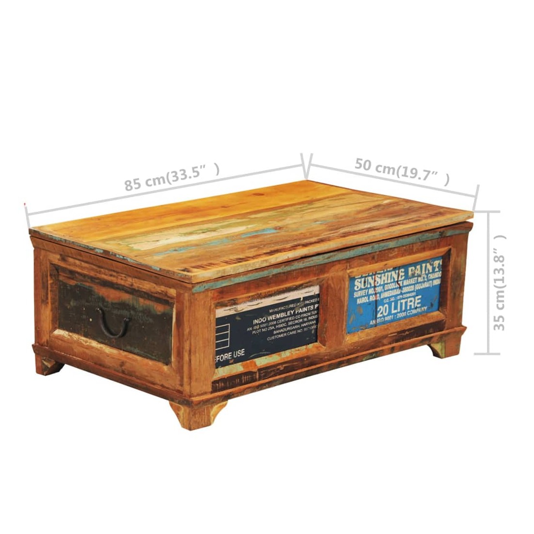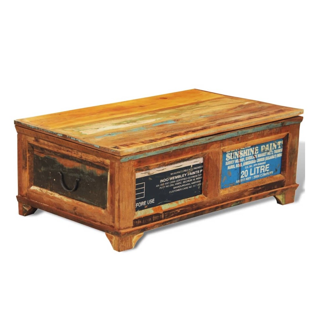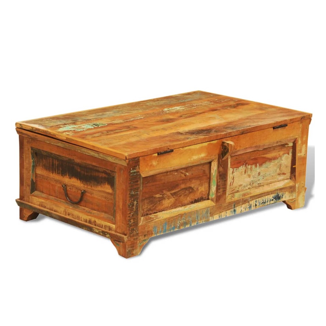 Cette table basse en bois de style antique, avec un grand compartiment sous le couvercle, est un accessoire attrayant et intemporel pour votre maison. Que vous soyez à la recherche d'une table basse pour y déposer vos aliments et boissons ou d'une boîte avec fonction de rangement, cette table 2-en-1 est le choix parfait pour vous. Cette table basse exotique est faite de bois de récupération, ce qui signifie que chaque meuble est unique et légèrement différent l'un de l'autre. Le meuble fabriqués en bois récupéré a des caractéristiques de différents bois comme le bois de teck, l'acacia, le bois de manguier, le bois de saal etc. Le bois de récupération est solide, stable, durable et beau. Garder ce meuble à la maison montrera votre concept de conservation des ressources, de protection de