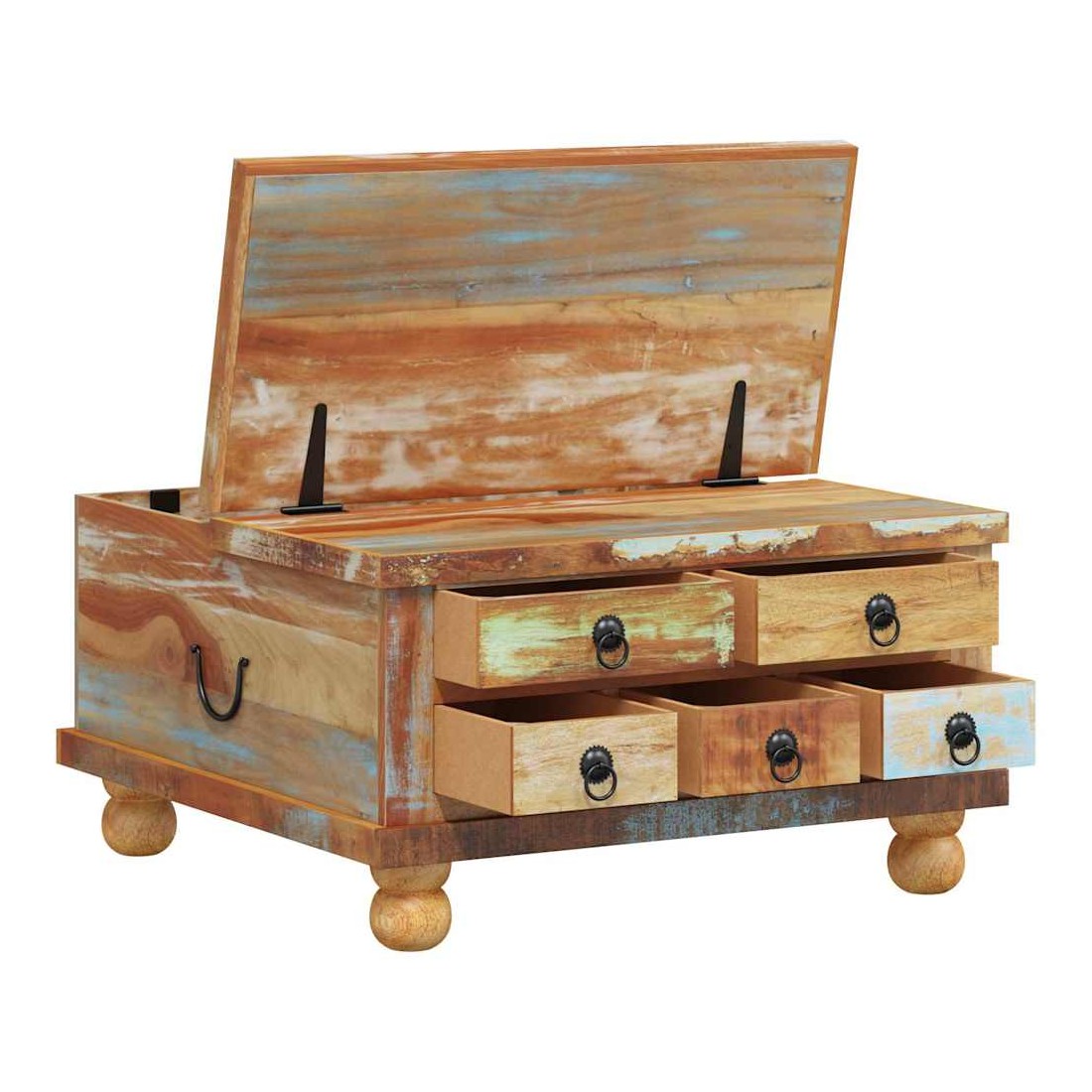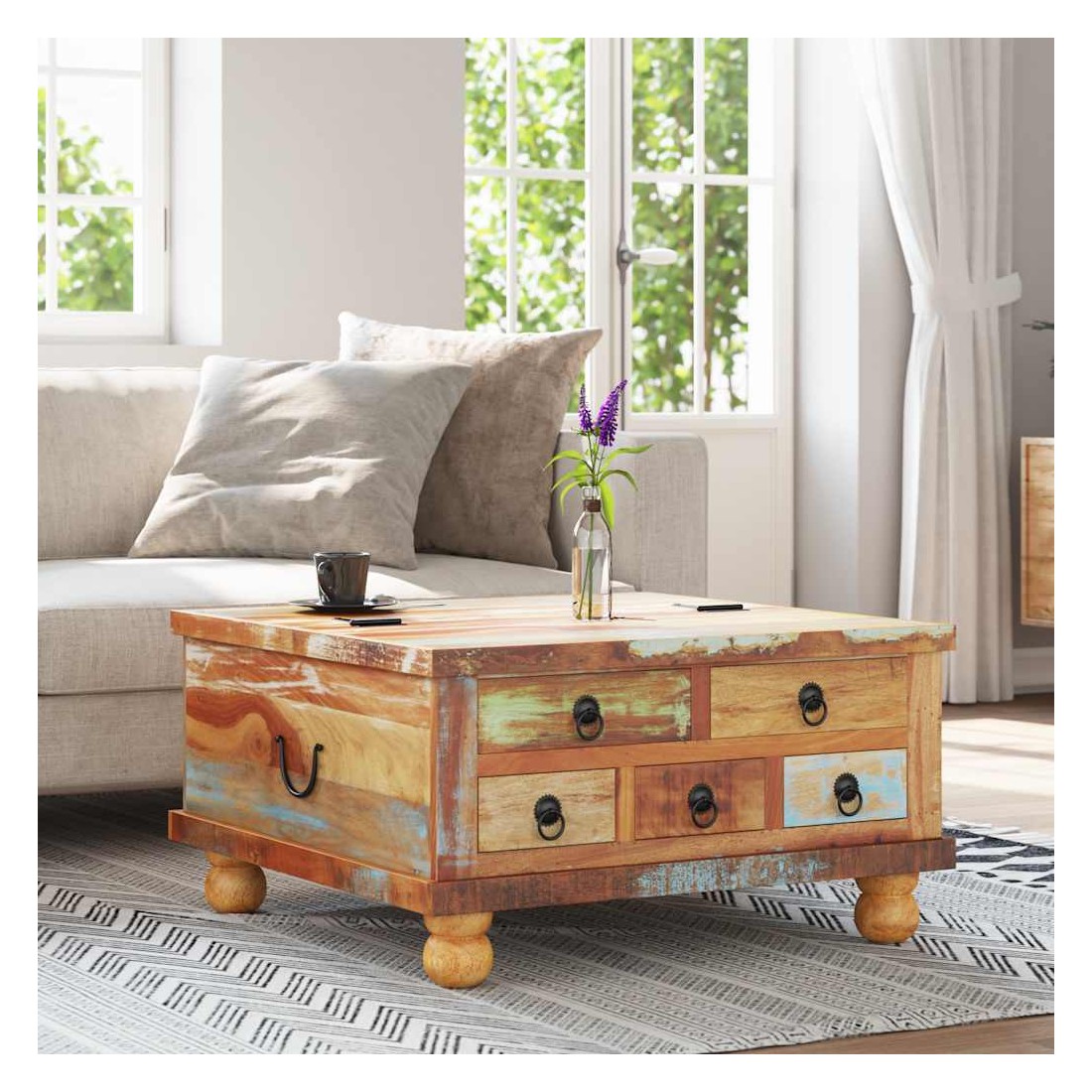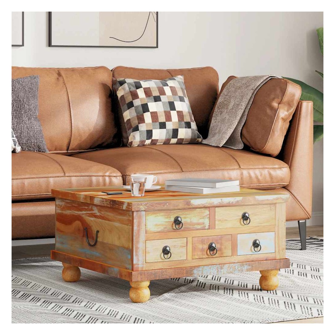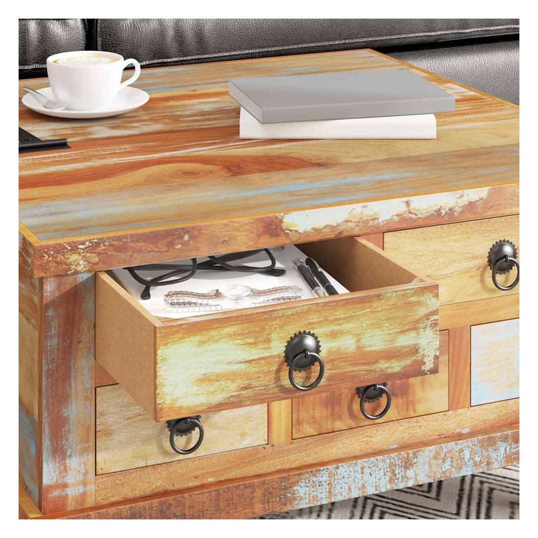 Cette table basse en bois de style industriel dégage un charme vintage et sera une addition intemporelle à votre maison. La table basse peut également être utilisée comme table d'appoint ou table de chevet. La table basse rétro est faite à la main en bois de récupération qui est stable, durable et beau, et a les caractéristiques de différents bois comme teck, manguier, acacia, bois recyclé, bois dur, etc. Chaque étape du processus est réalisé avec le plus grand soin, qu'il s'agisse du polissage, de la peinture ou du laquage. L'artisanat et les beaux grains de bois rendent chaque meuble unique et légèrement différent l'un de l'autre. De plus, les 5 tiroirs et le grand compartiment intérieur offrent amplement d'espace pour tous les articles que vous souhaitez garder à portée de main. Remarque importante : les couleurs varient d'une pièce à l'autre, rendant chacune de nos tables unique. La livraison est aléatoire, ce qui garantit l'exclusivité et l'individualité de votre produit.