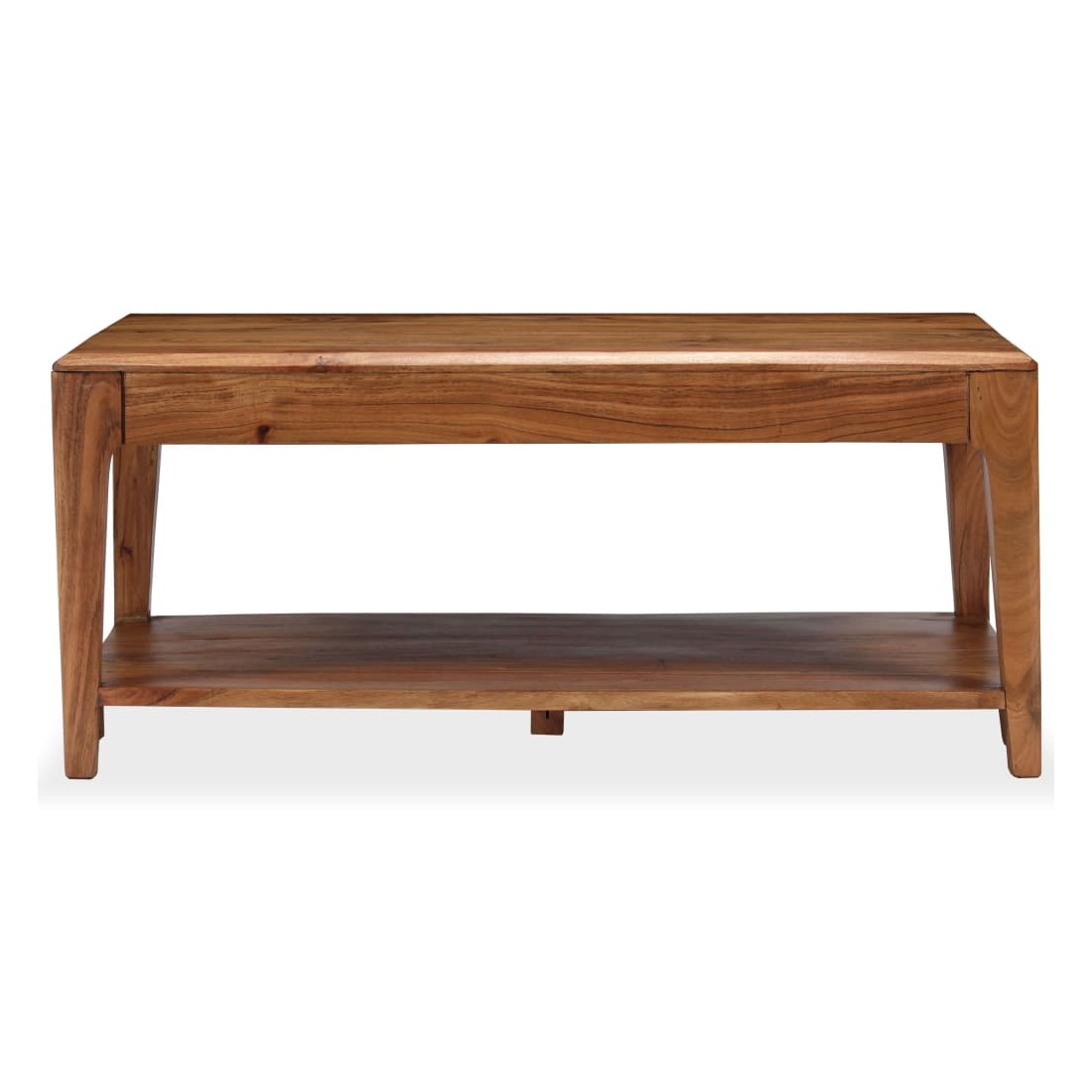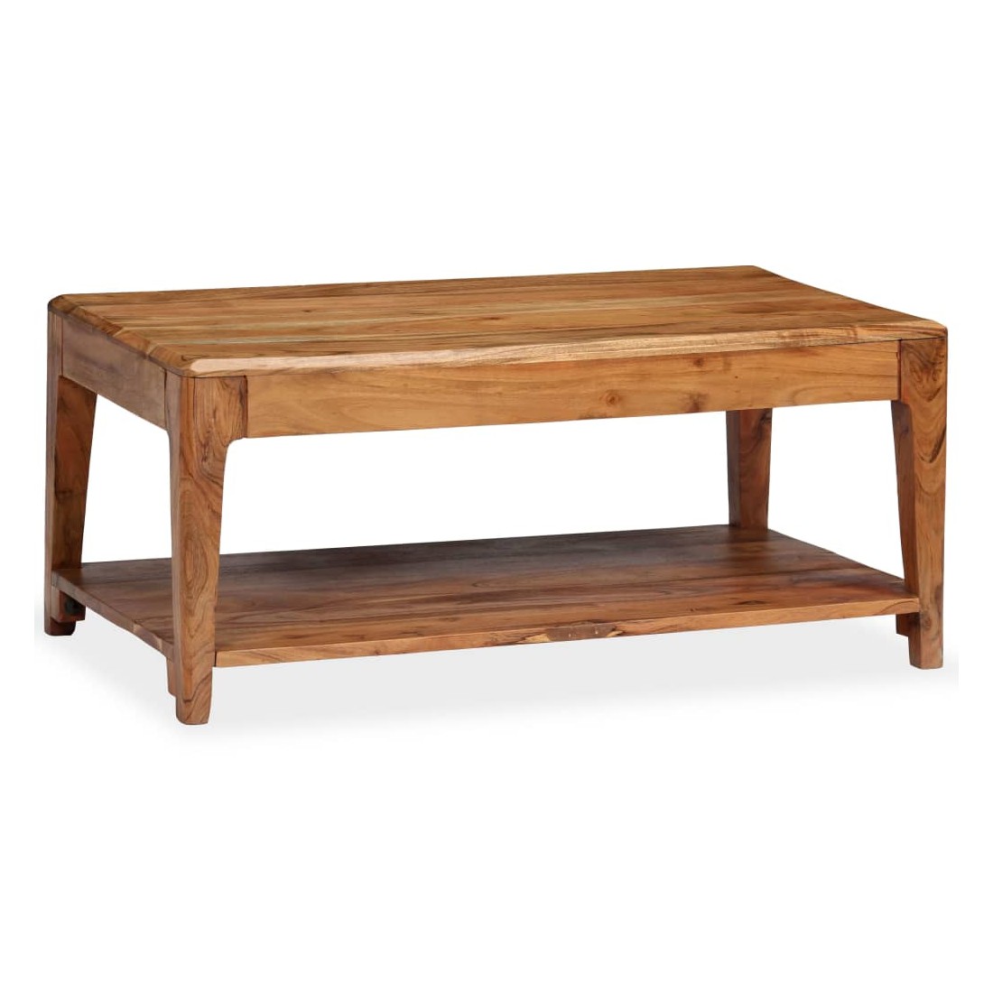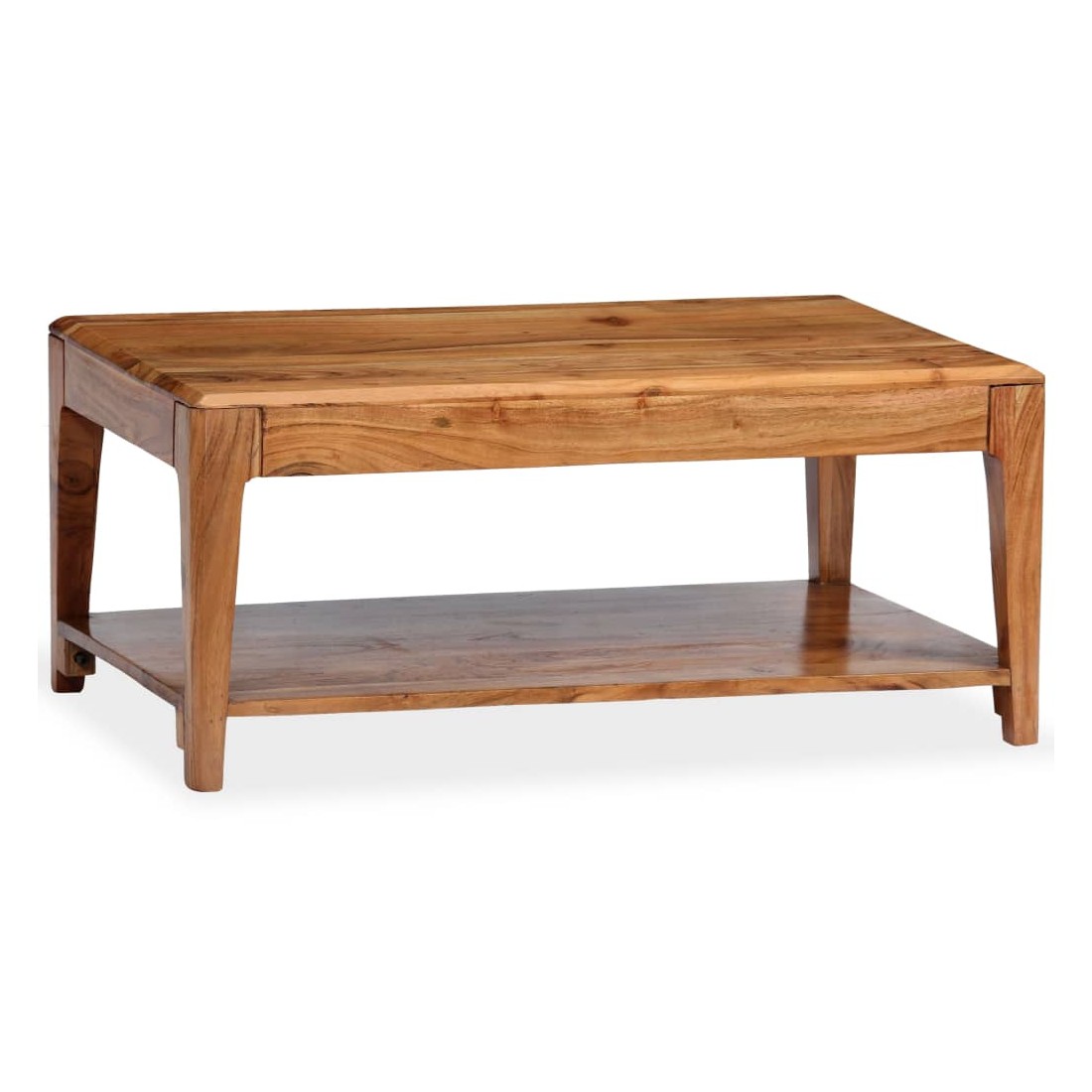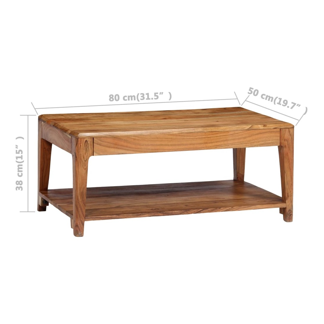 Cette table basse en bois dégage un charme rustique et sera un excellent supplément à votre intérieur. La table basse est faite de bois d'acacia solide qui a reçu une belle finition par polissage, peinture et laquage, pour lui donner un aspect raffiné. Cette table est entièrement faite à la main et les beaux grains de bois rendent chaque meuble unique et légèrement différent l'un de l'autre. Cette table d'appoint a une surface solide et stable sur laquelle vous pouvez placer vos boissons, aliments, paniers de fruits ou objets décoratifs. Cette table basse est équipée d'une étagère qui offre suffisamment d'espace pour garder vos magazines, livres, télécommandes et d'autres petits objets à portée de main. L'assemblage est facile. Remarque importante : les couleurs varient d'une pièce à l