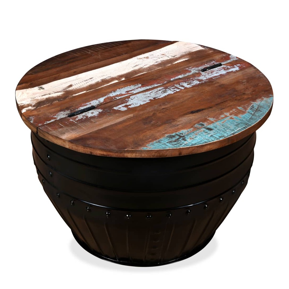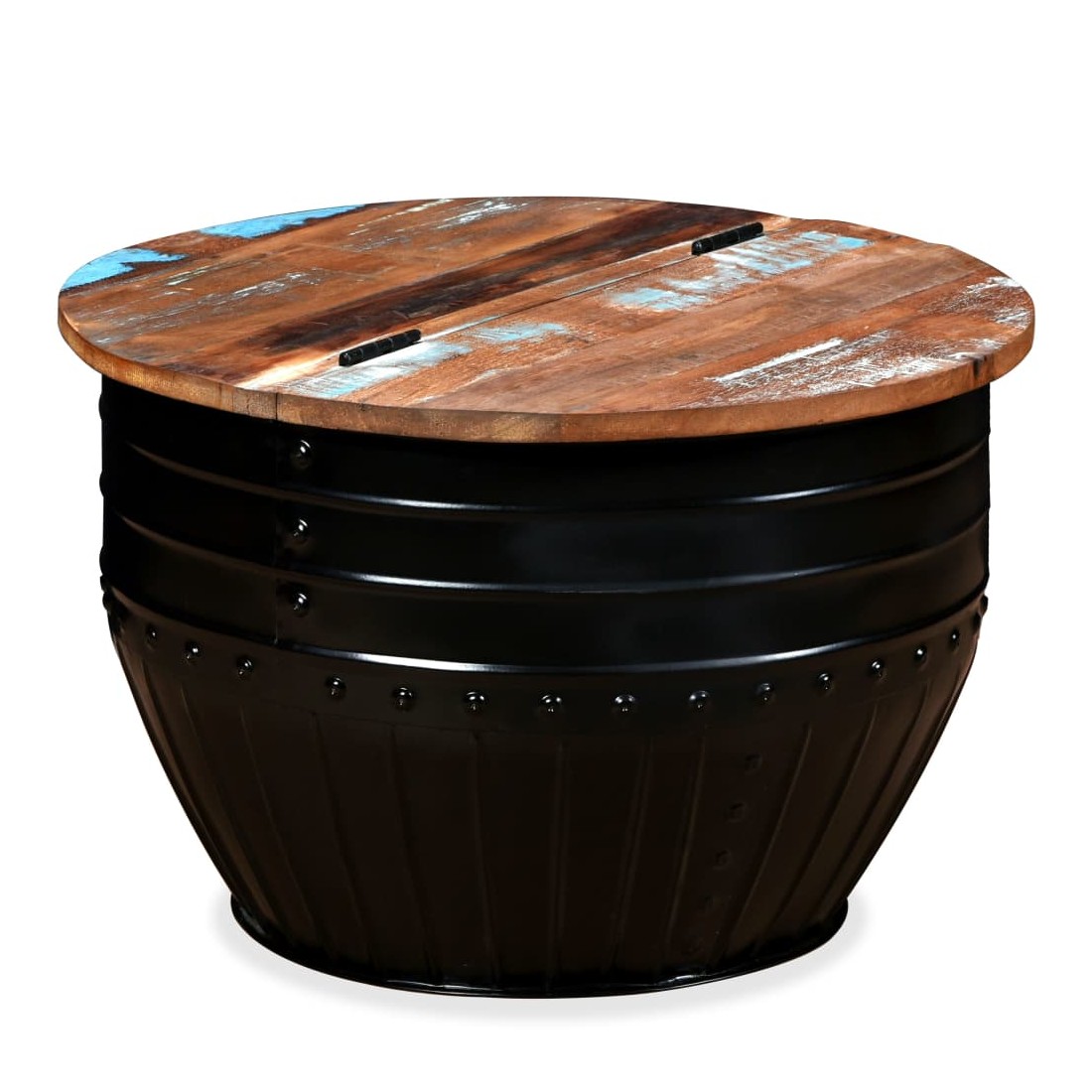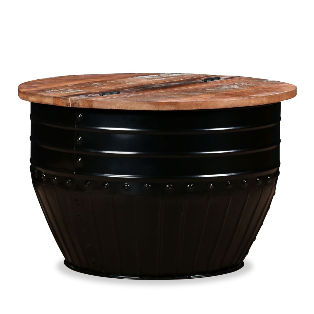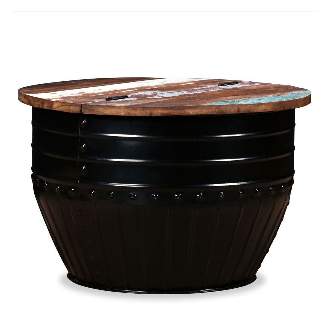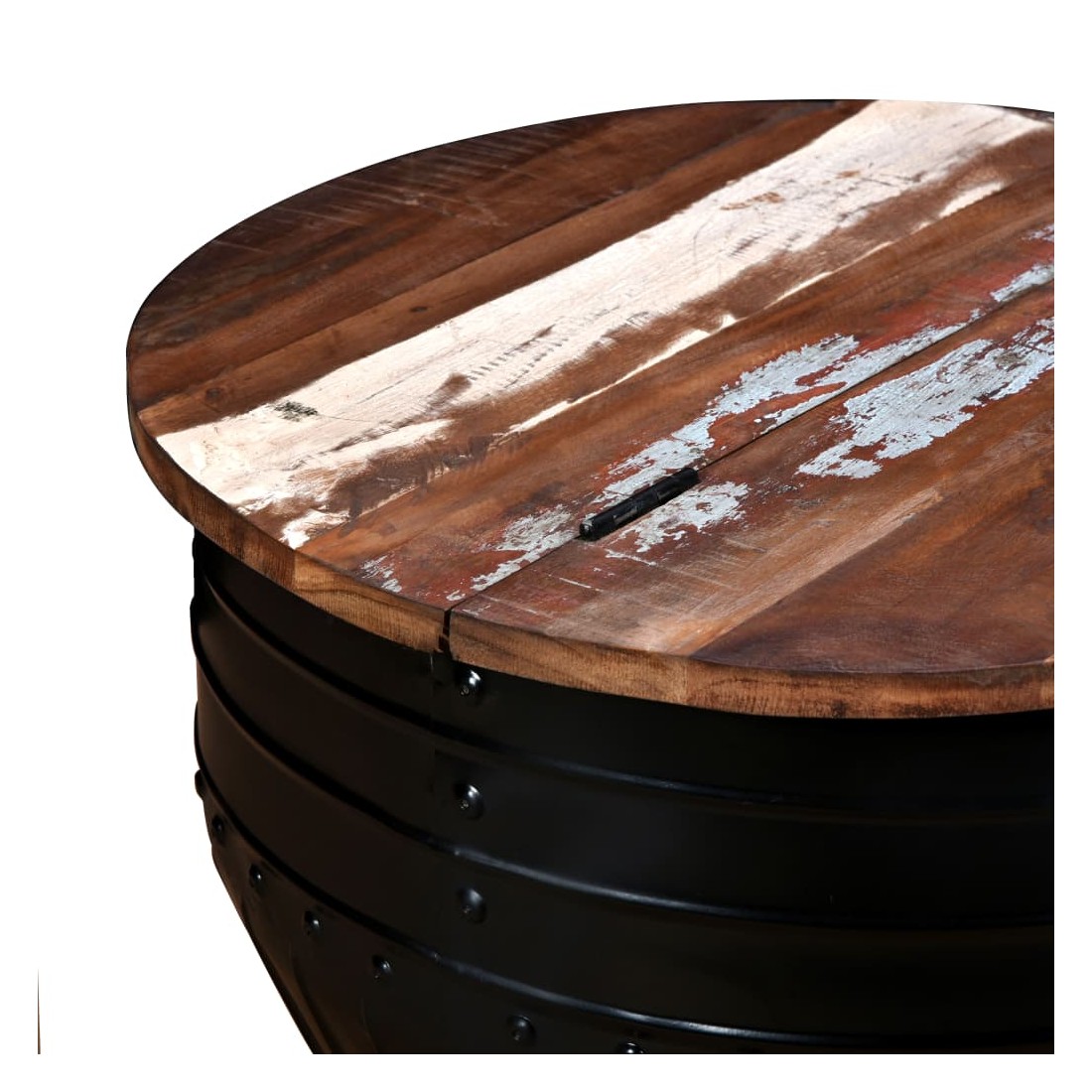 Cette table basse industrielle unique en bois sera un supplément intemporel à votre maison. La base unique en forme de baril confère à la table un style industriel. Cette table de canapé est dotée d'un dessus de table en bois massif, idéal pour poser des verres, des vases, des fruits ou des bibelots, tandis que le compartiment de rangement dissimulé sous le dessus de table offre un espace supplémentaire pour éviter l'encombrement. Le dessus de table est en bois de récupération massif, ce qui signifie que chaque table est unique et légèrement différente l'une de l'autre, et présente les caractéristiques de divers bois comme le teck, l'acacia, le bois de manguier, etc. Le bois de récupération est solide, stable, durable et beau. La table basse a subi un processus élaboré de polissage, de peinture et de laquage. Détendez-vous et divertissez votre famille et vos amis autour de cette table basse unique ! Remarque : Les tables basses sont déjà assemblées ; aucun assemblage n'est requis. Les couleurs des dessus de table peuvent varier d'une pièce à l'autre, ce qui rend chacune de nos tables basses unique ; les tables fournies sont aléatoires à la livraison.
