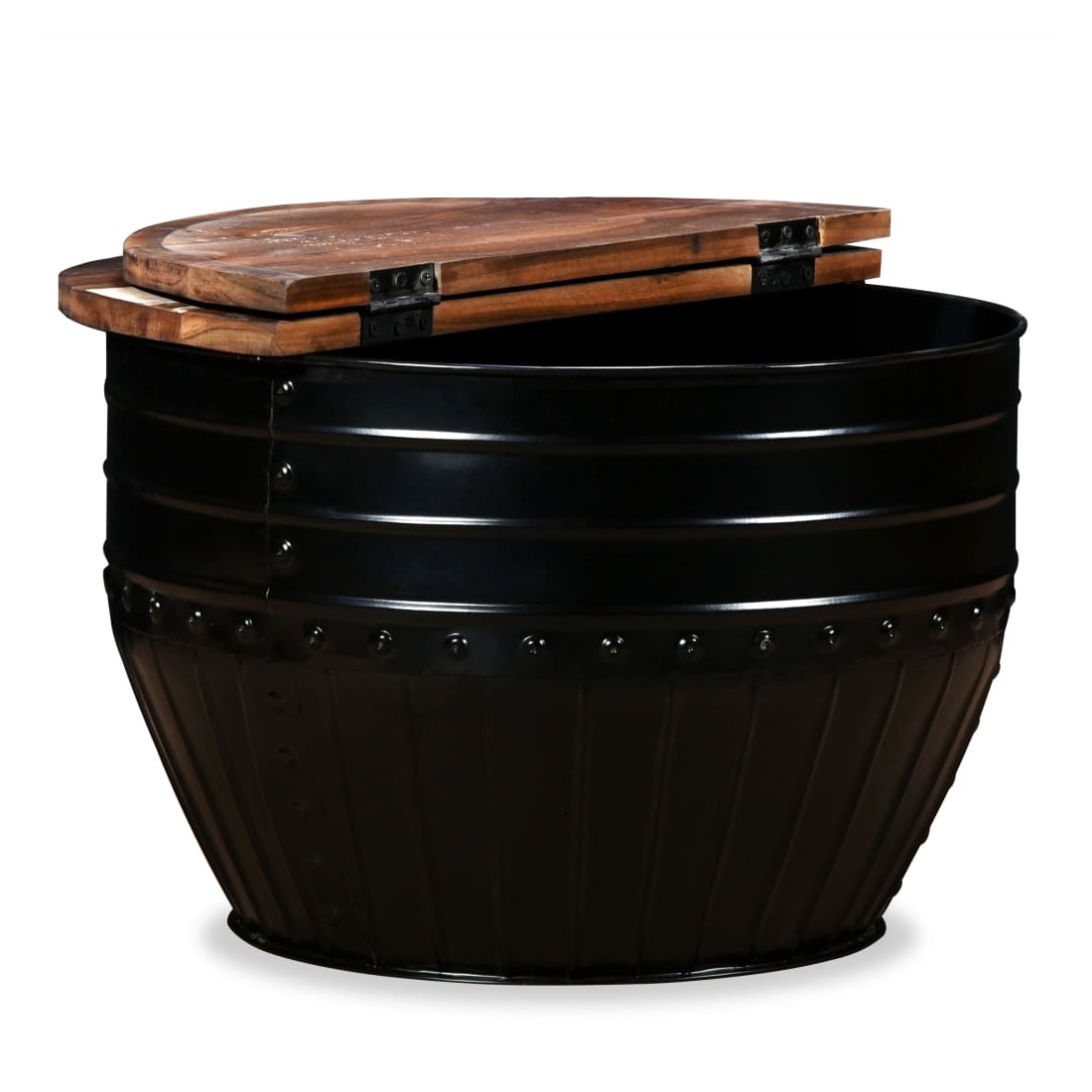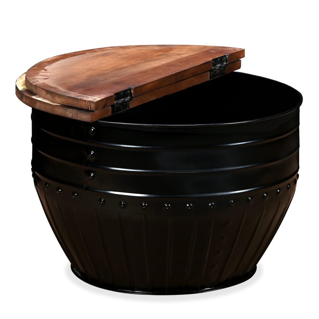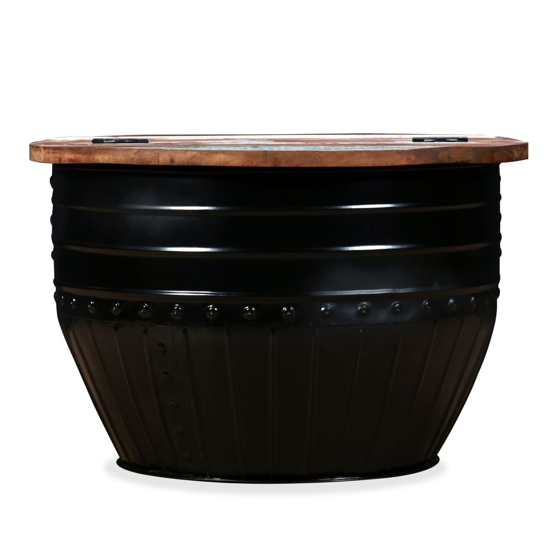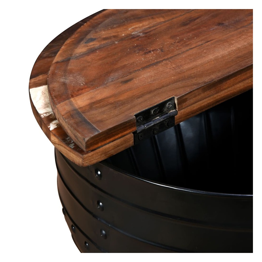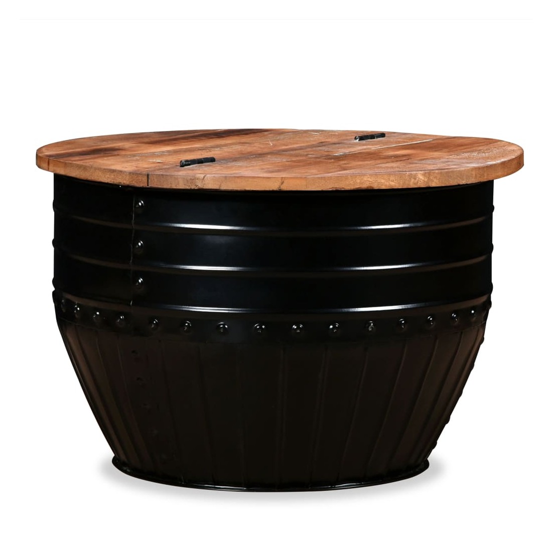 Cette table basse industrielle unique en bois sera un supplément intemporel à votre maison. La base unique en forme de baril confère à la table un style industriel. Cette table de canapé est dotée d'un dessus de table en bois massif, idéal pour poser des verres, des vases, des fruits ou des bibelots, tandis que le compartiment de rangement dissimulé sous le dessus de table offre un espace supplémentaire pour éviter l'encombrement. Le dessus de table est en bois de récupération massif, ce qui signifie que chaque table est unique et légèrement différente l'une de l'autre, et présente les caractéristiques de divers bois comme le teck, l'acacia, le bois de manguier, etc. Le bois de récupération est solide, stable, durable et beau. La table basse a subi un processus élaboré de polissage, de peinture et de laquage. Détendez-vous et divertissez votre famille et vos amis autour de cette table basse unique ! Remarque : Les tables basses sont déjà assemblées ; aucun assemblage n'est requis. Les couleurs des dessus de table peuvent varier d'une pièce à l'autre, ce qui rend chacune de nos tables basses unique ; les tables fournies sont aléatoires à la livraison.
