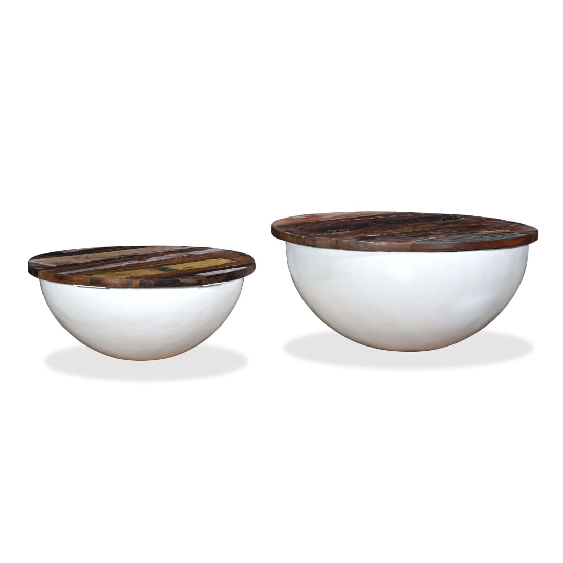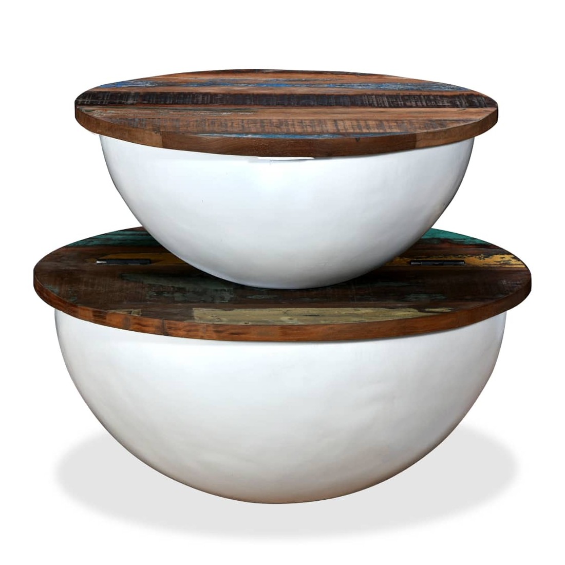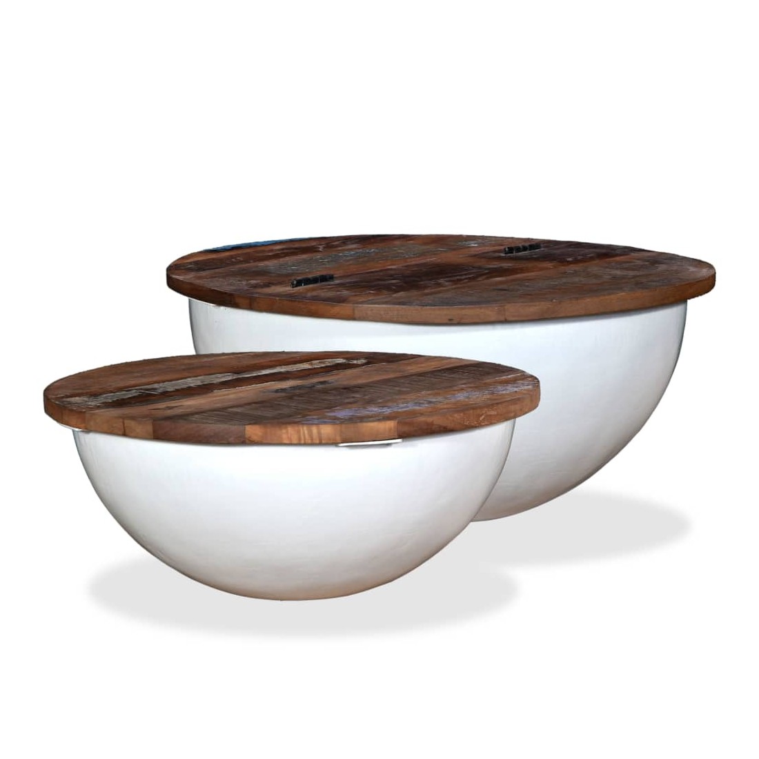Cet ensemble se compose de 2 tables basses élégantes en bois avec un design industriel unique et ajoutera de la distinction à votre maison. La base exclusive en acier en forme de bol donne à chaque table son caractère industriel. Chaque table est dotée d'un dessus de table en bois massif, idéal pour poser des aliments et des boissons, des objets décoratifs, des livres, etc., tandis que le compartiment de rangement dissimulé offre un espace supplémentaire pour éviter l'encombrement. Le dessus de table est en bois de récupération massif, ce qui signifie que chaque table est unique et légèrement différente l'une de l'autre et présente les caractéristiques de divers bois comme le teck, l'acacia, le bois de manguier, etc. Le bois de récupération est solide, stable, durable et beau. La table basse a subi un processus élaboré de polissage, de peinture et de laquage. Détendez-vous et divertissez votre famille et vos amis autour de cet ensemble de table basse unique ! La livraison comprend 2 tables basses. Remarque : Les tables basses sont déjà assemblées ; aucun assemblage n'est requis. Les couleurs des dessus de table peuvent varier d'une pièce à l'autre, ce qui rend chacune de nos tables basses unique. La livraison est aléatoire, ce qui garantit l'exclusivité et l'individualité de votre produit.