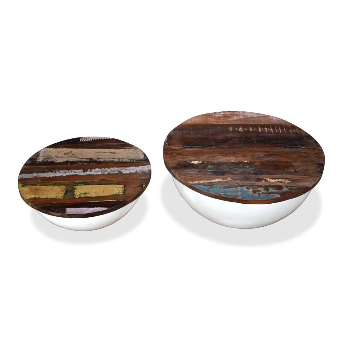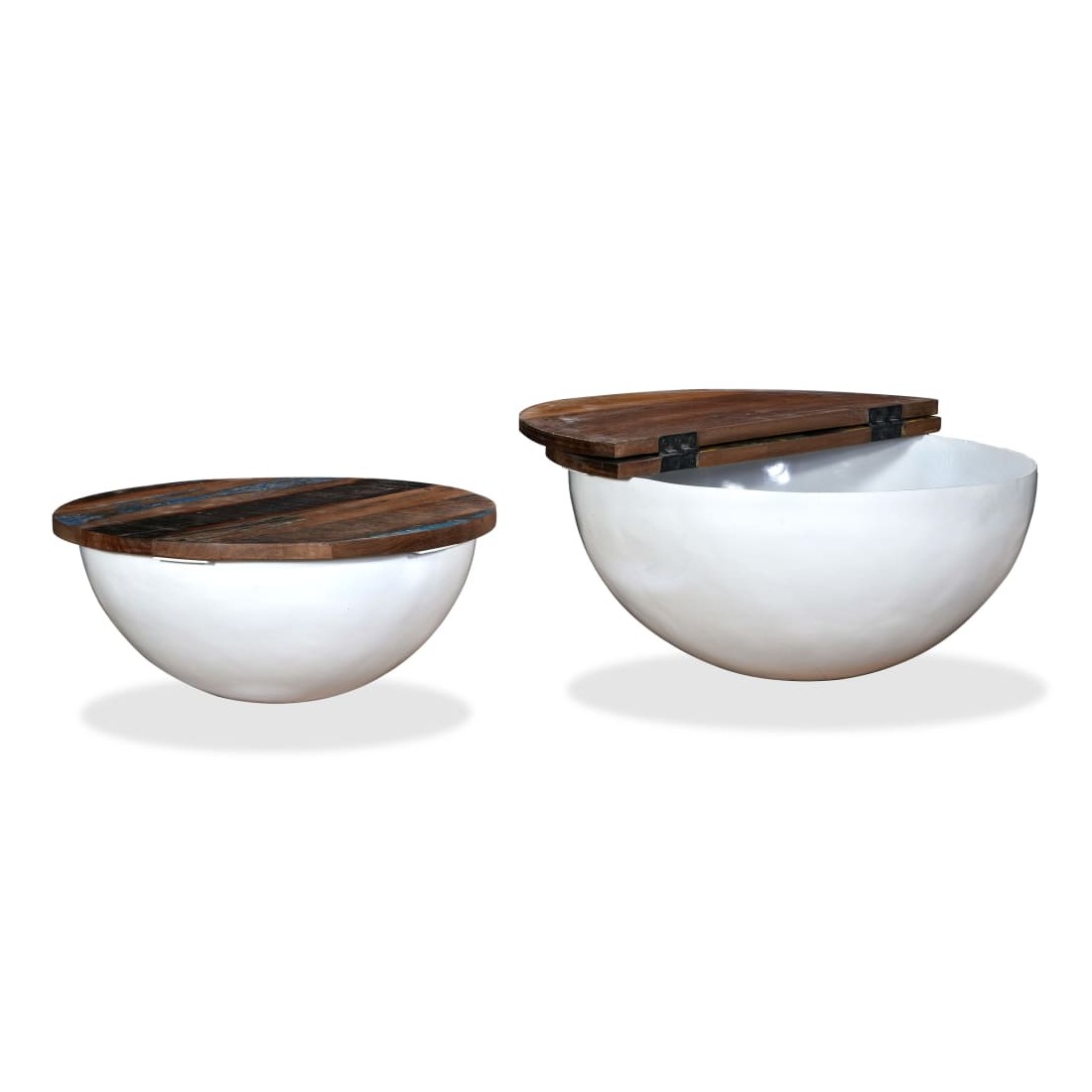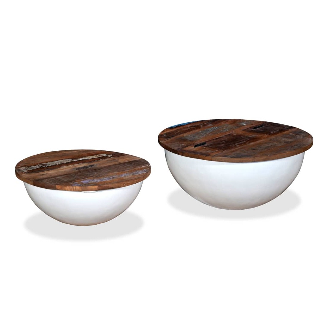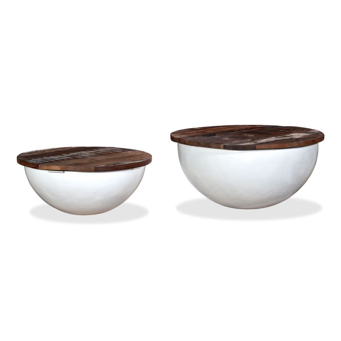 Cet ensemble se compose de 2 tables basses élégantes en bois avec un design industriel unique et ajoutera de la distinction à votre maison. La base exclusive en acier en forme de bol donne à chaque table son caractère industriel. Chaque table est dotée d'un dessus de table en bois massif, idéal pour poser des aliments et des boissons, des objets décoratifs, des livres, etc., tandis que le compartiment de rangement dissimulé offre un espace supplémentaire pour éviter l'encombrement. Le dessus de table est en bois de récupération massif, ce qui signifie que chaque table est unique et légèrement différente l'une de l'autre et présente les caractéristiques de divers bois comme le teck, l'acacia, le bois de manguier, etc. Le bois de récupération est solide, stable, durable et beau. La table basse a subi un processus élaboré de polissage, de peinture et de laquage. Détendez-vous et divertissez votre famille et vos amis autour de cet ensemble de table basse unique ! La livraison comprend 2 tables basses. Remarque : Les tables basses sont déjà assemblées ; aucun assemblage n'est requis. Les couleurs des dessus de table peuvent varier d'une pièce à l'autre, ce qui rend chacune de nos tables basses unique. La livraison est aléatoire, ce qui garantit l'exclusivité et l'individualité de votre produit.