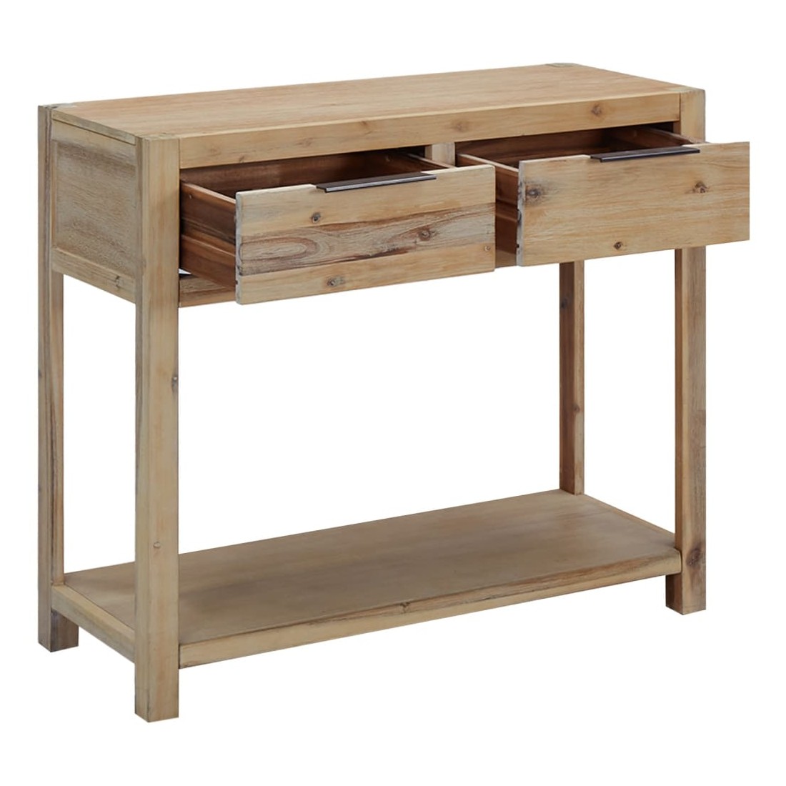 Cette table console ajoutera une touche de charme rustique à votre intérieur. Cette table console est faite de bois d'acacia massif avec une finition brossée, de MDF et de placage d'acacia, ce qui la rend robuste et stable. La table console a un dessus robuste, sur lequel vous pouvez placer des objets décoratifs comme des corbeilles de fruits ou des vases. La tablette et les 2 tiroirs offrent suffisamment d'espace pour garder tous les types d'articles plus petits organisés et à portée de main. Ce produit doit être assemblé.