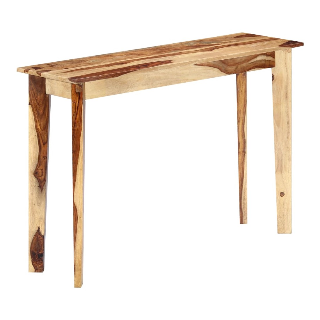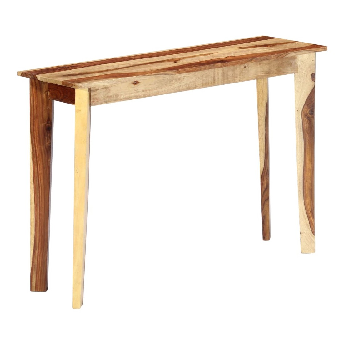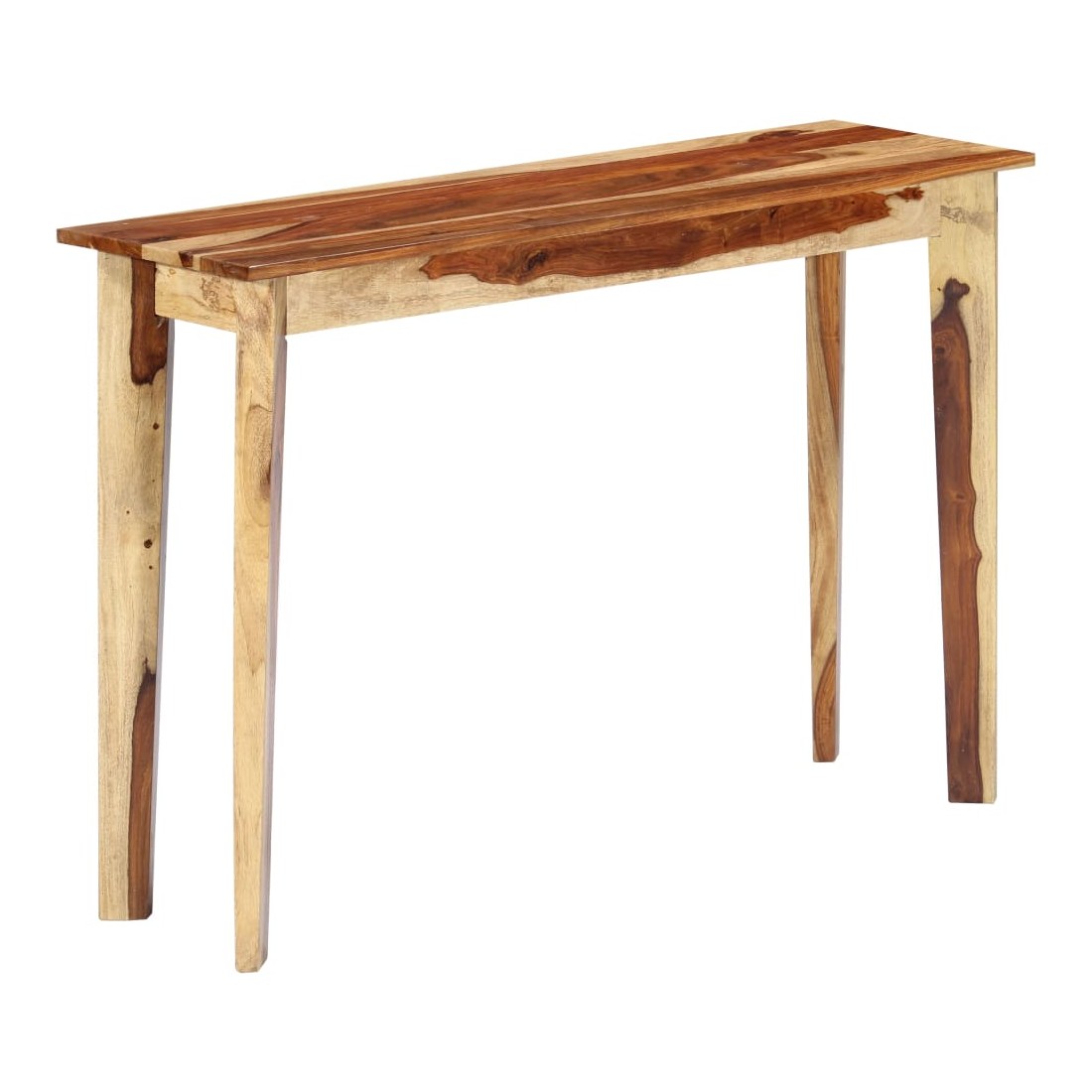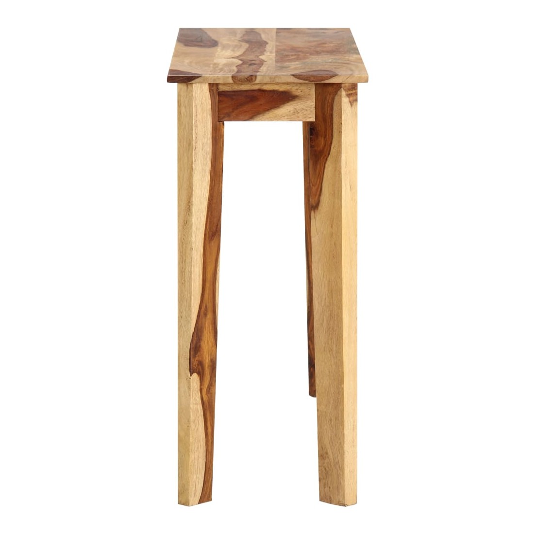 Cette table console en bois de Sesham solide apportera une touche pratique et intemporelle à votre décoration intérieure. La table est faite de bois massif de Sesham et le savoir-faire artisanal exquis et les magnifiques grains de bois rendent chaque meuble unique et légèrement différent l'un de l'autre. Le Sesham est un bois dur tropical qui est célèbre pour ses grains riches, aussi connu sous le nom de bois de rose ou palissandre. Cette table d'appoint a un dessus de table robuste, sur lequel vous pouvez placer des objets décoratifs comme des corbeilles de fruits ou des vases. De plus, les solides pieds en bois contribuent à la robustesse de la construction. Ce produit est facile à assembler. Remarque importante : Les couleurs varient d'une pièce à une autre, rendant chacune d'elle unique ; la livraison est aléatoire.