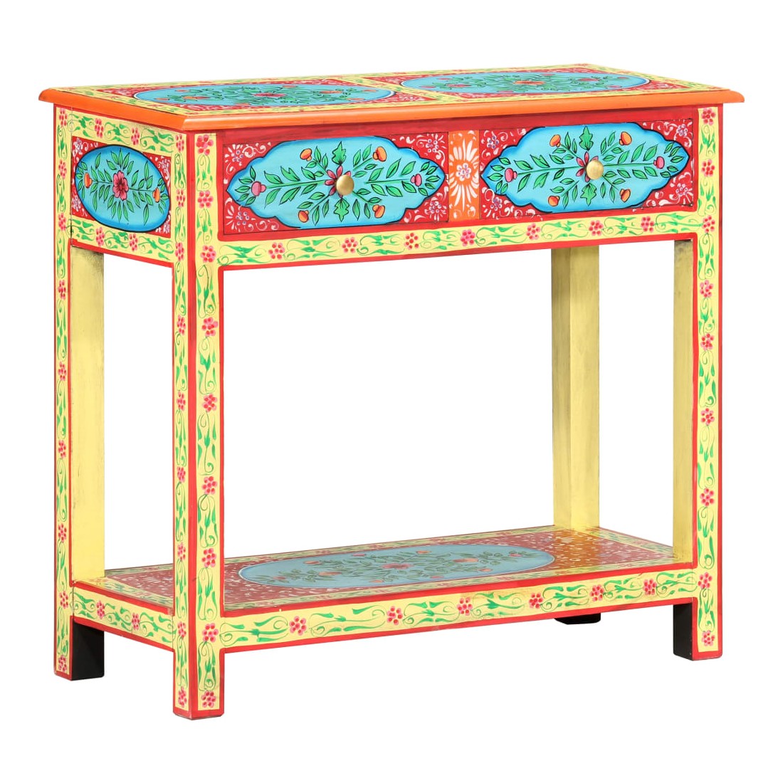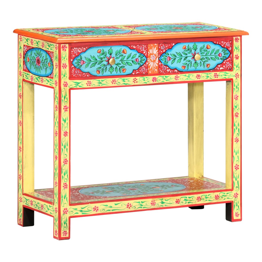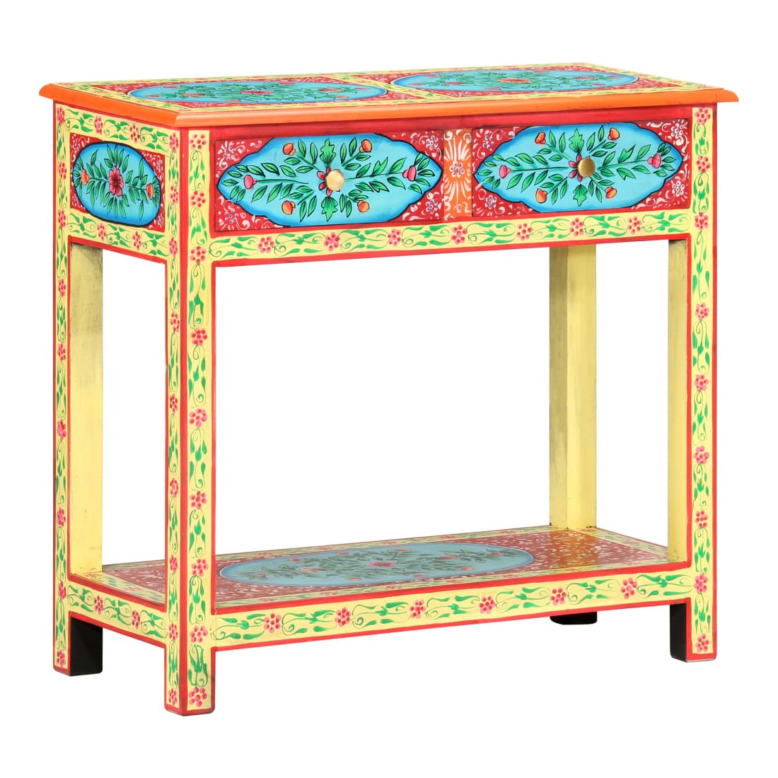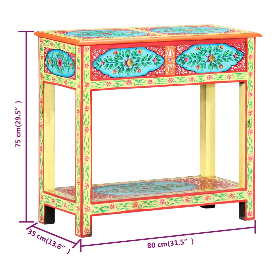 Cette table console unique et magnifique ajoutera une touche de couleur et sera un accessoire attrayant à votre décor intérieur. Avec son design saisissant, cette table console peinte à la main sera un véritable sujet de conversation lorsque vous inviterez des amis. La table est faite à la main en bois de manguier et MDF qui est à la fois durable et beau et l'artisanat s'ajoute à son spectaculaire style rétro. La table présente de riches détails décoratifs peints à la main qui exhalent une touche d'élégance et soulignent l'aspect raffiné. Les boutons distinctifs facilitent l'ouverture des tiroirs et rehaussent le style de la table. La table console a 2 tiroirs et 1 étagère, et offre amplement d'espace pour garder vos essentiels bien organisés. Le dessus coloré est idéal pour afficher des objets décoratifs, comme des vases, des albums photo, des paniers de fruits, etc. Cet article est facile à assembler.