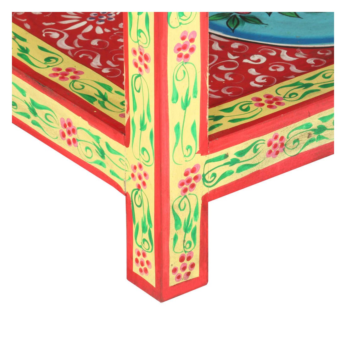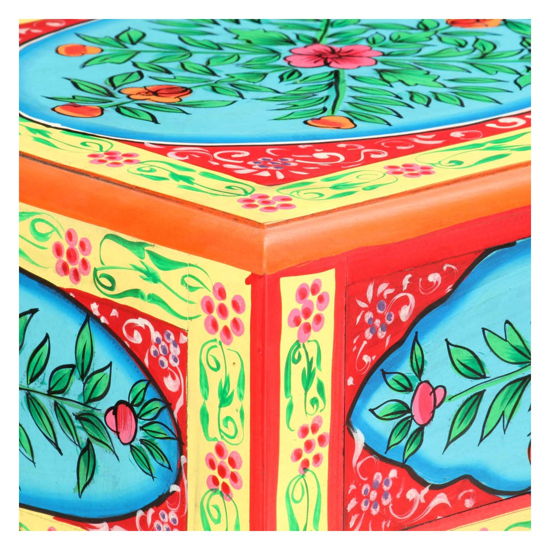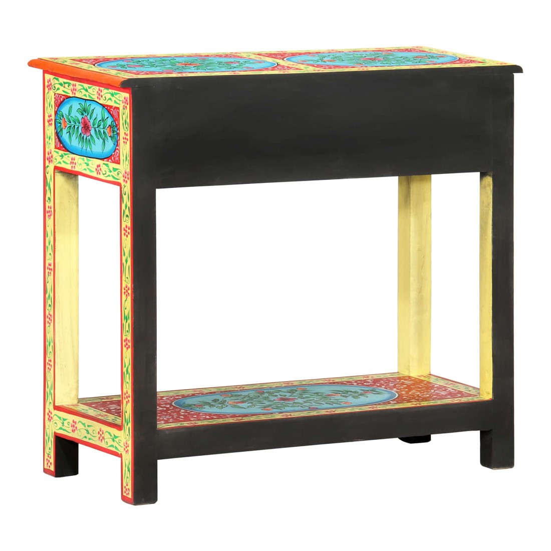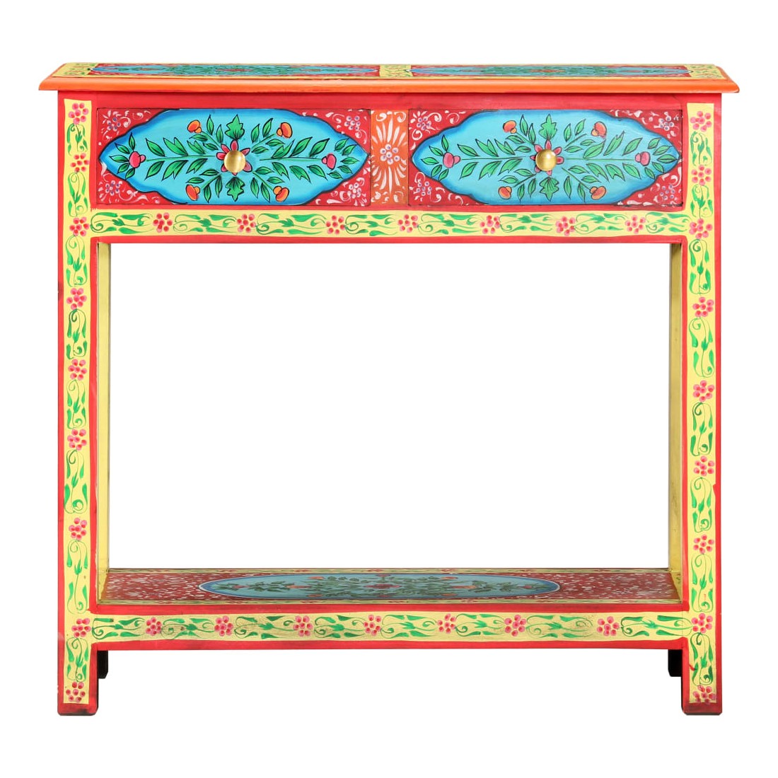 Cette table console unique et magnifique ajoutera une touche de couleur et sera un accessoire attrayant à votre décor intérieur. Avec son design saisissant, cette table console peinte à la main sera un véritable sujet de conversation lorsque vous inviterez des amis. La table est faite à la main en bois de manguier et MDF qui est à la fois durable et beau et l'artisanat s'ajoute à son spectaculaire style rétro. La table présente de riches détails décoratifs peints à la main qui exhalent une touche d'élégance et soulignent l'aspect raffiné. Les boutons distinctifs facilitent l'ouverture des tiroirs et rehaussent le style de la table. La table console a 2 tiroirs et 1 étagère, et offre amplement d'espace pour garder vos essentiels bien organisés. Le dessus coloré est idéal pour afficher des objets décoratifs, comme des vases, des albums photo, des paniers de fruits, etc. Cet article est facile à assembler.